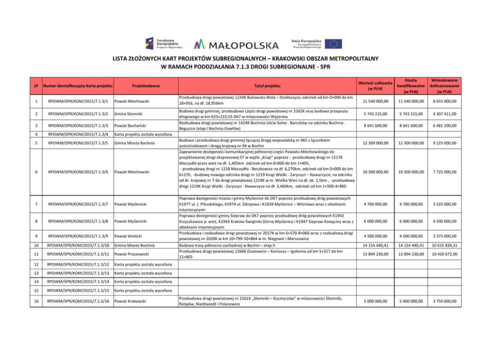 LISTA ZŁOŻONYCH KART PROJEKTÓW SUBREGIONALNYCH – KRAKOWSKI OBSZAR METROPOLITALNY W RAMACH PODDZIAŁANIA 7.1.3 DROGI SUBREGIONALNE - SPR LP Numer identyfikacyjny Karty projektu Projektodawca 1 RPOWM/SPR/KOM/2015/7.1.3/1 Powiat Miechowski 2 RPOWM/SPR/KOM/2015/7.1.3/2 Gmina Słomniki 3 RPOWM/SPR/KOM/2015/7.1.3/3 Powiat Bocheński 4 RPOWM/SPR/KOM/2015/7.1.3/4 Karta projektu została wycofana 5 RPOWM/SPR/KOM/2015/7.1.3/5 Gmina Miasta Bochnia 6 RPOWM/SPR/KOM/2015/7.1.3/6 Powiat Miechowski 7 RPOWM/SPR/KOM/2015/7.1.3/7 Powiat Myślenicki 8 RPOWM/SPR/KOM/2015/7.1.3/8 Powiat Myślenicki 9 RPOWM/SPR/KOM/2015/7.1.3/9 Powiat Wielicki 10 RPOWM/SPR/KOM/2015/7.1.3/10 Gmina Miasta Bochnia 11 RPOWM/SPR/KOM/2015/7.1.3/11 Powiat Proszowicki 12 RPOWM/SPR/KOM/2015/7.1.3/12 Karta projektu została wycofana 13 RPOWM/SPR/KOM/2015/7.1.3/13 Karta projektu została wycofana 14 RPOWM/SPR/KOM/2015/7.1.3/14 Karta projektu została wycofana 15 RPOWM/SPR/KOM/2015/7.1.3/15 Karta projektu została wycofana 16 RPOWM/SPR/KOM/2015/7.1.3/16 Powiat Krakowski Tytuł projektu Przebudowa drogi powiatowej 1224K Bukowska Wola – Działoszyce, odcinek od km 0+000 do km 18+956, na dł. 18,956km Budowa drogi gminnej, przebudowa części drogi powiatowej nr 2162K oraz budowa przepustu drogowego w km 633+233,55 DK7 w miejscowości Wężerów Rozbudowa drogi powiatowej nr 1424K Bochnia-Uście Solne - Barczków na odcinku BochniaBogucice (etap I Bochnia-Gawłów) Budowa i przebudowa drogi gminnej łączącej drogę wojewódzką nr 965 z łącznikiem autostradowym i drogą krajową nr 94 w Bochni Zapewnienie dostępności komunikacyjnej północnej części Powiatu Miechowskiego do projektowanej drogi ekspresowej S7 w węźle „Książ” poprzez : -przebudowę drogi nr 1217K Moczydło przez wieś na dł. 1,405km odcinek od km 0+000 do km 1+405, - przebudowę drogi nr 1218 Moczydło - Boczkowice na dł. 6,270km, odcinek od km 0+000 do km 6+270, -budowę nowego odcinka drogi nr 1219 Książ Wielki - Zaryszyn – Nawarzycie, na odcinku od dr. krajowej nr 7 do drogi powiatowej 1219K w m. Wielka Wieś na dł. ok. 1,5km , - przebudowę drogi 1219K Książ Wielki - Zaryszyn - Nawarzyce na dł. 3,460km, odcinek od km 1+500-4+960 Poprawa dostępności miasta i gminy Myślenice do DK7 poprzez przebudowę dróg powiatowych K1977 ul. J. Piłsudskiego, K1974 ul. Zdrojowa i K1928 Myślenice – Wiśniowa wraz z obiektami inżynieryjnymi Poprawa dostępności gminy Siepraw do DK7 poprzez przebudowę dróg powiatowych K1942 Krzyszkowice p. wieś, K1943 Kraków-Świątniki Górne-Myślenice i K1947 Siepraw-Kawęciny wraz z obiektami inżynieryjnymi Przebudowa i rozbudowa drogi powiatowej nr 2017K w km 6+570-8+060 wraz z rozbudową drogi powiatowej nr 2020K w km 10+799-10+864 w m. Niegowić i Marszowice Budowa trasy północno-zachodniej w Bochni – etap II Przebudowa drogi powiatowej 1266K Gnatowice – Koniusza – Igołomia od km 5+317 do km 12+805 Przebudowa drogi powiatowej nr 2161K „Słomniki – Kocmyrzów” w miejscowości Słomniki, Ratajów, Niedźwiedź i Polanowice Wartość całkowita (w PLN) Koszty kwalifikowalne (w PLN) Wnioskowane dofinansowanie (w PLN) 11 540 000,00 11 540 000,00 8 655 000,00 5 743 215,00 5 743 215,00 4 307 411,00 8 641 600,00 8 641 600,00 6 481 200,00 12 300 000,00 12 300 000,00 9 225 000,00 10 300 000,00 10 300 000,00 7 725 000,00 4 700 000,00 4 700 000,00 3 525 000,00 6 000 000,00 6 000 000,00 4 500 000,00 4 500 000,00 4 500 000,00 3 375 000,00 14 154 440,41 14 154 440,41 10 615 830,31 13 894 230,00 13 894 230,00 10 420 672,00 5 000 000,00 5 000 000,00 3 750 000,00 17 RPOWM/SPR/KOM/2015/7.1.3/17 Powiat Krakowski 18 RPOWM/SPR/KOM/2015/7.1.3/18 Powiat Krakowski 19 RPOWM/SPR/KOM/2015/7.1.3/19 Powiat Krakowski 20 RPOWM/SPR/KOM/2015/7.1.3/20 Gmina Bochnia Przebudowa drogi powiatowej nr 2188K Krzeszowice - Tenczynek – Rudno wraz z budową jej nowego odcinka do drogi krajowej nr 79 Przebudowa drogi powiatowej nr 2145K „Poskwitów - Niedźwiedź” w miejscowości Zaborze, Ratajów i Niedźwiedź Przebudowa drogi powiatowej nr 2141K „Przestańsko – Kacice - Słomniki” w miejscowościach Prandocin, Prandocin Wysiołek, Januszowice, Kacice Budowa dróg dojazdowych do terenów inwestycyjnych w miejscowości Bogucice suma 7 617 000,00 7 617 000,00 5 712 750,00 2 500 000,00 2 500 000,00 1 875 000,00 4 344 100,00 4 344 100,00 3 258 075,00 4 141 680,00 4 141 680,00 3 106 260,00 115 376 265,41 115 376 265,41 86 532 198,31