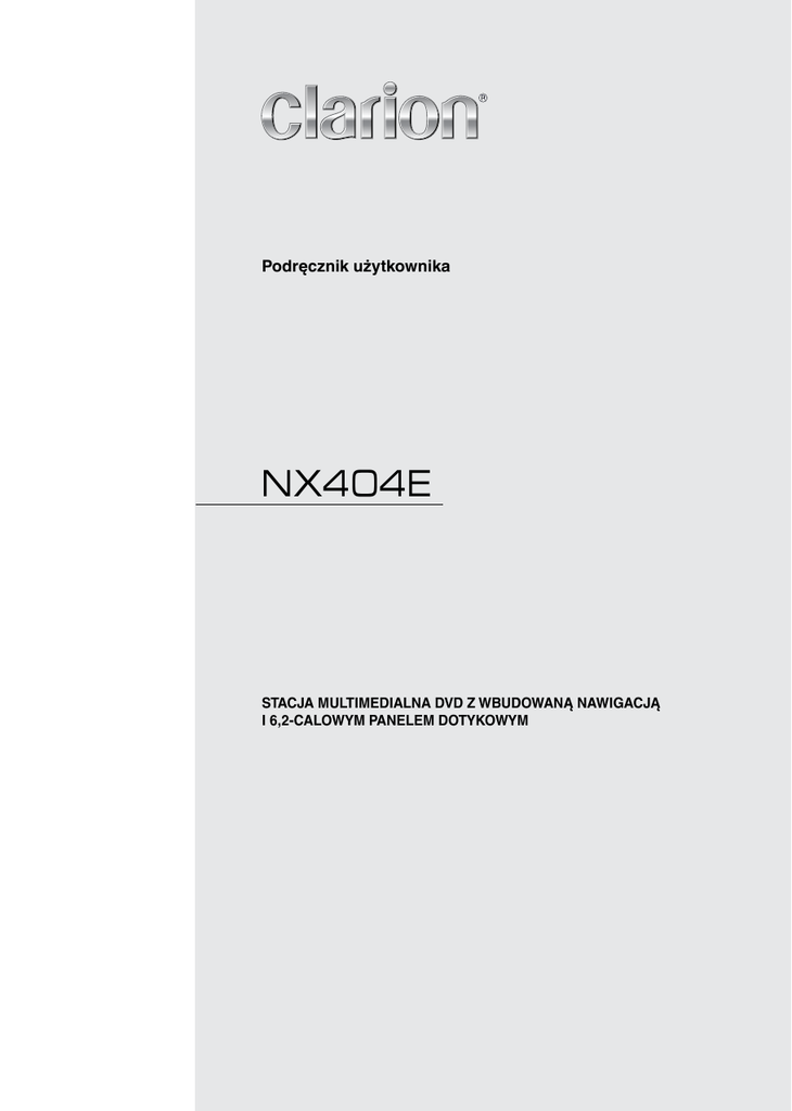 Podręcznik użytkownika NX404E STACJA MULTIMEDIALNA DVD Z WBUDOWANĄ NAWIGACJĄ I 6,2-CALOWYM PANELEM DOTYKOWYM o P lski Polski PRZESTROGI: Podręcznik użytkownika Urządzenie wyposażono w system laserowy. W przypadku jakichkolwiek problemów z tym odtwarzaczem należy skontaktować się z najbliższym AUTORYZOWANYM punktem serwisowym. Aby zapobiec bezpośredniemu kontaktowi z wiązką laserową, nie należy otwierać obudowy. PRZESTROGI: UŻYWANIE PRZYCISKÓW STERUJĄCYCH, WPROWADZANIE ZMIAN W KONFIGURACJI LUB WYKONYWANIE PROCEDUR W SPOSÓB INNY NIŻ OPISANY W TYM PODRĘCZNIKU MOŻE NARAZIĆ UŻYTKOWNIKA NA SZKODLIWE PROMIENIOWANIE. NX404E 1 Zawartość Polski Polski Podręcznik użytkownika 2 1. FUNKCJE..............................................................................................................4 Rozbudowa systemów............................................................................................4 2. ŚRODKI OSTROŻNOŚCI......................................................................................5 3. PRZESTROGI ZWIĄZANE Z OBSŁUGĄ..............................................................7 Panel obsługi..........................................................................................................7 Port USB................................................................................................................7 Czyszczenie...........................................................................................................7 Obchodzenie się z płytami.....................................................................................8 4. PANEL OBSŁUGI................................................................................................10 Funkcje przycisków..............................................................................................10 5. OPCJONALNY PILOT.........................................................................................11 Funkcja pilota ......................................................................................................12 6. MENU GŁÓWNE.................................................................................................14 7. OBSŁUGA ODTWARZACZA DVD VIDEO..........................................................15 Płyty.....................................................................................................................15 Zmiana ustawień systemu DVD............................................................................16 Odtwarzanie płyty.................................................................................................16 Obsługa menu odtwarzacza DVD.........................................................................17 Obsługa menu odtwarzacza plików wideo............................................................19 Przełączanie napisów...........................................................................................19 Lista plików wideo................................................................................................20 Odtwarzanie pliku wideo na żądanie w formacie DivX..........................................20 Formaty plików wideo odtwarzanych z płyt...........................................................20 8. OBSŁUGA ODTWARZACZA CD........................................................................21 Słuchanie/wysuwanie płyty..................................................................................21 Wyświetlenie ekranu w trybie odtwarzacza CD....................................................21 Obsługa menu odtwarzacza CD...........................................................................21 Odtwarzanie skompresowanych plików audio......................................................22 Funkcja wyświetlania znaczników........................................................................22 9. OBSŁUGA TRYBU USB AUDIO.........................................................................24 Uwagi dotyczące korzystania z pamięci USB.......................................................24 Wybór trybu USB Audio.......................................................................................24 Odtwarzanie plików audio z pamięci USB............................................................25 Uwagi dotyczące korzystania z pamięci USB.......................................................26 Wybieranie trybu USB Video................................................................................26 Odtwarzanie plików wideo z pamięci USB............................................................26 Odtwarzane formaty plików wideo........................................................................26 10. OBSŁUGA TRYBU USB VIDEO........................................................................26 11. OBSŁUGA iPoda..............................................................................................28 Uwagi dotyczące korzystania z odtwarzaczy iPod/telefonów iPhone firmy Apple...... 28 Informacje o znacznikach standardu ID3 w trybie iPod Audio..............................28 Ekran z listą odtwarzania w trybie odtwarzacza iPod Audio..................................29 Obsługa menu w trybie iPod Video.......................................................................31 Ekran w trybie iPod Video ID3..............................................................................31 Ekran z listą w trybie iPod Video...........................................................................31 Ekran w trybie prostego sterowania iPod Video....................................................32 Ekran odtwarzania w trybie iPod Video.................................................................32 Tryb iPod Audio Bluetooth....................................................................................32 12. OBSŁUGA ODTWARZACZA AUDIO Bluetooth®..............................................33 Wybieranie 