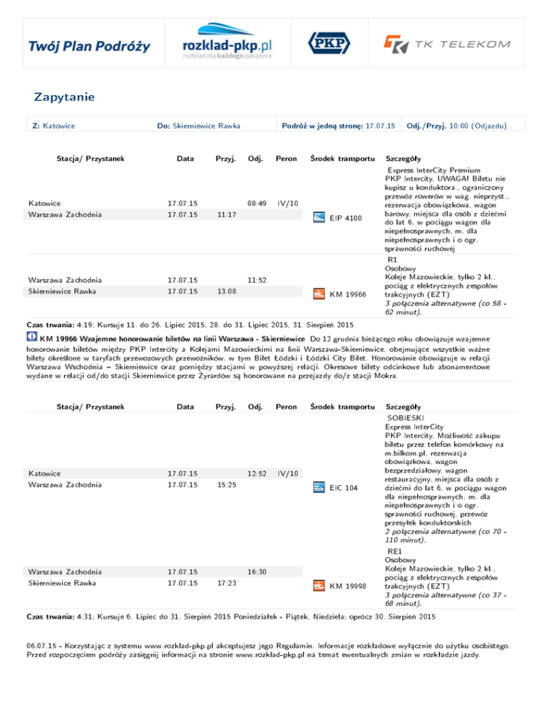 Zapytanie Z: Katowice Do: Stacja/ Przystanek Skierniewice Rawka Data Katowice Warszawa Zachodnia 17.07.15 17.07.15 Warszawa Zachodnia Skierniewice Rawka 17.07.15 17.07.15 Przyj. Podró» w jedn¡ stron¦: Odj. 08:49 Peron 17.07.15 rodek transportu IV/10 11:17 EIP 4100 11:52 13:08 KM 19966 Odj./Przyj. 10:00 (Odjazdu) Szczegóªy Express InterCity Premium PKP Intercity, UWAGA! Biletu nie kupisz u konduktora., ograniczony przewóz rowerów w wag. nieprzyst., rezerwacja obowi¡zkowa, wagon barowy, miejsca dla osób z dzie¢mi do lat 6, w poci¡gu wagon dla niepeªnosprawnych, m. dla niepeªnosprawnych i o ogr. sprawno±ci ruchowej R1 Osobowy Koleje Mazowieckie, tylko 2 kl., poci¡g z elektrycznych zespoªów trakcyjnych (EZT) 3 poª¡czenia alternatywne (co 58 62 minut). Czas trwania: 4:19; Kursuje 11. do 26. Lipiec 2015, 28. do 31. Lipiec 2015, 31. Sierpie« 2015 KM 19966 Wzajemne honorowanie biletów na linii Warszawa - Skierniewice Do 12 grudnia bie»¡cego roku obowi¡zuje wzajemne honorowanie biletów mi¦dzy PKP Intercity a Kolejami Mazowieckimi na linii Warszawa-Skierniewice, obejmuj¡ce wszystkie wa»ne bilety okre±lone w taryfach przewozowych przewo¹ników, w tym Bilet ódzki i ódzki City Bilet. Honorowanie obowi¡zuje w relacji Warszawa Wschodnia Skierniewice oraz pomi¦dzy stacjami w powy»szej relacji. Okresowe bilety odcinkowe lub abonamentowe wydane w relacji od/do stacji Skierniewice przez yrardów s¡ honorowane na przejazdy do/z stacji Mokra. Stacja/ Przystanek Katowice Warszawa Zachodnia Data 17.07.15 17.07.15 Przyj. Odj. 12:52 15:25 Peron rodek transportu IV/10 EIC 104 Szczegóªy SOBIESKI Express InterCity PKP Intercity, Mo»liwo±¢ zakupu biletu przez telefon komórkowy na m.bilkom.pl, rezerwacja obowi¡zkowa, wagon bezprzedziaªowy, wagon restauracyjny, miejsca dla osób z dzie¢mi do lat 6, w poci¡gu wagon dla niepeªnosprawnych, m. dla niepeªnosprawnych i o ogr. sprawno±ci ruchowej, przewóz przesyªek konduktorskich 2 poª¡czenia alternatywne (co 70 110 minut). Warszawa Zachodnia Skierniewice Rawka 17.07.15 17.07.15 16:30 17:23 KM 19998 RE1 Osobowy Koleje Mazowieckie, tylko 2 kl., poci¡g z elektrycznych zespoªów trakcyjnych (EZT) 3 poª¡czenia alternatywne (co 37 68 minut). Czas trwania: 4:31; Kursuje 6. Lipiec do 31. Sierpie« 2015 Poniedziaªek - Pi¡tek, Niedziela; oprócz 30. Sierpie« 2015 06.07.15 - Korzystaj¡c z systemu www.rozklad-pkp.pl akceptujesz jego Regulamin. Informacje rozkªadowe wyª¡cznie do u»ytku osobistego. Przed rozpocz¦ciem podró»y zasi¦gnij informacji na stronie www.rozklad-pkp.pl na temat ewentualnych zmian w rozkªadzie jazdy. Stacja/ Przystanek Data Przyj. Odj. Peron rodek transportu Szczegóªy KM 19998 Wzajemne honorowanie biletów na linii Warszawa - Skierniewice Do 12 grudnia bie»¡cego roku obowi¡zuje wzajemne honorowanie biletów mi¦dzy PKP Intercity a Kolejami Mazowieckimi na linii Warszawa-Skierniewice, obejmuj¡ce wszystkie wa»ne bilety okre±lone w taryfach przewozowych przewo¹ników, w tym Bilet ódzki i ódzki City Bilet. Honorowanie obowi¡zuje w relacji Warszawa Wschodnia Skierniewice oraz pomi¦dzy stacjami w powy»szej relacji. Okresowe bilety odcinkowe lub abonamentowe wydane w relacji od/do stacji Skierniewice przez yrardów s¡ honorowane na przejazdy do/z stacji Mokra. Stacja/ Przystanek Katowice Warszawa Zachodnia Data 17.07.15 17.07.15 Przyj. Odj. 14:42 Peron rodek transportu IV/10 17:10 EIP 4502 Szczegóªy Express InterCity Premium PKP Intercity, UWAGA! Biletu nie kupisz u konduktora., ograniczony przewóz rowerów w wag. nieprzyst., rezerwacja obowi¡zkowa, wagon barowy, miejsca dla osób z dzie¢mi do lat 6, w poci¡gu wagon dla niepeªnosprawnych, m. dla niepeªnosprawnych i o ogr. sprawno±ci ruchowej 3 poª¡czenia alternatywne (co 38 141 minut). Warszawa Zachodnia Skierniewice Rawka 17.07.15 17.07.15 18:15 19:33 KM 19982 R1 Osobowy Koleje Mazowieckie, tylko 2 kl., poci¡g z elektrycznych zespoªów trakcyjnych (EZT) 2 poª¡czenia alternatywne (co 50 71 minut). Czas trwania: 4:51; Kursuje 6. Lipiec do 31. Sierpie« 2015; oprócz 29., 30. Sierpie« 2015 KM 19982 Wzajemne honorowanie biletów na linii Warszawa - Skierniewice Do 12 grudnia bie»¡cego roku obowi¡zuje wzajemne honorowanie biletów mi¦dzy PKP Intercity a Kolejami Mazowieckimi na linii Warszawa-Skierniewice, obejmuj¡ce wszystkie wa»ne bilety okre±lone w taryfach przewozowych przewo¹ników, w tym Bilet ódzki i ódzki City Bilet. Honorowanie obowi¡zuje w relacji Warszawa Wschodnia Skierniewice oraz pomi¦dzy stacjami w powy»szej relacji. Okresowe bilety odcinkowe lub abonamentowe wydane w relacji od/do stacji Skierniewice przez yrardów s¡ honorowane na przejazdy do/z stacji Mokra. Stacja/ Przystanek Katowice Warszawa Zachodnia Data 17.07.15 17.07.15 Przyj. Odj. 15:52 18:29 Peron rodek transportu IV/8 EIC 111 Szczegóªy PRAHA Express InterCity PKP Intercity, Mo»liwo±¢ zakupu biletu przez telefon komórkowy na m.bilkom.pl, przewóz rowerów - l. miejsc ograniczona, rezerwacja obowi¡zkowa, wagon bezprzedziaªowy, wagon restauracyjny, miejsca dla osób z dzie¢mi do lat 6, m. dla niepeªnosprawnych i o ogr. sprawno±ci ruchowej, przewóz przesyªek konduktorskich 2 poª¡czenia alternatywne (co 38 141 minut). 06.07.15 - Korzystaj¡c z systemu www.rozklad-pkp.pl akceptujesz jego Regulamin. Informacje rozkªadowe wyª¡cznie do u»ytku osobistego. Przed rozpocz¦ciem podró»y zasi¦gnij informacji na stronie www.rozklad-pkp.pl na temat ewentualnych zmian w rozkªadzie jazdy. Stacja/ Przystanek Warszawa Zachodnia Skierniewice Rawka Data 17.07.15 17.07.15 Przyj. Odj. Peron rodek transportu 19:05 20:28 KM 19984 Szczegóªy R1 Osobowy Koleje Mazowieckie, tylko 2 kl., poci¡g z elektrycznych zespoªów trakcyjnych (EZT) 2 poª¡czenia alternatywne (co 59 71 minut). Czas trwania: 4:36; Kursuje 11. do 23. Lipiec 2015 KM 19984 Wzajemne honorowanie biletów na linii Warszawa - Skierniewice Do 12 grudnia bie»¡cego roku obowi