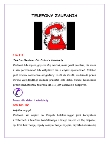 TELEFONY ZAUFANIA 116 111 Telefon Zaufania Dla Dzieci i Młodzieży Zadzwoń lub napisz, gdy coś Cię martwi, masz jakiś problem, nie masz z kim porozmawiać lub wstydzisz się o czymś opowiedzieć. Telefon jest czynny codziennie od godziny 12.00 do 20.00, wiadomość przez stronę www.116111.pl możesz przesłać całą dobę. Pomoc świadczona przez konsultantów telefonu 116 111 jest całkowicie bezpłatna. Pomoc dla dzieci i młodzieży. 800 100 100 helpline.org.pl Zadzwoń lub napisz do Zespołu helpline.org.pl jeśli korzystasz z Internetu i telefonu komórkowego i dzieje się coś co Cię niepokoi, np. ktoś bez Twojej zgody rozsyła Twoje zdjęcia, czy ktoś obraża Cię w Internecie. Możesz tam zadzwonić również wtedy, gdy masz obawy, że zbyt często korzystasz z telefonu lub Internetu. Telefon jest czynny od poniedziałku do piątku w godzinach 11.00 do 17.00 (połączenie bezpłatne). W tych samych godzinach działa chat na stronie www.helpline.org.pl Pomoc dla dzieci, młodzieży i dorosłych. 800 12 12 12 Telefon Zaufania Rzecznika Praw Dziecka Tu również możesz zadzwonić, gdy nie wiesz z kim porozmawiać, a coś bardzo Cię martwi. Możesz tam także zgłaszać takie sytuacje, które według Ciebie są niesprawiedliwe i masz poczucie, że ktoś zachował się nie tak jak powinien – np. złamał prawo. Telefon jest bezpłatny i jest czynny od poniedziałku do piątku od godziny 8:15 do 20:00 (połączenie bezpłatne). Jeśli zadzwonisz tam w godzinach nocnych i zostawisz informację o sobie i swój numer – konsultanci do Ciebie oddzwonią. Pomoc dla dzieci i dorosłych. 116 000 Całodobowy, bezpłatny telefon w sprawie zaginionego dziecka. Telefon 116 000 jest skierowany do rodziców i opiekunów, którym zaginęło dziecko, do zaginionych dzieci oraz do wszystkich osób, które mogą pomóc w ich odnalezieniu. Telefon 116000 działa 24 godziny na dobę, 7 dni w tygodniu (połączenie bezpłatne). www.zaginieni.pl Pomoc dla dzieci i dorosłych. 801 120 002 Ogólnopolski Telefon dla Ofiar Przemocy w Rodzinie „Niebieska Linia” Zadzwoń, jeśli ktoś w Twojej rodzinie krzywdzi Cię – bije lub obraża. Możesz tam opowiedzieć o swojej sytuacji i dowiedzieć się gdzie szukać pomocy w Twoim otoczeniu. Telefon działa od poniedziałku do soboty w godz. 8.00 - 22.00, a w niedziele i święta od 8.00 do 16.00. Dzwoniąc płacisz tylko http://www.niebieskalinia.org/ za pierwszy impuls połączenia. Pomoc dla dzieci i dorosłych. 800 676 676 Infolinia Rzecznika Praw Obywatelskich Na Infolinii Obywatelskiej można uzyskać podstawowe informacje o prawach człowieka i kompetencjach RPO oraz dowiedzieć się wszystkiego o prawie antydyskryminacyjnym. Doświadczeni prawnicy starają się udzielić niezbędnych informacji bądź pomóc skierować sprawę do właściwej instytucji. Telefon jest czynny w poniedziałki w godz. 10.00 - 18.00 oraz od wtorku do piątku w godz. 8.00 - 16.00 (połączenie bezpłatne z telefonów stacjonarnych i komórkowych). Pomoc dla dorosłych. 116 123 Telefon Zaufania dla Osób Dorosłych w Kryzysie Emocjonalnym Skorzystaj z niego, jeśli jesteś osobą dorosłą i przeżywasz trudności osobiste, nie potrafisz poradzić sobie ze swoim zmartwieniem. Możesz tam dzwonić od poniedziałku do piątku od godz. 14.00 do 22.00 (połączenie bezpłatne). http://116123.edu.pl/ Pomoc dla dorosłych. 800 120 226 Policyjny Telefon Zaufania ds. Przeciwdziałania Przemocy w Rodzinie Pod tym numerem telefonu można uzyskać wsparcie w sytuacji przemocy w rodzinie. Specjaliści obsługujący linię udzielają informacji na temat procedury "Niebieskiej Karty", np. jakie inne podmioty poza policją, mogą ją założyć. Telefon jest czynny od poniedziałku do piątku w godzinach 9.30 - 15.30 (połączenie bezpłatne). Pomoc dla dzieci i dorosłych. 801 190 990 Ogólnopolski Telefon Zaufania „Narkotyki – Narkomania” Zadzwoń jeśli masz problemy z narkotykami, używasz ich, jesteś uzależniony lub martwisz się o kogoś z Twojego otoczenia. Możesz tam uzyskać fachową poradę, a także informację o tym, jak pomóc sobie lub bliskiej osobie. Telefon jest czynny codziennie w godzinach od 16.00 do 21.00. Dzwoniąc płacisz tylko za pierwszy impuls połączenia. Pomoc dla dzieci i dorosłych. 801 889 880 Telefon Zaufania "Uzależnienia behawioralne" Z telefonu mogą korzystać wszystkie osoby, które mają problem lub też zastanawiają się, czy mają problem z uzależnieniami behawioralnymi. Z konsultantami mogą porozmawiać również osoby bliskie osobom uzależnionym – rodzina, przyjaciele, znajomi. Infolinia jest czynna codziennie w godzinach od 17.00 do 22.00 z wyjątkiem świąt państwowych. Dzwoniąc płacisz tylko za pierwszy impuls połączenia. www.uzaleznieniabehawioralne.pl 22 828 11 12 Telefonie Zaufania dla Ofiar i Sprawców Przemocy Seksualnej Telefon zaufania stanowi uzupełnienie działania poradni Fundacji Promocji Zdrowia Seksualnego, oferując pomoc osobom dorosłym, które doświadczyły przemocy seksualnej oraz służąc radą i wsparciem osobom, które pragną wyeliminować własne niepożądane myśli i zachowania. Telefon jest czynny we wtorki i środy od godz. 15:00 do 18:00. Opłaty za połączenia z numerem zgodnie z cennikiem operatora www.funpzs.org.pl
