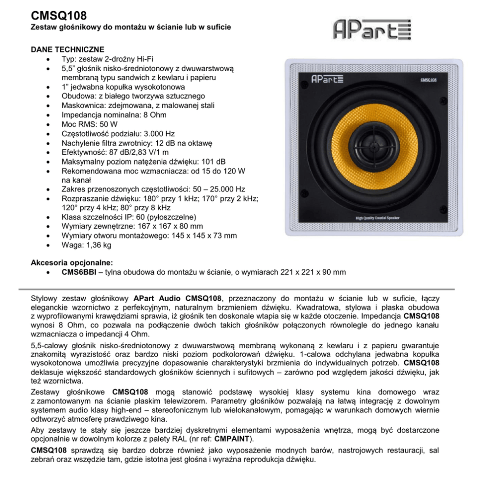 CMSQ108 Zestaw głośnikowy do montażu w ścianie lub w suficie DANE TECHNICZNE Typ: zestaw 2-drożny Hi-Fi 5,5” głośnik nisko-średniotonowy z dwuwarstwową membraną typu sandwich z kewlaru i papieru 1” jedwabna kopułka wysokotonowa Obudowa: z białego tworzywa sztucznego Maskownica: zdejmowana, z malowanej stali Impedancja nominalna: 8 Ohm Moc RMS: 50 W Częstotliwość podziału: 3.000 Hz Nachylenie filtra zwrotnicy: 12 dB na oktawę Efektywność: 87 dB/2,83 V/1 m Maksymalny poziom natężenia dźwięku: 101 dB Rekomendowana moc wzmacniacza: od 15 do 120 W na kanał Zakres przenoszonych częstotliwości: 50 – 25.000 Hz Rozpraszanie dźwięku: 180° przy 1 kHz; 170° przy 2 kHz; 120° przy 4 kHz; 80° przy 8 kHz Klasa szczelności IP: 60 (pyłoszczelne) Wymiary zewnętrzne: 167 x 167 x 80 mm Wymiary otworu montażowego: 145 x 145 x 73 mm Waga: 1,36 kg Akcesoria opcjonalne: CMS6BBI – tylna obudowa do montażu w ścianie, o wymiarach 221 x 221 x 90 mm Stylowy zestaw głośnikowy APart Audio CMSQ108, przeznaczony do montażu w ścianie lub w suficie, łączy eleganckie wzornictwo z perfekcyjnym, naturalnym brzmieniem dźwięku. Kwadratowa, stylowa i płaska obudowa z wyprofilowanymi krawędziami sprawia, iż głośnik ten doskonale wtapia się w każde otoczenie. Impedancja CMSQ108 wynosi 8 Ohm, co pozwala na podłączenie dwóch takich głośników połączonych równolegle do jednego kanału wzmacniacza o impedancji 4 Ohm. 5,5-calowy głośnik nisko-średniotonowy z dwuwarstwową membraną wykonaną z kewlaru i z papieru gwarantuje znakomitą wyrazistość oraz bardzo niski poziom podkolorowań dźwięku. 1-calowa odchylana jedwabna kopułka wysokotonowa umożliwia precyzyjne dopasowanie charakterystyki brzmienia do indywidualnych potrzeb. CMSQ108 deklasuje większość standardowych głośników ściennych i sufitowych – zarówno pod względem jakości dźwięku, jak też wzornictwa. Zestawy głośnikowe CMSQ108 mogą stanowić podstawę wysokiej klasy systemu kina domowego wraz z zamontowanym na ścianie płaskim telewizorem. Parametry głośników pozwalają na łatwą integrację z dowolnym systemem audio klasy high-end – stereofonicznym lub wielokanałowym, pomagając w warunkach domowych wiernie odtworzyć atmosferę prawdziwego kina. Aby zestawy te stały się jeszcze bardziej dyskretnymi elementami wyposażenia wnętrza, mogą być dostarczone opcjonalnie w dowolnym kolorze z palety RAL (nr ref: CMPAINT). CMSQ108 sprawdzą się bardzo dobrze również jako wyposażenie modnych barów, nastrojowych restauracji, sal zebrań oraz wszędzie tam, gdzie istotna jest głośna i wyraźna reprodukcja dźwięku.
