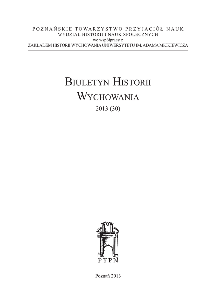P O Z N A Ń S K I E T O WA R Z Y S T W O P R Z Y J A C I Ó Ł N A U K WYDZIAŁ HISTORII I NAUK SPOŁECZNYCH we współpracy z ZAKŁADEM HISTORII WYCHOWANIA UNIWERSYTETU IM. ADAMA MICKIEWICZA Biuletyn Historii Wychowania 2013 (30) Poznań 2013 POZNAŃSKIE T O WA R Z Y S T W O PRZYJACIÓŁ NAUK GŁÓWNY REDAKTOR WYDAWNICTW PTPN Paweł Marszałek RADA REDAKCYJNA Kalina Bartnicka (Instytut Historii Nauki PAN), Vlasta Cabanova (Žilinská Univerzita v Žiline), Krzysztof Jakubiak (Uniwersytet Gdański), Wiesław Jamrożek (Uniwersytet im. Adama Mickiewicza w Poznaniu), Andrzej Meissner (Uniwersytet Rzeszowski), Lech Mokrzecki (Uniwersytet Gdański), Winfried Schich (Freien Universität Berlin), Władysława Szulakiewicz (Uniwersytet Mikołaja Kopernika), Jaroslav Vaculik (Masaryk University Brno), Adam Winiarz (Wszechnica Świętokrzyska w Kielcach), Dorota Zołądź-Strzelczyk (Uniwersytet im. Adama Mickiewicza w Poznaniu) RECENZENCI TOMU Kazimierz Denek, Katarzyna Dormus, Romuald Grzybowski, Janina Kamińska, Stanisław Jankowiak, Elżbieta Magiera, Iwonna Michalska, Bożena Popiołek, Kazimierz Puchowski, Eleonora Sapia-Drewniak, Bogusław Śliwerski, Agnieszka Wałęga, Michał Zwierzykowski REDAKCJA Wiesław Jamrożek (redaktor naczelny) Dorota Żołądź-Strzelczyk (zastępca redaktora naczelnego) Krzysztof Ratajczak (sekretarz) REDAKCJA JĘZYKOWA Krystyna Sobkowicz, Anna Augustyniak-Osiewicz ADRES REDAKCJI WSE UAM, ul. A. Szamarzewskiego 89 p. 404 60-568 Poznań, tel. (0 61) 829 23 14 ISSN 1233-2224 ISBN 978-83-7654-211-9 CZASOPISMO RECENZOWANE Wydanie publikacji dofinansowało Ministerstwo Nauki i Szkolnictwa Wyższego WYDAWCY Wydawnictwo Poznańskiego Towarzystwa Przyjaciół Nauk Zakład Historii Wychowania Uniwersytetu im. A. Mickiewicza w Poznaniu Zarząd Główny Towarzystwa Historii Edukacji w Warszawie Nakład: 250 egz. PROJEKT OKŁADKI Joanna Roszkowska-Jazdon Ilustracja na okładce na podstawie drzeworytu Nauczanie z książki M. Reja Zwierciadło, 1568 r. Pierwotną wersją czasopisma jest wersja drukowana DRUK Drukarnia A. Frąckowiak Poznań, ul. Unii Lubelskiej 3, tel. 0502 604 192 SPIS TREŚCI ARTYKUŁY I ROZPRAWY Jolanta M. Marszalska, Cysterskie szkoły w Szczyrzycu od 1780 roku do lat trzydziestych XX wieku.............................................................................................................. 7 Anna Szylar, Wzorce wychowania do życia w rodzinie przekazywane dziewczętom w szkołach klasztornych (XVII–XIX w.)....................................................................... 25 Zbigniew J. Żółciński, Zróżnicowane ramy prawne ojcowskiej władzy rodzicielskiej obowiązujące na ziemiach polskich w pierwszej połowie XIX wieku......................... 43 Krystyna Wróbel-Lipowa, Model wychowania w rodzinie ziemiańskiej w pierwszej połowie XIX wieku na przykładzie domu Stanisława Kostki Zamoyskiego i jego córki Celiny Działyńskiej........................................................................................................ 55 Monika Nawrot-Borowska, Zabawy i zabawki dziecięce w drugiej połowie XIX i na początku XX wieku – wybrane problemy z wykorzystaniem grafik z epoki............... 65 Joanna Król, Reformy dyktuje system – o naradzie oświatowej KC PZPR z 24 października 1958 roku........................................................................................................ 89 MATERIAŁY Małgorzata Ewa Kowalczyk, „Osobliwie muszę tu wyznać zrządzenie Boskie nad tobą Synu mój kochany, iż twoja najlepiej cię kochająca Matka, uniesiona często słabością rozumu swojego, biła cię i źle ci życzyła”. Choroba psychiczna w rodzinie w drugiej połowie XVIII wieku na przykładzie dzieciństwa Stanisława Mikołaja Tretera............................................................................................................................. 103 Karolina Studnicka-Mariańczyk, Wykształcenie ziemiańskie i jego wpływ na wychowanie dzieci na przykładzie rodu Ostrowskich Korabitów........................................... 113 Anna Kołodziej, Problematyka patriotyzmu w wychowaniu harcerskim w Związku Harcerstwa Rzeczypospolitej (ZHR).............................................................................. 133 Z KALENDARZA HISTORYCZNEGO Robert Sarnecki, Przemilczana rocznica. Czterechsetlecie wydania Memoriału frankfurckiego......................................................................................................................... 149 PREZENTACJE Robert Jankowski, Dwudziestolecie Zakładu i Katedry Historii Wychowania w Uniwersytecie Szczecińskim (1992–2012)................................................................................ 155 WYDAWNICTWA Recenzje i noty Krzysztof Ratajczak, Krzysztof Boroda, Studenci Uniwersytetu Krakowskiego w późnym średniowieczu, Wydawnictwo Avalon, Kraków 2010, ss. 404.............................. 165 Władysława Szulakiewicz, Kazimierz Twardowski, Dzienniki młodzieńcze (1881–1887), wydała A. Brożek, Warszawa 2013 ss. 210................................................................... 169 Edyta Wolter, Romuald Grzybowski, Polityczne priorytety i elementy codzienności socjalistycznej szkoły. Wybór studiów poświęconych dziedzictwu edukacyjnemu PRL -u, Wydawnictwo Adam Marszałek, Toruń 2013, ss. 332............................................. 173 Joanna Falkowska, Piotr Gołdyn, Sławomir Czerwiński (1885–1931). Minister oświaty, przyjaciel Kalisza, Kalisz 2013, ss. 88...................................................................... 175 Anna Knocińska, Wychowanie w rodzinie. Przekaz tradycji i kultury na przestrzeni wieków, tom 1, red. S. Walasek, L. Albański, Wydawnictwo: Karkonoska Państwowa Szkoła Wyższa w Jeleniej Górze, Jelenia Góra 2011, ss. 276................................. 177 Katarzyna Kabacińska-Łuczak, Kultura zabawy, pod redakcją Tadeusza Palecznego, Ryszarda Kantora, Magd