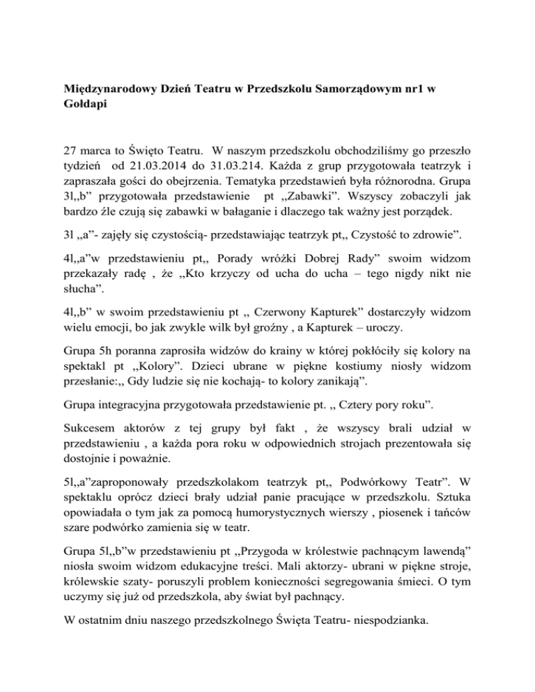 Międzynarodowy Dzień Teatru w Przedszkolu Samorządowym nr1 w Gołdapi 27 marca to Święto Teatru. W naszym przedszkolu obchodziliśmy go przeszło tydzień od 21.03.2014 do 31.03.214. Każda z grup przygotowała teatrzyk i zapraszała gości do obejrzenia. Tematyka przedstawień była różnorodna. Grupa 3l,,b” przygotowała przedstawienie pt ,,Zabawki”. Wszyscy zobaczyli jak bardzo źle czują się zabawki w bałaganie i dlaczego tak ważny jest porządek. 3l ,,a”- zajęły się czystością- przedstawiając teatrzyk pt,, Czystość to zdrowie”. 4l,,a”w przedstawieniu pt,, Porady wróżki Dobrej Rady” swoim widzom przekazały radę , że ,,Kto krzyczy od ucha do ucha – tego nigdy nikt nie słucha”. 4l,,b” w swoim przedstawieniu pt ,, Czerwony Kapturek” dostarczyły widzom wielu emocji, bo jak zwykle wilk był groźny , a Kapturek – uroczy. Grupa 5h poranna zaprosiła widzów do krainy w której pokłóciły się kolory na spektakl pt ,,Kolory”. Dzieci ubrane w piękne kostiumy niosły widzom przesłanie:,, Gdy ludzie się nie kochają- to kolory zanikają”. Grupa integracyjna przygotowała przedstawienie pt. ,, Cztery pory roku”. Sukcesem aktorów z tej grupy był fakt , że wszyscy brali udział w przedstawieniu , a każda pora roku w odpowiednich strojach prezentowała się dostojnie i poważnie. 5l,,a”zaproponowały przedszkolakom teatrzyk pt,, Podwórkowy Teatr”. W spektaklu oprócz dzieci brały udział panie pracujące w przedszkolu. Sztuka opowiadała o tym jak za pomocą humorystycznych wierszy , piosenek i tańców szare podwórko zamienia się w teatr. Grupa 5l,,b”w przedstawieniu pt ,,Przygoda w królestwie pachnącym lawendą” niosła swoim widzom edukacyjne treści. Mali aktorzy- ubrani w piękne stroje, królewskie szaty- poruszyli problem konieczności segregowania śmieci. O tym uczymy się już od przedszkola, aby świat był pachnący. W ostatnim dniu naszego przedszkolnego Święta Teatru- niespodzianka. Rodzice z grupy 5h – popołudniowej wraz z wychowawczynią p. Dorotą Sławińską przygotowali niespodziankę. Wystawili nam sztukę pt ,,Czerwony Kapturek” w której zagrali wszystkie role. Ileż było radości , emocji i napięcia , kiedy w rolę wilka wcielił się tata Wiktora Sarosiek, a Czerwonym Kapturkiem była mama Kubusia Wiktoruka, babcią była mama Julii Tobolskiej, leśniczym tata Łukasza Wróbla, a mamą Kapturka była mama Michalinki Kudryk. Fantastyczna scenografia, rekwizyty, kostiumy i poczucie humoru rodziców sprawiło , ze mieliśmy w tym dniu prawdziwą ucztę teatralną. Wszyscy wiemy jak ważną rolę pełni teatr w życiu dorosłych i dzieci. Mamy nadzieję , że w tych dniach dorośli i dzieci poczuli magię teatru. Poetka Joanna Kulmowa wyraziła to w wierszu ,, Po co jest teatr?” …,,To jest teatr. A teatr jest po to, Żeby wszystko było inne niż dotąd. Żeby iść do domu w zamyśleniu, w zachwycie. I już zawsze w misce księżyc widzieć…” Koordynator Grażyna Fiszer