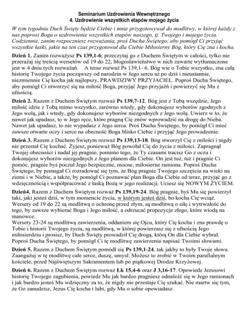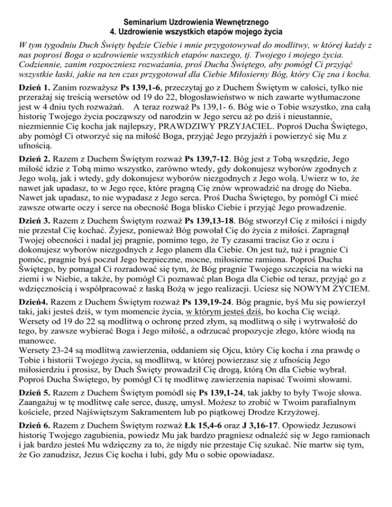 Seminarium Uzdrowienia Wewnętrznego 4. Uzdrowienie wszystkich etapów mojego życia W tym tygodniu Duch Święty będzie Ciebie i mnie przygotowywał do modlitwy, w której każdy z nas poprosi Boga o uzdrowienie wszystkich etapów naszego, tj. Twojego i mojego życia. Codziennie, zanim rozpoczniesz rozważania, proś Ducha Świętego, aby pomógł Ci przyjąć wszystkie łaski, jakie na ten czas przygotował dla Ciebie Miłosierny Bóg, który Cię zna i kocha. Dzień 1. Zanim rozważysz Ps 139,1-6, przeczytaj go z Duchem Świętym w całości, tylko nie przerażaj się treścią wersetów od 19 do 22, błogosławieństwo w nich zawarte wytłumaczone jest w 4 dniu tych rozważań. A teraz rozważ Ps 139,1- 6. Bóg wie o Tobie wszystko, zna całą historię Twojego życia począwszy od narodzin w Jego sercu aż po dziś i nieustannie, niezmiennie Cię kocha jak najlepszy, PRAWDZIWY PRZYJACIEL. Poproś Ducha Świętego, aby pomógł Ci otworzyć się na miłość Boga, przyjąć Jego przyjaźń i powierzyć się Mu z ufnością. Dzień 2. Razem z Duchem Świętym rozważ Ps 139,7-12. Bóg jest z Tobą wszędzie, Jego miłość idzie z Tobą mimo wszystko, zarówno wtedy, gdy dokonujesz wyborów zgodnych z Jego wolą, jak i wtedy, gdy dokonujesz wyborów niezgodnych z Jego wolą. Uwierz w to, że nawet jak upadasz, to w Jego ręce, które pragną Cię znów wprowadzić na drogę do Nieba. Nawet jak upadasz, to nie wypadasz z Jego serca. Proś Ducha Świętego, by pomógł Ci mieć zawsze otwarte oczy i serce na obecność Boga blisko Ciebie i przyjąć Jego prowadzenie. Dzień 3. Razem z Duchem Świętym rozważ Ps 139,13-18. Bóg stworzył Cię z miłości i nigdy nie przestał Cię kochać. Żyjesz, ponieważ Bóg powołał Cię do życia z miłości. Zapragnął Twojej obecności i nadal jej pragnie, pomimo tego, że Ty czasami tracisz Go z oczu i dokonujesz wyborów niezgodnych z Jego planem dla Ciebie. On jest tuż, tuż i pragnie Ci pomóc, pragnie byś poczuł Jego bezpieczne, mocne, miłosierne ramiona. Poproś Ducha Świętego, by pomagał Ci rozradować się tym, że Bóg pragnie Twojego szczęścia na wieki na ziemi i w Niebie, a także, by pomógł Ci poznawać plan Boga dla Ciebie od teraz, przyjąć go z wdzięcznością i współpracować z łaską Bożą w jego realizacji. Uciesz się NOWYM ŻYCIEM. Dzień4. Razem z Duchem Świętym rozważ Ps 139,19-24. Bóg pragnie, byś Mu się powierzył taki, jaki jesteś dziś, w tym momencie życia, w którym jesteś dziś, bo kocha Cię wciąż. Wersety od 19 do 22 są modlitwą o ochronę przed złym, są modlitwą o siłę i wytrwałość do tego, by zawsze wybierać Boga i Jego miłość, a odrzucać propozycje złego, które wiodą na manowce. Wersety 23-24 są modlitwą zawierzenia, oddaniem się Ojcu, który Cię kocha i zna prawdę o Tobie i historii Twojego życia, są modlitwą, w której powierzasz się z ufnością Jego miłosierdziu i prosisz, by Duch Święty prowadził Cię drogą, którą On dla Ciebie wybrał. Poproś Ducha Świętego, by pomógł Ci tę modlitwę zawierzenia napisać Twoimi słowami. Dzień 5. Razem z Duchem Świętym pomódl się Ps 139,1-24, tak jakby to były Twoje słowa. Zaangażuj w tę modlitwę całe serce, duszę, umysł. Możesz to zrobić w Twoim parafialnym kościele, przed Najświętszym Sakramentem lub po piątkowej Drodze Krzyżowej. Dzień 6. Razem z Duchem Świętym rozważ Łk 15,4-6 oraz J 3,16-17. Opowiedz Jezusowi historię Twojego zagubienia, powiedz Mu jak bardzo pragniesz odnaleźć się w Jego ramionach i jak bardzo jesteś Mu wdzięczny za to, że nigdy nie przestaje Cię szukać. Nie martw się tym, że Go zanudzisz, Jezus Cię kocha i lubi, gdy Mu o sobie opowiadasz.