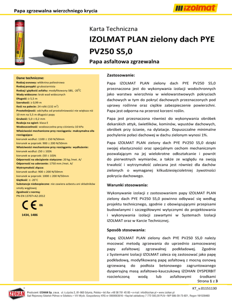 Papa zgrzewalna wierzchniego krycia Karta Techniczna IZOLMAT PLAN zielony dach PYE PV250 S5,0 Papa asfaltowa zgrzewalna Dane techniczne: Rodzaj osnowy: włóknina poliestrowa Rodzaj posypki: gruboziarnista 0 Rodzaj i giętkość asfaltu: modyfikowany SBS, -20 C Wady widoczne: brak wad widocznych Długość: ≥ 5,5 m Szerokość: ≥ 0,99 m 2 Ilość na palecie: 24 rolki (132 m ) Prostolinijność: odchyłka od prostoliniowości nie większa niż 10 mm na 5,5 m długości papy Grubość: 5,0 0,2 mm Reakcja na ogień: klasa E Wodoszczelność: wodoszczelna przy ciśnieniu 10 kPa Właściwości mechaniczne przy rozciąganiu: maksymalna siła rozciągająca: kierunek wzdłuż: 1100 150 N/50mm kierunek w poprzek: 900 200 N/50mm Właściwości mechaniczne przy rozciąganiu: wydłużenie: kierunek wzdłuż: (50 10)% kierunek w poprzek: (50 10)% Odporność na obciążenie statyczne: 20 kg /met. A/ Odporność na uderzenie: 1750 mm /met. A/ Wytrzymałość złącza: kierunek wzdłuż: 900 200 N/50mm kierunek w poprzek: 1000 200 N/50mm Giętkość: ≤ -20˚C Substancje niebezpieczne: nie zawiera azbestu ani składników smoły węglowej Zgodność z normą: PN-EN 13707+A2:2012 06 1434, 1486 Zastosowanie: Papa IZOLMAT PLAN zielony dach PYE PV250 S5,0 przeznaczona jest do wykonywania izolacji wodochronnych jako warstwa wierzchnia w wielowarstwowych pokryciach dachowych w tym do pokryć dachowych przeznaczonych pod uprawy roślinne oraz ciężkie zabezpieczenie powierzchni. Papa jest odporna na przerost korzeni roślin. Papa jest przeznaczona również do wykonywania obróbek dekarskich attyk, świetlików, kominów, wpustów dachowych, obróbek przy ścianie, na dylatacje. Dopuszczalne minimalne pochylenie połaci dachowej w dachu zielonym wynosi 1%. Papa IZOLMAT PLAN zielony dach PYE PV250 S5,0 dzięki swojej elastyczności oraz specjalnym cechom mechanicznym pozwalającym na jej wielokrotne odkształcanie i powrót do pierwotnych wymiarów, a także ze względu na swoją trwałość i wytrzymałość zalecana jest również dla dachów zielonych o wymaganej kilkudziesięcioletniej żywotności pokrycia dachowego. Warunki stosowania: Wykonywanie izolacji z zastosowaniem papy IZOLMAT PLAN zielony dach PYE PV250 S5,0 powinno odbywać się według projektu technicznego, zgodnie z obowiązującymi przepisami budowlanymi i szczegółowymi wytycznymi do projektowania i wykonywania izolacji zawartymi w Systemach Izolacji IZOLMAT oraz w Karcie Technicznej. Sposób stosowania: Papę IZOLMAT PLAN zielony dach PYE PV250 S5,0 należy mocować metodą zgrzewania do uprzednio zamocowanej papy asfaltowej zgrzewalnej podkładowej. Zgodnie z Systemami Izolacji IZOLMAT zaleca się zastosować jako papę podkładową, modyfikowaną papę asfaltową z mocną osnową zgrzewaną do podłoża betonowego zagruntowanego dyspersyjną masą asfaltowo-kauczukową IZOHAN DYSPERBIT rozcieńczoną wodą lub asfaltowymi środkami Strona 1 z 3 KT_v.01151130 IZOLMAT PLAN zielony dach PYE PV250 S5,0 Sposób stosowania cd: rozpuszczalnikowymi. Podłoże powinno być w każdym przypadku wytrzymałe mechanicznie, bez luźnych zanieczyszczeń, tłustych plam czy wody. Papa powinna być układana w temperaturach otoczenia powyżej 0°C. Stosowanie papy w obniżonych temperaturach otoczenia jest możliwe pod warunkiem przechowywania rolek przez 24 godz. przed użyciem w pomieszczeniach ogrzewanych. Wskutek podgrzania palnikiem zarówno podłoża, jak i spodniej strony papy, ochronna cienka folia z tworzywa sztucznego stapia się, asfalt ulega nadtopieniu i papa równomiernie rozwijana przykleja się do podłoża. Należy zachować zakład papy o szerokości min. 8 cm wzdłuż wstęgi papy i zakład o szerokości min. 12 cm na połączeniu prostopadłym do długości wstęgi papy. Każdorazowo po zakończeniu czynności zgrzewania, konieczne jest przeprowadzenie kontroli prawidłowości wykonania połączenia papy na zakładach. Zaleca się szczególną dokładność i staranność wykonania złączy papy IZOLMAT PLAN zielony dach PYE PV250 S5,0 na zakładach, co jest jednym z najważniejszych warunków prawidłowego funkcjonowania tej papy jako izolacji i jednocześnie bariery zapewniającej odporność na przerost korzeni roślin. Wymagany jest wypływ masy asfaltowej o szerokości ok. 0,5 ÷ 1 cm na całej długości zgrzewanego zakładu. W miejscach przejścia papy z powierzchni poziomej na pionową, należy zastosować klin styropianowy lub z wełny mineralnej twardej bądź zapewnić łagodne przejście papy na powierzchnię pionową. Górna krawędź papy na powierzchni pionowej należy dodatkowo przymocować listwą dociskową mocowaną na kołki i doszczelnić uszczelniaczem dekarskim. Szczegóły dotyczące przygotowania podłoża i zgrzewania papy, opisano w Systemach Izolacji IZOLMAT w części PODSTAWOWE ZASADY WYKONYWANIA ROBÓT IZOLACYJNYCH. Gwarancja: Producent IZOHAN Sp. z o.o. udziela bezpośredniemu nabywcy papy IZOLMAT PLAN zielony dach PYE PV250 S5,0: gwarancji materiałowej specjalnej na 30 lat, w przypadku zastosowania do gruntowania podłoża IZOHAN IZOBUD Penetratora G7 , IZOHAN DYSPERBIT lub IZOHAN IZOBUD Br lub gwarancji materiałowej standardowej na 25 lat. Warunkiem skorzystania z uprawnień wynikających z udzielonej gwarancji jest m.in. zastosowanie papy zgodnie z obowiązującymi przepisami budowlanymi, Kartą Techniczną oraz zgodnie z przeznaczeniem, określonym rozwiązaniami zawartymi w Systemach Izolacji IZOLMAT. Transport i składowanie Rolki papy IZOLMAT PLAN zielony dach PYE PV250 S5,0 w banderolach fabrycznych zawierających wymagane dane są ustawione na paletach przemysłowych drewnianych i ofoliowane. Zarówno podczas transportu, jak i składowania rolki papy muszą być chronione przed zawilgoceniem, zabezpieczone przed działaniem promieni słonecznych i ustawione w pozycji stojącej w jednej warstwie w sposób uniemożliwiający przemieszczanie się i uszkodzenie. Rolki papy należy magazyn