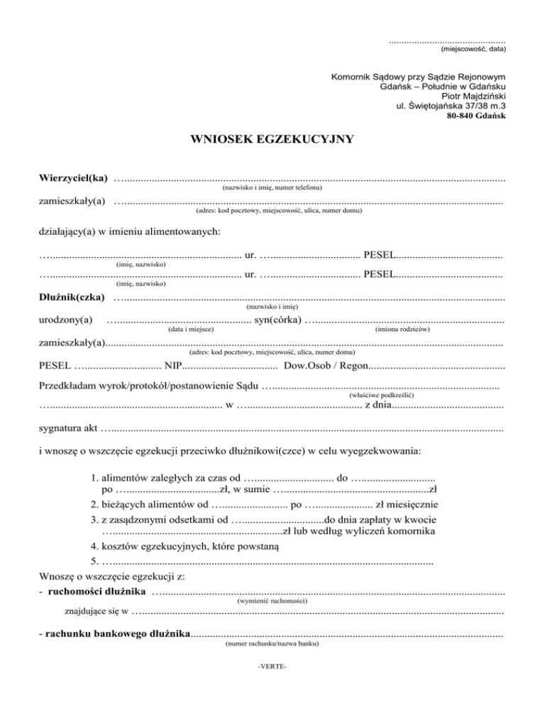 .............................................. (miejscowość, data) Komornik Sądowy przy Sądzie Rejonowym Gdańsk – Południe w Gdańsku Piotr Majdziński ul. Świętojańska 37/38 m.3 80-840 Gdańsk WNIOSEK EGZEKUCYJNY Wierzyciel(ka) …........................................................................................................................................... (nazwisko i imię, numer telefonu) zamieszkały(a) ….......................................................................................................................................... (adres: kod pocztowy, miejscowość, ulica, numer domu) działający(a) w imieniu alimentowanych: …...................................................................... ur. …................................. PESEL....................................... (imię, nazwisko) …...................................................................... ur. …................................. PESEL....................................... (imię, nazwisko) Dłużnik(czka) …........................................................................................................................................... (nazwisko i imię) urodzony(a) …................................................. syn(córka) …..................................................................... (imiona rodziców) (data i miejsce) zamieszkały(a)................................................................................................................................................. (adres: kod pocztowy, miejscowość, ulica, numer domu) PESEL …............................ NIP................................... Dow.Osob / Regon.................................................. Przedkładam wyrok/protokół/postanowienie Sądu …................................................................................... (właściwe podkreślić) …............................................................... w ….......................................... z dnia......................................... sygnatura akt …............................................................................................................................................... i wnoszę o wszczęcie egzekucji przeciwko dłużnikowi(czce) w celu wyegzekwowania: 1. alimentów zaległych za czas od …............................. do …........................... po …..................................zł, w sumie ….....................................................zł 2. bieżących alimentów od …........................ po …..................... zł miesięcznie 3. z zasądzonymi odsetkami od …..............................do dnia zapłaty w kwocie …..............................................................zł lub według wyliczeń komornika 4. kosztów egzekucyjnych, które powstaną 5. …..................................................................................................................... Wnoszę o wszczęcie egzekucji z: - ruchomości dłużnika …............................................................................................................................. (wymienić ruchomości) znajdujące się w ….................................................................................................................................... - rachunku bankowego dłużnika.................................................................................................................. (numer rachunku/nazwa banku) -VERTE- - wierzytelności dłużnika .............................................................................................................................. (podać jakie, imię, nazwisko/nazwa trzeciodłużnika) - wynagrodzenia za pracę.............................................................................................................................. (nazwa, adres pracodawcy) - nieruchomości.............................................................................................................................................. (numer Księgi Wieczystej, adres, wielkość udziału) - inne................................................................................................................................................................ (emerytura/renta/ pozostałe świadczenia/ inne prawa majątkowe) Wyegzekwowane należności proszę przekazywać na rachunek bankowy wierzyciela ................................. …..................................................................................................................................................................... (numer rachunku, nazwa banku) Wierzyciel oświadcza, że składając wniosek skorzystał z prawa wyboru komornika zawartego w art. 8 ust. 6 Ustawy o Komornikach Sądowych i Egzekucji z dnia 29 sierpnia 1997 (Dz. U. Z 2006 r. Nr 167 poz. 1191 ze zm. ) …..................................... (podpis wierzyciela)