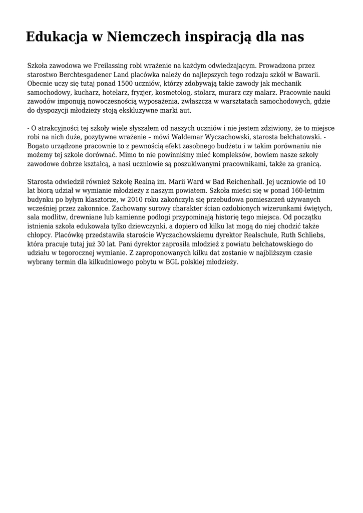 Edukacja w Niemczech inspiracją dla nas Szkoła zawodowa we Freilassing robi wrażenie na każdym odwiedzającym. Prowadzona przez starostwo Berchtesgadener Land placówka należy do najlepszych tego rodzaju szkół w Bawarii. Obecnie uczy się tutaj ponad 1500 uczniów, którzy zdobywają takie zawody jak mechanik samochodowy, kucharz, hotelarz, fryzjer, kosmetolog, stolarz, murarz czy malarz. Pracownie nauki zawodów imponują nowoczesnością wyposażenia, zwłaszcza w warsztatach samochodowych, gdzie do dyspozycji młodzieży stoją ekskluzywne marki aut. - O atrakcyjności tej szkoły wiele słyszałem od naszych uczniów i nie jestem zdziwiony, że to miejsce robi na nich duże, pozytywne wrażenie – mówi Waldemar Wyczachowski, starosta bełchatowski. Bogato urządzone pracownie to z pewnością efekt zasobnego budżetu i w takim porównaniu nie możemy tej szkole dorównać. Mimo to nie powinniśmy mieć kompleksów, bowiem nasze szkoły zawodowe dobrze kształcą, a nasi uczniowie są poszukiwanymi pracownikami, także za granicą. Starosta odwiedził również Szkołę Realną im. Marii Ward w Bad Reichenhall. Jej uczniowie od 10 lat biorą udział w wymianie młodzieży z naszym powiatem. Szkoła mieści się w ponad 160-letnim budynku po byłym klasztorze, w 2010 roku zakończyła się przebudowa pomieszczeń używanych wcześniej przez zakonnice. Zachowany surowy charakter ścian ozdobionych wizerunkami świętych, sala modlitw, drewniane lub kamienne podłogi przypominają historię tego miejsca. Od początku istnienia szkoła edukowała tylko dziewczynki, a dopiero od kilku lat mogą do niej chodzić także chłopcy. Placówkę przedstawiła staroście Wyczachowskiemu dyrektor Realschule, Ruth Schliebs, która pracuje tutaj już 30 lat. Pani dyrektor zaprosiła młodzież z powiatu bełchatowskiego do udziału w tegorocznej wymianie. Z zaproponowanych kilku dat zostanie w najbliższym czasie wybrany termin dla kilkudniowego pobytu w BGL polskiej młodzieży.
