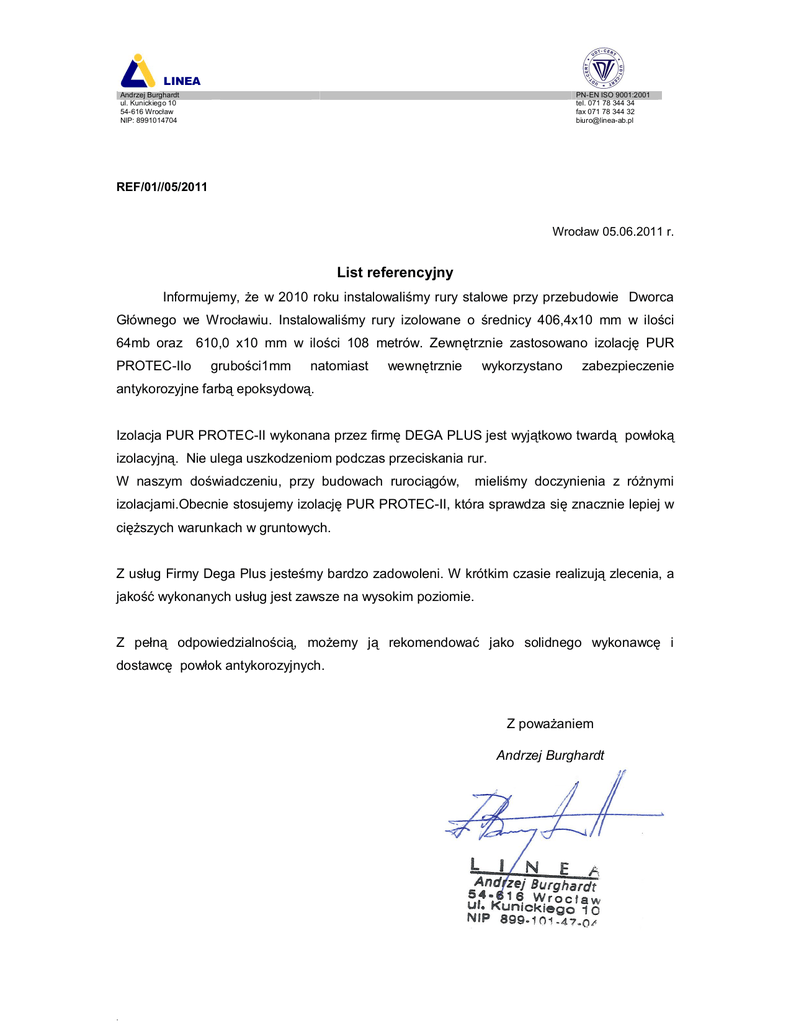 LINEA Andrzej Burghardt ul. Kunickiego 10 54-616 Wrocław NIP: 8991014704 PN-EN ISO 9001:2001 tel. 071 78 344 34 fax 071 78 344 32 [email protected] REF/01//05/2011 Wrocław 05.06.2011 r. List referencyjny Informujemy, że w 2010 roku instalowaliśmy rury stalowe przy przebudowie Dworca Głównego we Wrocławiu. Instalowaliśmy rury izolowane o średnicy 406,4x10 mm w ilości 64mb oraz 610,0 x10 mm w ilości 108 metrów. Zewnętrznie zastosowano izolację PUR PROTEC-IIo grubości1mm natomiast wewnętrznie wykorzystano zabezpieczenie antykorozyjne farbą epoksydową. Izolacja PUR PROTEC-II wykonana przez firmę DEGA PLUS jest wyjątkowo twardą powłoką izolacyjną. Nie ulega uszkodzeniom podczas przeciskania rur. W naszym doświadczeniu, przy budowach rurociągów, mieliśmy doczynienia z różnymi izolacjami.Obecnie stosujemy izolację PUR PROTEC-II, która sprawdza się znacznie lepiej w cięższych warunkach w gruntowych. Z usług Firmy Dega Plus jesteśmy bardzo zadowoleni. W krótkim czasie realizują zlecenia, a jakość wykonanych usług jest zawsze na wysokim poziomie. Z pełną odpowiedzialnością, możemy ją rekomendować jako solidnego wykonawcę i dostawcę powłok antykorozyjnych. Z poważaniem Andrzej Burghardt .
