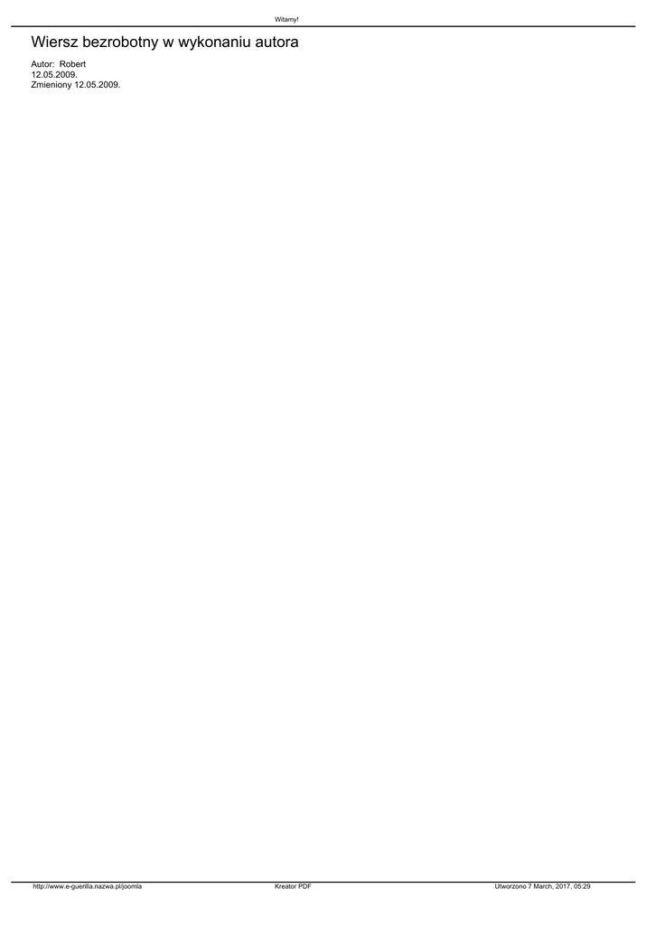 Witamy! Wiersz bezrobotny w wykonaniu autora Autor: Robert 12.05.2009. Zmieniony 12.05.2009. http://www.e-guerilla.nazwa.pl/joomla Kreator PDF Utworzono 7 March, 2017, 05:29