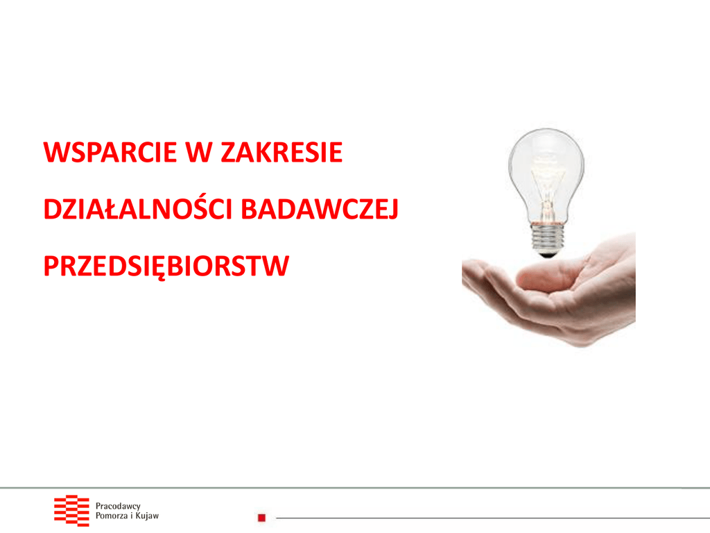 WSPARCIE W ZAKRESIE DZIAŁALNOŚCI BADAWCZEJ PRZEDSIĘBIORSTW Fundusz Badań i Wdrożeń – Voucher Badawczy (Poddziałanie 1.2.1 RPO WKP) Na co można otrzymać dofinansowanie? W ramach Projektu Fundusz Badań i Wdrożeń – Voucher Badawczy wsparcie mogą uzyskać przedsięwzięcia, polegające na zakupie przez MŚP prac badawczorozwojowych w jednostkach naukowych w rozumieniu definicji zgodnej z art. 2 pkt 9 Ustawy z dnia 30 kwietnia 2010 r. o zasadach finansowania nauki. Kto może składać wnioski? Konkurs przeznaczony dla mikro, małych i średnich przedsiębiorców prowadzących działalność na terenie województwa kujawsko-pomorskiego Fundusz Badań i Wdrożeń – Voucher Badawczy (Poddziałanie 1.2.1 RPO WKP) Projekt będzie realizowany w Partnerstwie 4 instytucji otoczenia biznesu. Kujawsko Pomorska Agencja Innowacji Sp. z o.o. jest Liderem Partnerstwa, a Partnerami są następujące instytucje: „Pracodawców Pomorza i Kujaw” Związek Pracodawców, Izba Przemysłowo Handlowa w Toruniu Polskie Towarzystwo Ekonomiczne Oddział w Bydgoszczy Fundusz Badań i Wdrożeń – Voucher Badawczy (Poddziałanie 1.2.1 RPO WKP) Tryb oceny wniosków: Tryb konkursowy I tura naboru wniosków: III/IV kwartał 2016 r. II tura naboru wniosków: I/II kwartał 2017 r. III tura naboru wniosków: III/IV kwartał 2017 r. Minimalna wartość kosztów kwalifikowanych 20 000,00 Maksymalna wartość kosztów kwalifikowanych 100 000,00 Maksymalny poziom dofinansowania do 80% Fundusz Badań i Wdrożeń – Voucher Badawczy (Poddziałanie 1.2.1 RPO WKP) Limity i ograniczenia w realizacji projektów (m.in.): a) Projekt wpisuje się w regionalną strategię inteligentnej specjalizacji b) Beneficjent/odbiorca końcowy prowadzi działalność gospodarczą na terytorium województwa kujawsko-pomorskiego. c) Warunkiem otrzymania dofinansowania jest komercjalizacja wyników prac B+R (w okresie trwałości projektu). Fundusz Badań i Wdrożeń – Voucher Badawczy (Poddziałanie 1.2.1 RPO WKP) Limity i ograniczenia w realizacji projektów (m.in.): d) Przerwanie realizacji projektu oraz rezygnacja z wdrożenia wyników prac B+R nie skutkuje koniecznością zwrotu środków wyłącznie w przypadku, gdy w trakcie realizacji prac B+R okaże się, że dalsze prace nie doprowadzą do osiągnięcia zakładanych wyników, bądź gdy po zakończeniu prac B+R wdrożenie okaże się bezcelowe z ekonomicznego punktu widzenia. e) Wsparcia nie uzyskają projekty, które zostały fizycznie ukończone lub w pełni zrealizowane przed złożeniem wniosku o dofinansowanie projektu. Regionalne Inteligentne specjalizacje 1. INTELIGENTNE SPECJALIZACJE OPARTE NA WARTOŚCIACH: a) Zdrowa i bezpieczna żywność b) Zdrowie i turystyka zdrowotna c) Zaawansowane materiały i narzędzia d) Transport i mobilność e) Dziedzictwo kulturowe i przemysły kreatywne 2. INTELIGENTNE SPECJALIZACJE OPARTE NA TECHNOLOGIACH REALIZUJĄCYCH INTELIGENTNE SPECJALIZACJE OPARTE NA WARTOŚCIACH a) Usługi ICT, b) Ekoinnowacje, c) Automatyka przemysłowa Bony na innowacje dla MŚP (PO IR 2.3.2) Polska Agencja Rozwoju Przedsiębiorczości Na co można otrzymać dofinansowanie? Na realizację projektów obejmujących zakup od wykonawcy usługi polegającej na opracowaniu nowego lub znacząco ulepszonego wyrobu, usługi, technologii produkcji lub nowego projektu wzorniczego. Wykonawcą usług, o których mowa powyżej, mogą być jednostki naukowe w rozumieniu art. 2 pkt 9 ustawy z dnia 30 kwietnia 2010 r. o zasadach finansowania nauki (Dz.U. z 2014 r., poz. 1620, z późn. zm.), posiadające siedzibę na terytorium Rzeczypospolitej Polskiej oraz przyznaną kategorię naukową A+, A albo B, o której mowa w art. 42 ust. 3 ustawy o zasadach finansowania nauki. Bony na innowacje dla MŚP (PO IR 2.3.2) Polska Agencja Rozwoju Przedsiębiorczości Katalog kosztów kwalifikowalnych projektu obejmuje koszty: 1) usługi polegającej na opracowaniu nowego lub znacząco ulepszonego wyrobu, usługi, technologii produkcji lub nowego projektu wzorniczego; 2) usługi dotyczącej innowacji nietechnologicznej (marketingowej lub organizacyjnej), jeśli usługa ta towarzyszy usłudze, o której mowa w pkt 1 (koszt usługi nie może przekroczyć 15% całkowitej kwoty kosztów kwalifikowalnych projektu); 3) materiałów, pod warunkiem, że są niezbędne do realizacji usługi, o której mowa w pkt 1 (koszt materiałów nie może przekroczyć 15% całkowitej kwoty kosztów kwalifikowalnych projektu. Bony na innowacje dla MŚP (PO IR 2.3.2) Polska Agencja Rozwoju Przedsiębiorczości Kto może składać wnioski? Konkurs przeznaczony dla MŚP - ogłoszenie konkursu: 5 maja 2016 r. - rozpoczęcie naboru wniosków: 6 czerwca 2016 r. - zakończenie naboru wniosków: 30 stycznia 2017 r. Konkurs będzie przeprowadzony w dwóch etapach: a) ocena formalna b) ocena merytoryczna Czas trwania oceny projektów, liczony od dnia zamknięcia naboru wniosków o dofinansowanie trwa około 60 dni. Bony na innowacje dla MŚP (PO IR 2.3.2) Polska Agencja Rozwoju Przedsiębiorczości Poziom i wartość wsparcia: Minimalna wartość kosztów kwalifikowalnych projektu wynosi: 60 000,00 zł Maksymalna wartość kosztów kwalifikowalnych projektu wynosi: 400 000,00 zł Maksymalna intensywność dofinansowania wynosi: 1) 80% wartości kosztów kwalifikowalnych projektu w przypadku mikro lub małego przedsiębiorcy, 2) 70% wartości kosztów kwalifikowalnych projektu w przypadku średniego przedsiębiorcy. Pomoc w ramach konkursu jest udzielana w ramach pomocy de minimis. Dofinansowanie jest wypłacane w formie refundacji. Bony na innowacje dla MŚP (PO IR 2.3.2) Polska Agencja Rozwoju Przedsiębiorczości Dofinansowanie przeznaczone jest zatem na realizację projektów: a) dotyczących innowacji produktowej lub procesowej; W ramach kryterium ocenie podlega, czy rezultat projektu tj. produkt (wyrób, usługa), technologia produkcji, projekt wzorniczy charakteryzuje się nowością, oryginalnością, bądź