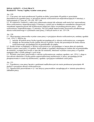 DZIAŁ SZÓSTY - CZAS PRACY Rozdział II - Normy i ogólny wymiar czasu pracy Art. 129. § 1. Czas pracy nie może przekraczać 8 godzin na dobę i przeciętnie 40 godzin w przeciętnie pięciodniowym tygodniu pracy w przyjętym okresie rozliczeniowym nieprzekraczającym 4 miesięcy, z zastrzeżeniem § 2 oraz art. 135-138, 143 i 144. § 2. W rolnictwie i hodowli, a także przy pilnowaniu mienia lub ochronie osób może być wprowadzony okres rozliczeniowy nieprzekraczający 6 miesięcy, a jeżeli jest to dodatkowo uzasadnione nietypowymi warunkami organizacyjnymi lub technicznymi mającymi wpływ na przebieg procesu pracy - okres rozliczeniowy nieprzekraczający 12 miesięcy. Nie jest jednak dopuszczalne stosowanie przedłużonego okresu rozliczeniowego w systemach czasu pracy, o których mowa w art. 135-138. Art. 130. § 1. Obowiązujący pracownika wymiar czasu pracy w przyjętym okresie rozliczeniowym, ustalany zgodnie z art. 129 § 1, oblicza się: 1. mnożąc 40 godzin przez liczbę tygodni przypadających w okresie rozliczeniowym, a następnie 2. dodając do otrzymanej liczby godzin iloczyn 8 godzin i liczby dni pozostałych do końca okresu rozliczeniowego, przypadających od poniedziałku do piątku. § 2. Każde święto występujące w okresie rozliczeniowym i przypadające w innym dniu niż niedziela obniża wymiar czasu pracy o 8 godzin. Jeżeli jednak w tygodniu obejmującym siedem dni od poniedziałku do niedzieli, wystąpią dwa święta w inne dni niż niedziela, obniżenie wymiaru czasu pracy o 8 godzin następuje tylko z tytułu jednego z tych świąt. § 3. Wymiar czasu pracy pracownika w okresie rozliczeniowym, ustalony zgodnie z art. 129 § 1, ulega w tym okresie obniżeniu o liczbę godzin usprawiedliwionej nieobecności w pracy, przypadających do przepracowania w czasie tej nieobecności, zgodnie z przyjętym rozkładem czasu pracy. Art. 131. § 1. Tygodniowy czas pracy łącznie z godzinami nadliczbowymi nie może przekraczać przeciętnie 48 godzin w przyjętym okresie rozliczeniowym. § 2. Ograniczenie przewidziane w § 1 nie dotyczy pracowników zarządzających w imieniu pracodawcy zakładem pracy.