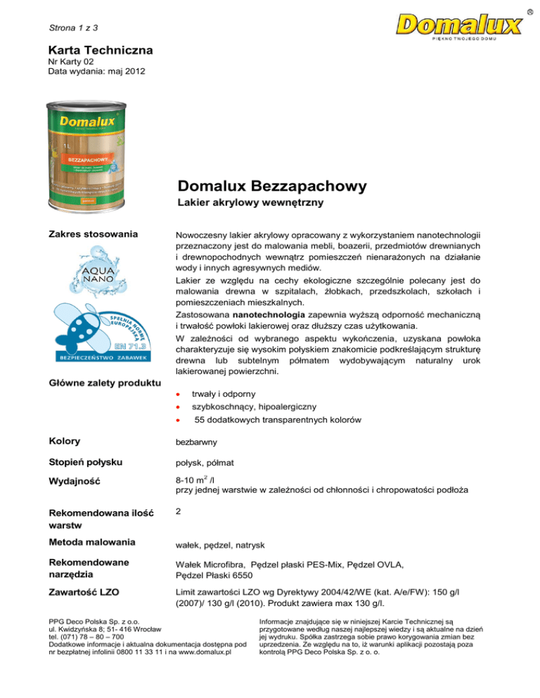 Strona 1 z 3 Karta Techniczna Nr Karty 02 Data wydania: maj 2012 Domalux Bezzapachowy Lakier akrylowy wewnętrzny Zakres stosowania Nowoczesny lakier akrylowy opracowany z wykorzystaniem nanotechnologii przeznaczony jest do malowania mebli, boazerii, przedmiotów drewnianych i drewnopochodnych wewnątrz pomieszczeń nienarażonych na działanie wody i innych agresywnych mediów. Lakier ze względu na cechy ekologiczne szczególnie polecany jest do malowania drewna w szpitalach, żłobkach, przedszkolach, szkołach i pomieszczeniach mieszkalnych. Zastosowana nanotechnologia zapewnia wyższą odporność mechaniczną i trwałość powłoki lakierowej oraz dłuższy czas użytkowania. W zależności od wybranego aspektu wykończenia, uzyskana powłoka charakteryzuje się wysokim połyskiem znakomicie podkreślającym strukturę drewna lub subtelnym półmatem wydobywającym naturalny urok lakierowanej powierzchni. Główne zalety produktu trwały i odporny szybkoschnący, hipoalergiczny 55 dodatkowych transparentnych kolorów Kolory bezbarwny Stopień połysku połysk, półmat Wydajność 8-10 m /l przy jednej warstwie w zależności od chłonności i chropowatości podłoża Rekomendowana ilość warstw 2 Metoda malowania wałek, pędzel, natrysk Rekomendowane narzędzia Wałek Microfibra, Pędzel płaski PES-Mix, Pędzel OVLA, Pędzel Płaski 6550 Zawartość LZO Limit zawartości LZO wg Dyrektywy 2004/42/WE (kat. A/e/FW): 150 g/l (2007)/ 130 g/l (2010). Produkt zawiera max 130 g/l. 2 PPG Deco Polska Sp. z o.o. ul. Kwidzyńska 8; 51- 416 Wrocław tel. (071) 78 – 80 – 700 Dodatkowe informacje i aktualna dokumentacja dostępna pod nr bezpłatnej infolinii 0800 11 33 11 i na www.domalux.pl Informacje znajdujące się w niniejszej Karcie Technicznej są przygotowane według naszej najlepszej wiedzy i są aktualne na dzień jej wydruku. Spółka zastrzega sobie prawo korygowania zmian bez uprzedzenia. Ze względu na to, iż warunki aplikacji pozostają poza kontrolą PPG Deco Polska Sp. z o. o. Strona 2 z 3 Norma/Wytyczne Wartość Ilość warstw --------------------------- 2 Nanoszenie kolejnej warstwy po ok. [h] ---------------------------- 6 Czas wysychania powłoki w temp. 232C i wilgotności względnej powietrza 505%, stopień 3-ci, najwyżej [h] PN-C-81519:1979 5 Gęstość w 20±0,5C, [g/cm ] PN-EN ISO 2811-1 1,000 ÷ 1,050 Rozlewność, stopień, co najmniej PN-C-81507:1989 8 Czas wypływu mierzony kubkiem wypływowym z dnem, stożkowym o średnicy otworu wypływowego 4 mm, [s] PN-C-81701:1997 metoda A 13 ÷ 25 Parametry techniczne 3 Przygotowanie podłoża Lakierowanie Warunki aplikacji Powierzchnia przeznaczona do malowania powinna być czysta, gładka, przeszlifowana papierem ściernym 180-240 i następnie dokładnie oczyszczona z pyłu. Stare powłoki lakierowe należy usunąć. Lakier przed użyciem należy starannie wymieszać w oryginalnym opakowaniu. Stosować w postaci handlowej lub rozcieńczyć woda pitną (max 5%). Po nałożeniu pierwszej warstwy, po czasie co najmniej 6h powierzchnię polakierowaną przeszlifować papierem ściernym o granulacji 180-240, dokładnie odpylić, przetrzeć szmatką, a następnie nałożyć drugą warstwę lakieru. Malować w temperaturze 15 ÷ 25°C. Informacje dodatkowe Uzyskana powłoka znakomicie podkreśla strukturę drewna. Lakier nie nadaje się do malowania podłóg. W tym celu polecane są lakiery do parkietów marki Domalux. W trakcie prac malarskich i po ich zakończeniu pomieszczenia przed użytkowaniem wywietrz do zaniku charakterystycznego zapachu. Końcowe utwardzanie Krótki czas schnięcia umożliwia wykonanie większości prac malarskich w ciągu jednego dnia. Data ważności i warunki 36 miesięcy od daty produkcji przechowywania Wyrób przechowywać w opakowaniach szczelnie zamkniętych. Chronić przed mrozem. Użytkowanie Szczegółowe informacje dotyczące przygotowania podłoża i lakierowania zamieszczone są na stronie internetowej www.domalux.pl Rozcieńczalnik woda PKWiU 20.30.11.0 PPG Deco Polska Sp. z o.o. ul. Kwidzyńska 8; 51- 416 Wrocław tel. (071) 78 – 80 – 700 Dodatkowe informacje i aktualna dokumentacja dostępna pod nr bezpłatnej infolinii 0800 11 33 11 i na www.domalux.pl Informacje znajdujące się w niniejszej Karcie Technicznej są przygotowane według naszej najlepszej wiedzy i są aktualne na dzień jej wydruku. Spółka zastrzega sobie prawo korygowania zmian bez uprzedzenia. Ze względu na to, iż warunki aplikacji pozostają poza kontrolą PPG Deco Polska Sp. z o. o. Strona 3 z 3 Atesty Wskazówki BHP i Ppoż. Opakowania handlowe Wyrób posiada atest PZH Bezpieczeństwo Zabawek (zgodność z normą PN-EN 71-3:1998) Posiada Świadectwo Własności Drażniących i Uczulających (tzw. Hipoalergia) Stosować się do zaleceń podanych na opakowaniu. Szczegółowe informacje zamieszczone są w Karcie Charakterystyki na stronie www.domalux.pl 1 L, 5 L PPG Deco Polska Sp. z o.o. ul. Kwidzyńska 8; 51- 416 Wrocław tel. (071) 78 – 80 – 700 Dodatkowe informacje i aktualna dokumentacja dostępna pod nr bezpłatnej infolinii 0800 11 33 11 i na www.domalux.pl Informacje znajdujące się w niniejszej Karcie Technicznej są przygotowane według naszej najlepszej wiedzy i są aktualne na dzień jej wydruku. Spółka zastrzega sobie prawo korygowania zmian bez uprzedzenia. Ze względu na to, iż warunki aplikacji pozostają poza kontrolą PPG Deco Polska Sp. z o. o.