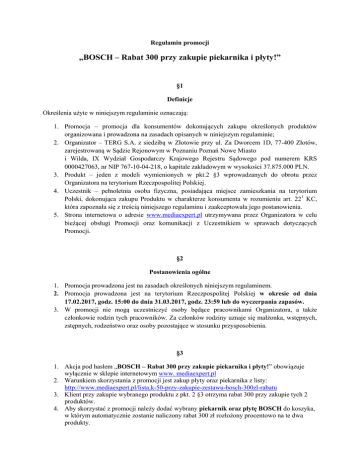 Regulamin promocji „BOSCH – Rabat 300 przy zakupie piekarnika i płyty!” §1 Definicje Określenia użyte w niniejszym regulaminie oznaczają: 1. Promocja – promocja dla konsumentów dokonujących zakupu określonych produktów organizowana i prowadzona na zasadach opisanych w niniejszym regulaminie; 2. Organizator – TERG S.A. z siedzibą w Złotowie przy ul. Za Dworcem 1D, 77-400 Złotów, zarejestrowaną w Sądzie Rejonowym w Poznaniu Poznań Nowe Miasto i Wilda, IX Wydział Gospodarczy Krajowego Rejestru Sądowego pod numerem KRS 0000427063, nr NIP 767-10-04-218, o kapitale zakładowym w wysokości 37.875.000 PLN. 3. Produkt – jeden z modeli wymienionych w pkt.2 §3 wprowadzanych do obrotu przez Organizatora na terytorium Rzeczpospolitej Polskiej. 4. Uczestnik – pełnoletnia osoba fizyczna, posiadająca miejsce zamieszkania na terytorium Polski, dokonująca zakupu Produktu w charakterze konsumenta w rozumieniu art. 22 1 KC, która zapoznała się z treścią niniejszego regulaminu i zaakceptowała jego postanowienia. 5. Strona internetowa o adresie www.mediaexpert.pl utrzymywana przez Organizatora w celu bieżącej obsługi Promocji oraz komunikacji z Uczestnikiem w sprawach dotyczących Promocji. §2 Postanowienia ogólne 1. Promocja prowadzona jest na zasadach określonych niniejszym regulaminem. 2. Promocja prowadzona jest na terytorium Rzeczpospolitej Polskiej w okresie od dnia 17.02.2017, godz. 15:00 do dnia 31.03.2017, godz. 23:59 lub do wyczerpania zapasów. 3. W promocji nie mogą uczestniczyć osoby będące pracownikami Organizatora, a także członkowie rodzin tych pracowników. Za członków rodziny uznaje się małżonka, wstępnych, zstępnych, rodzeństwo oraz osoby pozostające w stosunku przysposobienia. §3 1. Akcja pod hasłem „BOSCH – Rabat 300 przy zakupie piekarnika i płyty!” obowiązuje wyłącznie w sklepie internetowym www. mediaexpert.pl 2. Warunkiem skorzystania z promocji jest zakup płyty oraz piekarnika z listy: http://www.mediaexpert.pl/lista,k-50-przy-zakupie-zestawu-bosch-300zl-rabatu 3. Klient przy zakupie wybranego produktu z pkt. 2 §3 otrzyma rabat 300 przy zakupie tych 2 produktów. 4. Aby skorzystać z promocji należy dodać wybrany piekarnik oraz płytę BOSCH do koszyka, w którym automatycznie zostanie naliczony rabat 300 zł rozłożony procentowo na te dwa produkty. 5. W przypadku zwrotu zakupionego produktu, zwrotowi podlegają oba produkty. 6. W przypadku zakupu na raty w okresie obowiązywania akcji warunkiem skorzystania z aktualnych promocji ratalnych jest indywidualna ocena zdolności kredytowej Klienta przez bank. W przypadku negatywnej odpowiedzi banku na wniosek kredytowy Klienta zostaną zaproponowane inne alternatywne formy płatności. (Wysokość rat zaprezentowanych w akcji nie zawiera ubezpieczenia. RRSO dla kredytu w opcji bez ubezpieczenia wynosi 0%. Minimalna wartość brutto towaru nabywanego w systemie ratalnym wynosi 100zł. Ubezpieczenie spłaty kredytu ma charakter dobrowolny i stanowi zabezpieczenie pożyczki/kredytu w momencie zgody Klienta na zawarcie umowy ubezpieczenia kredytu. Stopa procentowa dla kredytu 0% w zakresie od 3 do 40 miesięcy wynosi od 0% do 32,6% w zależności od wybranego banku i rodzaju ubezpieczenia.) 7. Materiały reklamowe zaprezentowane na stronie www.mediaexpert.pl nie stanowią oferty w rozumieniu art.66§ 1K.C §4 Reklamacje 1. Reklamacje związane z Promocją mogą być zgłaszane mailowo na adres: [email protected]., przez cały czas trwania promocji, jednak nie później niż w terminie 21 dni od dnia jej zakończenia. 2. Reklamacje spóźnione nie będą rozpatrywane. Organizator rozpatruje reklamacje oraz przekazuje informacje zainteresowanemu w terminie do 14 (czternastu) dni od daty wpłynięcia reklamacji. Za przekazanie odpowiedzi na reklamację w terminie 14 uznaje się wysłanie listu poleconego w tym terminie. §5 Ochrona danych osobowych 1. Administratorem danych osobowych jest Organizator. 2. Dane osobowe Uczestników przetwarzane będą przy zachowaniu zasad określonych w ustawie z dnia 29 sierpnia 1997 r. o ochronie danych osobowych (Dz. U. 2002 Nr 101 poz. 926 z póź. zm.) w celu przeprowadzenia Promocji i wyłonienia osób nagrodzonych. Podanie danych osobowych jest dobrowolne, jednak jest niezbędne w celu wzięcia udziału w Promocji, przyznania i odbioru nagród i prezentów. Uczestnikowi przysługuje prawo wglądu do danych osobowych, ich poprawiania oraz żądania ich usunięcia. 3. Przetwarzanie danych osobowych obejmować będzie zakres danych wskazanych w formularzu rejestracyjnym. Za odrębną zgodą Uczestnika wyrażoną w zgłoszeniu Organizatorowi przysługiwać będzie prawo do przetwarzania danych osobowych w celach marketingowych oraz prawo przesyłania informacji handlowej drogą elektroniczną. 4. Uczestnik jest zobowiązany do informowania Organizatora na piśmie o każdej zmianie w zakresie danych osobowych. Niezależnie od innych postanowień niniejszego regulaminu, w przypadku nie dokonania aktualizacji danych osobowych przez Uczestnika Organizator nie ponosi odpowiedzialności za opóźnienie lub brak działania spowodowany brakiem takiej aktualizacji, a w szczególności za niemożność wydania nagrody w konkursie lub prezentu. §7 Postanowienia końcowe 1. Regulamin wchodzi w życie z dniem 17.02.2017 i będzie dostępny w okresie trwania Promocji w siedzibie Organizatora oraz na Stronie internetowej: http://www.mediaexpert.pl/lp,k-50-przy-zakupie-zestawu-bosch-300zl-rabatu 2. Tytuły poszczególnych punktów regulaminu mają charakter informacyjny i nie stanowią części regulaminu. 3. We wszystkich sprawach dotyczących Promocji, a nieuregulowanych regulaminem mają zastosowanie przepisy prawa polskiego. 4. Niniejsza Promocja nie jest grą losową ani zakładem wzajemnym, których wynik zależy od przypadku (przeprowadzenie losowania) w rozumieniu art. 2 ustawy z dnia 19 listopada 2009 roku o grach hazardowych (Dz. U. N