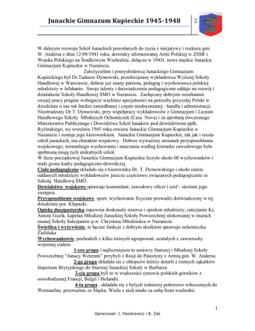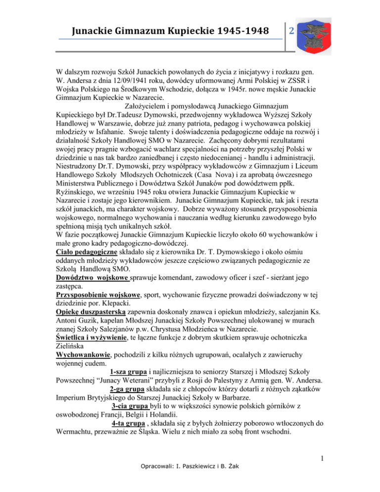 Junackie Gimnazum Kupieckie 1945-1948 2009 W dalszym rozwoju Szkół Junackich powołanych do życia z inicjatywy i rozkazu gen. W. Andersa z dnia 12/09/1941 roku, dowódcy uformowanej Armi Polskiej w ZSSR i Wojska Polskiego na Środkowym Wschodzie, dołącza w 1945r. nowe męskie Junackie Gimnazjum Kupieckie w Nazarecie. Założycielem i pomysłodawcą Junackiego Gimnazjum Kupieckiego był Dr.Tadeusz Dymowski, przedwojenny wykładowca Wyższej Szkoły Handlowej w Warszawie, dobrze już znany patriota, pedagog i wychowawca polskiej młodzieży w Isfahanie. Swoje talenty i doświadczenia pedagogiczne oddaje na rozwój i działalność Szkoły Handlowej SMO w Nazarecie. Zachęcony dobrymi rezultatami swojej pracy pragnie wzbogacić wachlarz specjalności na potrzeby przyszłej Polski w dziedzinie u nas tak bardzo zaniedbanej i często niedocenianej - handlu i administracji. Niestrudzony Dr.T. Dymowski, przy współpracy wykładowców z Gimnazjum i Liceum Handlowego Szkoły Młodszych Ochotniczek (Casa Nova) i za aprobatą ówczesnego Ministerstwa Publicznego i Dowództwa Szkół Junaków pod dowództwem ppłk. Ryźinskiego, we wrześniu 1945 roku otwiera Junackie Gimnazjum Kupieckie w Nazarecie i zostaje jego kierownikiem. Junackie Gimnazjum Kupieckie, tak jak i reszta szkół junackich, ma charakter wojskowy. Dobrze wyważony stosunek przysposobienia wojskowego, normalnego wychowania i nauczania według kierunku zawodowego było spełnioną misją tych unikalnych szkół. W fazie początkowej Junackie Gimnazjum Kupieckie liczyło około 60 wychowanków i małe grono kadry pedagogiczno-dowódczej. Ciało pedagogiczne składało się z kierownika Dr. T. Dymowskiego i około ośmiu oddanych młodzieży wykładowców jeszcze częściowo związanych pedagogicznie ze Szkolą Handlową SMO. Dowództwo wojskowe sprawuje komendant, zawodowy oficer i szef - sierżant jego zastępca. Przysposobienie wojskowe, sport, wychowanie fizyczne prowadzi doświadczony w tej dziedzinie por. Klepacki. Opiekę duszpasterską zapewnia doskonały znawca i opiekun młodzieży, salezjanin Ks. Antoni Guzik, kapelan Młodszej Junackiej Szkoły Powszechnej ulokowanej w murach znanej Szkoły Salezjanów p.w. Chrystusa Młodzieńca w Nazarecie. Świetlica i wyżywienie, te łączne funkcje z dobrym skutkiem sprawuje ochotniczka Zielińska Wychowankowie, pochodzili z kilku różnych ugrupowań, ocalałych z zawieruchy wojennej cudem. 1-sza grupa i najliczniejsza to seniorzy Starszej i Młodszej Szkoły Powszechnej “Junacy Weterani” przybyli z Rosji do Palestyny z Armią gen. W. Andersa. 2-ga grupa składała sie z chłopców którzy dotarli z różnych ząkatków Imperium Brytyjskiego do Starszej Junackiej Szkoły w Barbarze. 3-cia grupa byli to w większości synowie polskich górników z oswobodzonej Francji, Belgii i Holandii. 4-ta grupa , składała się z byłych żołnierzy poborowo wtłoczonych do Wermachtu, przeważnie ze Śląska. Wielu z nich miało za sobą front wschodni. 1 Opracowali: I. Paszkiewicz i B. Żak Junackie Gimnazum Kupieckie 1945-1948 2009 5-ta grupa to przymusowi robotnicy organizacji TOT-a zmuszeni do ciężkiej pracy fizycznej przy niemieckich umocnieniach frontowych. 6-ta grupa - i najmniejsza - to młodzi żołnierze odkomenderowani z 2-go Korpusu celem dokończenia nauki. W tak niesamowitym zbiorowisku chłopców o krańcowo różnorakim pochodzeniu, wykształceniu i przeszłości, wychowawcy i wychowankowie mieli bardzo duże trudności we wzajemnym zharmonizowaniu i wypracowaniu wspólnego etosu, godnego przyszłego obywatela, świadomego swoich obowiazków w ofiarnej służbie Polsce. Początkowo, szkołę umieszczono w klasztorze oddanym na użytek wojska, potocznie zwanym Officers’ Mess. Ten wspaniały budynek był zbudowany z palestyńskiego, charakterystycznie ciosanego kamienia w lokalnym stylu, z lekką ornamentyką sakralną świadczącą o jego przeznaczeniu. Splendoru dodawał otacząjacy dookoła niewielki, ale bardzo miły, cieniem kojący w czasie upałów sosnowy las. Liczne klasztorne komnaty (cele) były zamienione na klasy i sypialnie kadry i junaków. Dwie większe sale służyły jako jadalnia i świetlica. Warunki do nauki były idealne. Zwłaszcza dla tych, którzy ostatnie 2 lata przetrwali obozowe życie w namiotach ustawionych na szarej pustyni. W miarę upływu czasu wstępne zgrzyty pomiędzy poszczególnymi grupami ustępowały. Rozwijało się koleżeństwo, zawierały przyjaźnie. Budziła się ufność i zrozumienie pomiędzy wychowawcami a wychowankami. Ułatwiało to skuteczne przerabianie ułożonego programu nauki, zwłaszcza dla klas o przyspieszonym kursie ukierunkowanym do nadrobienia spowodowanych wojną zaległości w nauce. Wreszcie szkoła nabierała wigoru i swoistego charakteru, oraz atmosfery rodziny. Coraz liczniej zaczęli napływać do J.G.K. junacy ze szkół mechanicznych i ogólnokształcącej-kadeckiej, którym obrany kierunek nauki nie odpowiadał. W murach szkoły Officers’ Mess stawało się coraz to ciaśniej. W rezultacie, z początkiem stycznia 1946 roku następuje przeniesienie J.G.K. do znacznie większego pomieszczenia, a mianowicie do Szkoły Salezjanów p.w. Chrystusa Młodzieńca uprzednio użytkowanej przez Młodszą Junacką Szkołę Powszechną, aż do chwili jej ukończenia przez większość tam zakwaterowanych junaków. Wraz z przejęciem kompleksu zabudowań, szkoła J.G.K. odziedzicza znaczną część personelu wychowawczo-opiekuńczego i całe zaplecze gospodarczozaopatrzeniowe z opieką medyczną włacznie. Ten imponujacy wyglądem gmach szkoły i zarazem klasztor otoczony sosnowym lasem mieścił się na dominującym wzgórzu Nazaretu. Architektonicznie stanowił zwięzłą całość. Trzypiętrową kondygnację na prawym skrzydle uzupełniał piękny kościół w stylu wschodnio-gotyckim. Wsparte na kolumnach stropy werandy na pierwszym piętrze i parterze nadawały budowli lekkości i majeststu. Tu warunki