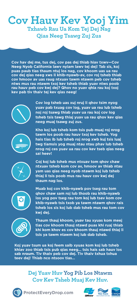 Cov Hauv Kev Yooj Yim Txhawb Rau Ua Kom Tej Dej Nag Qias Neeg Tsawg Zuj Zus Cov hav dej me, tus dej, cov pas dej thiab hiav txwv—Cov Neeg Nyob California lawv nyiam lawv tej dej! Tab sis, koj puas paub tias thaum ntuj los nag, cov khoom uas ua rau cov dej qias neeg xws li khib-nyawb-av, cov roj tsheb thiab cov hmoov av uas raug ntxuav tawm ntawm peb cov tsheb ntws mus rau ntawm txoj kev tsheb thiab yuav ntws poob rau hauv peb cov kwj dej? Qhov no yuav qhia rau koj txoj kev pab tiv thaiv tej kev qias neeg! Cov log tsheb uas xuj nruj li qhov tsim nyog yuav pab txuag cov log, yuav ua rau lub tsheb noj roj tsawg thiab yuav ua rau koj cov log tsheb tsis tawg thiaj yuav ua rau qhov kev qias neeg muaj tsawg zuj zus. Kho koj lub tsheb kom tsis pub muaj roj nrog tawm los poob rau hauv txoj kev tsheb. Yog hais tias ib lub tsheb roj nrog xwb kuj tsis luaj twg tiamsis yog muaj ntau ntau phav lub tsheb nrog roj ces yuav ua rau cov kev tseb qias neeg sai heev! Coj koj lub tsheb mus ntxuav tom qhov chaw ntxuav tsheb kom cov av, hmoov av thiab ntau yam uas qias neeg nyob ntawm koj lub tsheb thiaj li tsis poob mus rau hauv cov kwj dej thaum nag los. Muab koj cov khib-nyawb pov tseg rau tom qhov chaw sam roj lub thoob rau khib-nyawb los yog pov tseg rau tom koj lub tsev kom cov khib-nyawb tsis txob ya tawm ntawm qhov rais tsheb los sis koj lub dab tsheb mus rau tom cov kwj dej. Thaum thauj khoom, yuav tau xyuas kom meej tias cov khoom thauj ntawd puas khi ruaj thiab khi kom khov es cov khoom thauj ntawd thiaj li tsis ya tawm ntawm koj lub dab tsheb. Koj yuav tsum ua koj feem saib xyuas kom koj lub tsheb khiav zoo thiab tsis pub qias neeg… tsis hais sab hauv los sab nraum. Tiv thaiv peb cov dej. Tiv thaiv txhua txhua teev dej! Thiab nco ntsoov tias… Dej Yuav Huv Yog Pib Los Ntawm Cov Kev Tsheb Muaj Kev Huv. ProtectEveryDrop.com