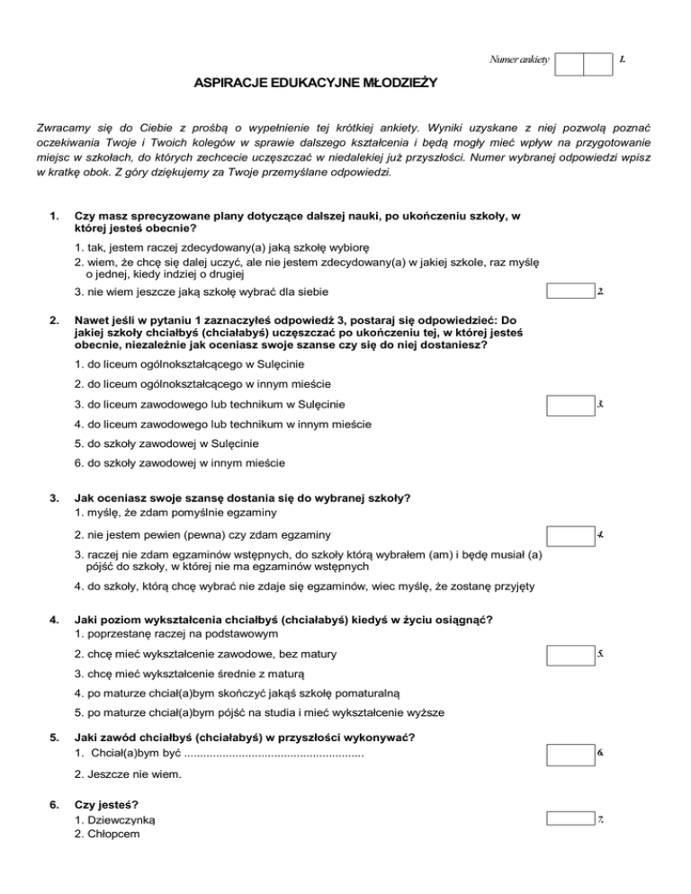 Numer ankiety 1. ASPIRACJE EDUKACYJNE MŁODZIEŻY Zwracamy się do Ciebie z prośbą o wypełnienie tej krótkiej ankiety. Wyniki uzyskane z niej pozwolą poznać oczekiwania Twoje i Twoich kolegów w sprawie dalszego kształcenia i będą mogły mieć wpływ na przygotowanie miejsc w szkołach, do których zechcecie uczęszczać w niedalekiej już przyszłości. Numer wybranej odpowiedzi wpisz w kratkę obok. Z góry dziękujemy za Twoje przemyślane odpowiedzi. 1. Czy masz sprecyzowane plany dotyczące dalszej nauki, po ukończeniu szkoły, w której jesteś obecnie? 1. tak, jestem raczej zdecydowany(a) jaką szkołę wybiorę 2. wiem, że chcę się dalej uczyć, ale nie jestem zdecydowany(a) w jakiej szkole, raz myślę o jednej, kiedy indziej o drugiej 3. nie wiem jeszcze jaką szkołę wybrać dla siebie 2. 2. Nawet jeśli w pytaniu 1 zaznaczyłeś odpowiedź 3, postaraj się odpowiedzieć: Do jakiej szkoły chciałbyś (chciałabyś) uczęszczać po ukończeniu tej, w której jesteś obecnie, niezależnie jak oceniasz swoje szanse czy się do niej dostaniesz? 1. do liceum ogólnokształcącego w Sulęcinie 2. do liceum ogólnokształcącego w innym mieście 3. do liceum zawodowego lub technikum w Sulęcinie 3. 4. do liceum zawodowego lub technikum w innym mieście 5. do szkoły zawodowej w Sulęcinie 6. do szkoły zawodowej w innym mieście 3. Jak oceniasz swoje szansę dostania się do wybranej szkoły? 1. myślę, że zdam pomyślnie egzaminy 2. nie jestem pewien (pewna) czy zdam egzaminy 4. 3. raczej nie zdam egzaminów wstępnych, do szkoły którą wybrałem (am) i będę musiał (a) pójść do szkoły, w której nie ma egzaminów wstępnych 4. do szkoły, którą chcę wybrać nie zdaje się egzaminów, wiec myślę, że zostanę przyjęty 4. Jaki poziom wykształcenia chciałbyś (chciałabyś) kiedyś w życiu osiągnąć? 1. poprzestanę raczej na podstawowym 2. chcę mieć wykształcenie zawodowe, bez matury 5. 3. chcę mieć wykształcenie średnie z maturą 4. po maturze chciał(a)bym skończyć jakąś szkołę pomaturalną 5. po maturze chciał(a)bym pójść na studia i mieć wykształcenie wyższe 5. Jaki zawód chciałbyś (chciałabyś) w przyszłości wykonywać? 1. Chciał(a)bym być ........................................................ 6. 2. Jeszcze nie wiem. 6. Czy jesteś? 1. Dziewczynką 2. Chłopcem 7. 7. Do jakiej szkoły uczęszczasz? 1. do gimnazjum 8. 2. do szkoły średniej 8. Jakie jest wykształcenie Twojej mamy? 1, podstawowe 2. zawodowe 9. 3. średnie 4. pomaturalne 5. wyższe 6. nie wiem 9. Jakie jest wykształcenie Twojego taty? 1. podstawowe 2. zawodowe 3. średnie 10. 4. pomaturalne 5. wyższe 6. nie wiem 10. Czy Twoja mama pracuje? 1. tak (pomiń pytanie 12) 11. 2. nie 11. Czy Twój tata pracuje? 1. tak (pomiń pytanie 13) 12. 2. nie 12. Jeżeli Twoja mama nie pracuje, to kim jest? 1. jest bezrobotna 2. jest gospodynią domową 13. 3. jest na rencie 4. jest na urlopie wychowawczym 5. jest w innej sytuacji 13. Jeżeli Twój tata nie pracuje, to kim jest? 1. jest bezrobotny 2. nie mam taty lub on ze mną nie mieszka 14. 3. jest na rencie 4. nie wiem co robi 5. jest w innej sytuacji 14. Jaką ocenę uzyskałeś(łaś) na ostatni semestr z języka polskiego? 15. z matematyki? 16.