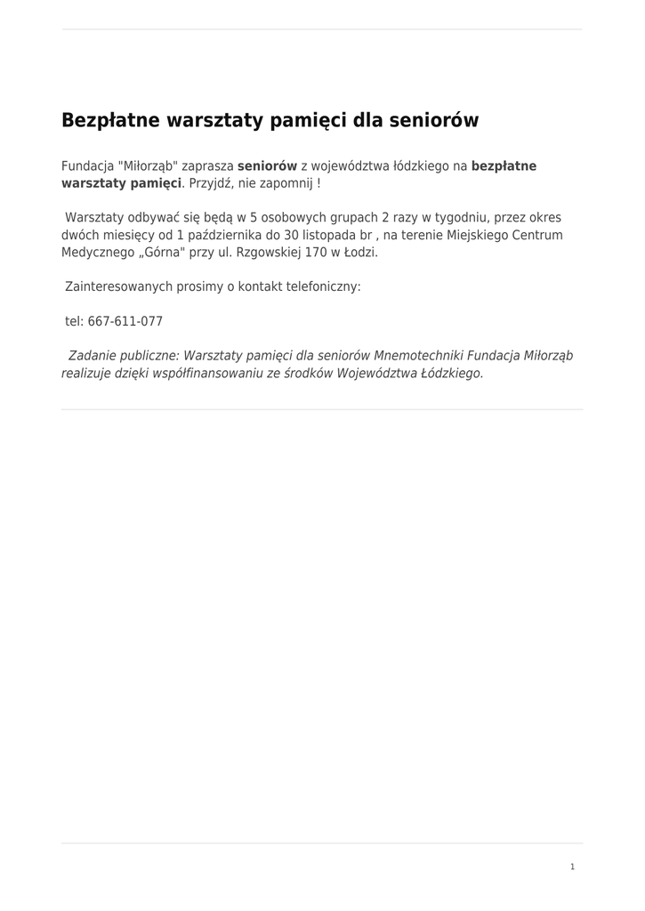 Bezpłatne warsztaty pamięci dla seniorów Fundacja "Miłorząb" zaprasza seniorów z województwa łódzkiego na bezpłatne warsztaty pamięci. Przyjdź, nie zapomnij ! Warsztaty odbywać się będą w 5 osobowych grupach 2 razy w tygodniu, przez okres dwóch miesięcy od 1 października do 30 listopada br , na terenie Miejskiego Centrum Medycznego „Górna" przy ul. Rzgowskiej 170 w Łodzi. Zainteresowanych prosimy o kontakt telefoniczny: tel: 667-611-077 Zadanie publiczne: Warsztaty pamięci dla seniorów Mnemotechniki Fundacja Miłorząb realizuje dzięki współfinansowaniu ze środków Województwa Łódzkiego. 1