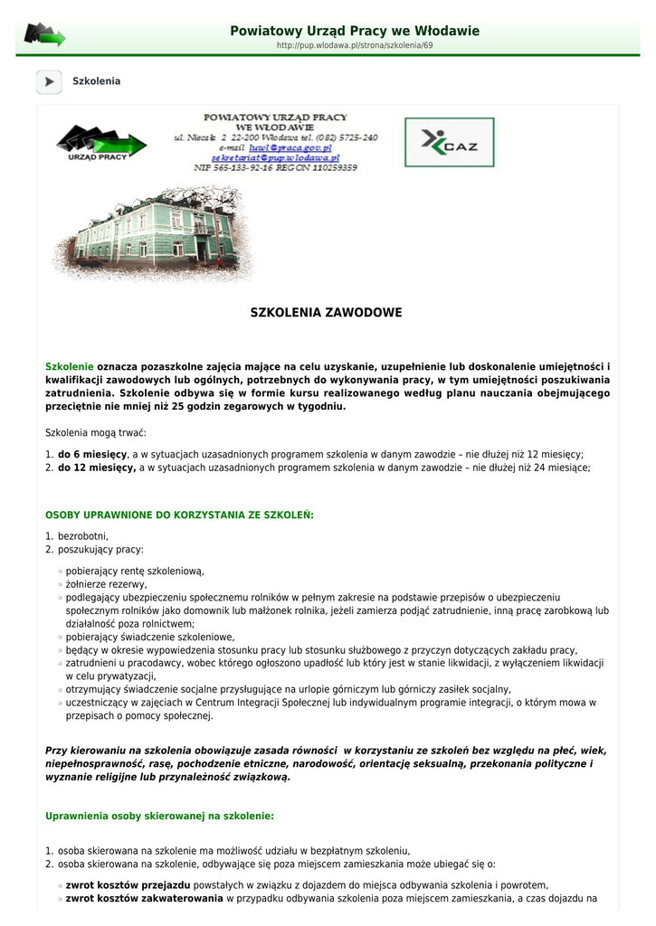 Powiatowy Urząd Pracy we Włodawie http://pup.wlodawa.pl/strona/szkolenia/69 Szkolenia SZKOLENIA ZAWODOWE Szkolenie oznacza pozaszkolne zajęcia mające na celu uzyskanie, uzupełnienie lub doskonalenie umiejętności i kwalifikacji zawodowych lub ogólnych, potrzebnych do wykonywania pracy, w tym umiejętności poszukiwania zatrudnienia. Szkolenie odbywa się w formie kursu realizowanego według planu nauczania obejmującego przeciętnie nie mniej niż 25 godzin zegarowych w tygodniu. Szkolenia mogą trwać: 1. do 6 miesięcy, a w sytuacjach uzasadnionych programem szkolenia w danym zawodzie – nie dłużej niż 12 miesięcy; 2. do 12 miesięcy, a w sytuacjach uzasadnionych programem szkolenia w danym zawodzie – nie dłużej niż 24 miesiące; OSOBY UPRAWNIONE DO KORZYSTANIA ZE SZKOLEŃ: 1. bezrobotni, 2. poszukujący pracy: ❍ ❍ ❍ ❍ ❍ ❍ ❍ ❍ pobierający rentę szkoleniową, żołnierze rezerwy, podlegający ubezpieczeniu społecznemu rolników w pełnym zakresie na podstawie przepisów o ubezpieczeniu społecznym rolników jako domownik lub małżonek rolnika, jeżeli zamierza podjąć zatrudnienie, inną pracę zarobkową lub działalność poza rolnictwem; pobierający świadczenie szkoleniowe, będący w okresie wypowiedzenia stosunku pracy lub stosunku służbowego z przyczyn dotyczących zakładu pracy, zatrudnieni u pracodawcy, wobec którego ogłoszono upadłość lub który jest w stanie likwidacji, z wyłączeniem likwidacji w celu prywatyzacji, otrzymujący świadczenie socjalne przysługujące na urlopie górniczym lub górniczy zasiłek socjalny, uczestniczący w zajęciach w Centrum Integracji Społecznej lub indywidualnym programie integracji, o którym mowa w przepisach o pomocy społecznej. Przy kierowaniu na szkolenia obowiązuje zasada równości w korzystaniu ze szkoleń bez względu na płeć, wiek, niepełnosprawność, rasę, pochodzenie etniczne, narodowość, orientację seksualną, przekonania polityczne i wyznanie religijne lub przynależność związkową. Uprawnienia osoby skierowanej na szkolenie: 1. osoba skierowana na szkolenie ma możliwość udziału w bezpłatnym szkoleniu, 2. osoba skierowana na szkolenie, odbywające się poza miejscem zamieszkania może ubiegać się o: ❍ ❍ zwrot kosztów przejazdu powstałych w związku z dojazdem do miejsca odbywania szkolenia i powrotem, zwrot kosztów zakwaterowania w przypadku odbywania szkolenia poza miejscem zamieszkania, a czas dojazdu na ❍ ❍ szkolenie i powrotu wynosi łącznie ponad 3 godziny dziennie, stypendium szkoleniowe (bezrobotnemu uprawnionemu w tym samym okresie do stypendium oraz zasiłku przysługuje prawo wyboru świadczenia) przyznawane na okres od dnia rozpoczęcia do dnia zakończenia uczestnictwa w szkoleniu, wysokość stypendium wynosi miesięcznie 120 % zasiłku, o którym mowa w art. 72 ust. 1 pkt 1, jeżeli miesięczny wymiar godzin szkolenia wynosi co najmniej 150 godzin; w przypadku niższego miesięcznego wymiaru godzin szkolenia wysokość stypendium ustala się proporcjonalnie, z tym że stypendium nie może być niższe niż 20 % zasiłku, o którym mowa w art. 72 ust. 1 pkt 1. bezrobotnemu, który w trakcie szkolenia podjął zatrudnienie, inną pracę zarobkową lub działalność gospodarczą, przysługuje stypendium w wysokości 20 % zasiłku, o którym mowa w art. 72 ust. 1 pkt 1, niezależnie od wymiaru godzin szkolenia, od dnia podjęcia zatrudnienia, innej pracy zarobkowej lub działalności gospodarczej do dnia zakończenia szkolenia Szkolenia grupowe Szkolenia grupowe organizowane są z inicjatywy Urzędu w oparciu o roczny Plan szkoleń., zawierający w szczególności: ● ● ● ● ● ● nazwę i zakres, liczbę miejsc dla uczestników szkoleń, przewidywany termin realizacji i orientacyjny czas trwania szkoleń w godzinach, charakterystykę osób, dla których szkolenie jest przeznaczone, informację o egzaminie zewnętrznym , jeżeli jest przewidziany, rodzaj zaświadczenia , lub innego dokumentu potwierdzającego ukończenie szkolenia i uzyskanie kwalifikacji lub uprawnień. Plan szkoleń upowszechniony jest na tablicy ogłoszeń w siedzibie urzędu oraz na stronie internetowej urzędu ww.pup.wlodawa.pl. Szkolenia indywidualne ● ● szkolenia indywidualne organizowane są na wniosek osoby uprawnionej, jeżeli uzasadni ona celowość tego szkolenia, a koszt szkolenia nie przekroczy 300% przeciętnego wynagrodzenia. Uwaga : Osoba, która z własnej winy nie ukończyła szkolenia, jest obowiązana do zwrotu kosztów szkolenia, z wyjątkiem przypadku, gdy przyczyną nieukończenia szkolenia było podjęcie zatrudnienia , innej pracy zarobkowej lub działalności gospodarczej. Bazy danych standardów kwalifikacji zawodowych i modułowych programów szkolenia Rejestr Instytucji Szkoleniowych Dodatkowe informacje: osobiście w siedzibie PUP – pok. 22, tel. 082 572-50-60 tel. 082 572 52 40 wew. 177, e-mail: [email protected]
