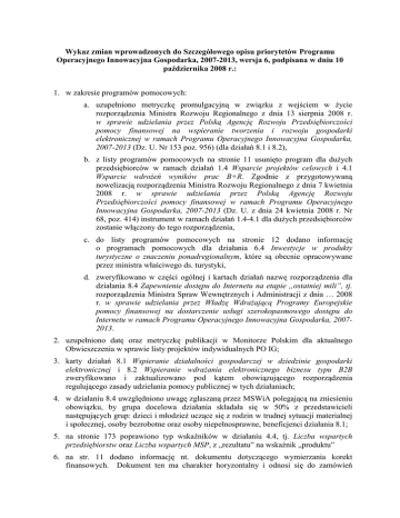 Wykaz zmian wprowadzonych do Szczegółowego opisu priorytetów Programu Operacyjnego Innowacyjna Gospodarka, 2007-2013, wersja 6, podpisana w dniu 10 października 2008 r.: 1. w zakresie programów pomocowych: a. uzupełniono metryczkę promulgacyjną w związku z wejściem w Ŝycie rozporządzenia Ministra Rozwoju Regionalnego z dnia 13 sierpnia 2008 r. w sprawie udzielania przez Polską Agencję Rozwoju Przedsiębiorczości pomocy finansowej na wspieranie tworzenia i rozwoju gospodarki elektronicznej w ramach Programu Operacyjnego Innowacyjna Gospodarka, 2007-2013 (Dz. U. Nr 153 poz. 956) (dla działań 8.1 i 8.2), b. z listy programów pomocowych na stronie 11 usunięto program dla duŜych przedsiębiorców w ramach działań 1.4 Wsparcie projektów celowych i 4.1 Wsparcie wdroŜeń wyników prac B+R. Zgodnie z przygotowywaną nowelizacją rozporządzenia Ministra Rozwoju Regionalnego z dnia 7 kwietnia 2008 r. w sprawie udzielania przez Polską Agencję Rozwoju Przedsiębiorczości pomocy finansowej w ramach Programu Operacyjnego Innowacyjna Gospodarka, 2007-2013 (Dz. U. z dnia 24 kwietnia 2008 r. Nr 68, poz. 414) instrument w ramach działań 1.4-4.1 dla duŜych przedsiębiorców zostanie włączony do tego rozporządzenia, c. do listy programów pomocowych na stronie 12 dodano informację o programach pomocowych dla działania 6.4 Inwestycje w produkty turystyczne o znaczeniu ponadregionalnym, które są obecnie opracowywane przez ministra właściwego ds. turystyki, d. zweryfikowano w części ogólnej i kartach działań nazwę rozporządzenia dla działania 8.4 Zapewnienie dostępu do Internetu na etapie „ostatniej mili”, tj. rozporządzenia Ministra Spraw Wewnętrznych i Administracji z dnia … 2008 r. w sprawie udzielania przez Władzę WdraŜającą Programy Europejskie pomocy finansowej na dostarczenie usługi szerokopasmowego dostępu do Internetu w ramach Programu Operacyjnego Innowacyjna Gospodarka, 20072013. 2. uzupełniono datę oraz metryczkę publikacji w Monitorze Polskim dla aktualnego Obwieszczenia w sprawie listy projektów indywidualnych PO IG; 3. karty działań 8.1 Wspieranie działalności gospodarczej w dziedzinie gospodarki elektronicznej i 8.2 Wspieranie wdraŜania elektronicznego biznesu typu B2B zweryfikowano i zaktualizowano pod kątem obowiązującego rozporządzenia regulującego zasady udzielania pomocy publicznej w tych działaniach; 4. w działaniu 8.4 uwzględniono uwagę zgłaszaną przez MSWiA polegającą na zniesieniu obowiązku, by grupa docelowa działania składała się w 50% z przedstawicieli następujących grup: dzieci i młodzieŜ uczące się z rodzin w trudnej sytuacji materialnej i społecznej, osoby bezrobotne oraz osoby niepełnosprawne, beneficjenci działania 8.1; 5. na stronie 173 poprawiono typ wskaźników w działaniu 4.4, tj. Liczba wspartych przedsiębiorstw oraz Liczba wspartych MSP, z „rezultatu” na wskaźnik „produktu” 6. na str. 11 dodano informację nt. dokumentu dotyczącego wymierzania korekt finansowych. Dokument ten ma charakter horyzontalny i odnosi się do zamówień publicznych realizowanych w ramach projektów współfinansowanych z funduszy strukturalnych oraz Funduszu Spójności w perspektywie finansowej 2007-2013. Zgodnie z zaleceniami ETO i KE, zawiera wyraŜone procentowo wielkości korekt finansowych przypisane konkretnym rodzajom naruszeń prawa zamówień publicznych oraz metodologię obliczania kwot tychŜe korekt, słuŜyć ma koordynacji i ujednoliceniu sposobu postępowania w przypadku wykrycia naruszeń przepisów prawa zamówień publicznych. W dokumencie przyjęto podstawowe załoŜenie, zgodnie z którym wskazane poziomy korekt powinny znaleźć zastosowanie jedynie w odniesieniu do tych przypadków naruszeń przepisów prawa zamówień publicznych, w których nie jest moŜliwe oszacowanie nieprawidłowo wydatkowanej kwoty. JeŜeli natomiast oszacowanie kwoty nieprawidłowości jest moŜliwe, wielkość korekty powinna być równa ww. kwocie. Celem dokumentu nie jest wprowadzenie dodatkowego rodzaju kontroli ani dodatkowych obciąŜeń finansowych dla beneficjentów. „Taryfikator” będzie stosowany przez Instytucje Zarządzające, Pośredniczące i WdraŜające wszystkich programów realizowanych w ramach Podstaw Wsparcia Wspólnoty oraz Narodowych Strategicznych Ram Odniesienia podczas kontroli przestrzegania przez beneficjentów przepisów prawa zamówień publicznych. 7. w wyniku weryfikacji pierwszych Planów Działań w ramach pomocy technicznej PO IG, zidentyfikowano konieczność uaktualnienia listy wskaźników celem przystosowania zakresu wskaźników do działań realizowanych przez Beneficjentów pomocy technicznej PO IG. W związku z powyŜszym lista wskaźników do priorytetu 9. Pomoc techniczna została zmieniona. 8. Zmiany do Załącznika 4.3 PO IG - Opis systemu wdraŜania działań. a) Działanie 4.4 Doprecyzowano informację w zakresie terminów dokonywania poszczególnych etapów oceny projektów – informacja o nie wliczaniu do ww. terminów czasu na ewentualne uzupełnienie wniosku przez wnioskodawców/ przygotowywanie wyjaśnień, zgodnie z regulaminem przeprowadzania konkursu i oceny projektów dla działania 4.4 PO IG. b) Działania: 5.1, 5.2 i 5.4 Dostosowano treść opisu systemu wdraŜania - w zakresie informacji na temat sposobów udzielania wsparcia (refundacja/zaliczka) do stanu faktycznego, zgodnie z informacją w kartach działań dla odnośnych działań PO IG. 9. Zmiany do Załącznika 4.4 PO IG - Procedura odwoławcza w ramach PO IG. Wszystkie zmiany w procedurze wynikają ze zmiany Wytycznych w zakresie procedury odwoławczej dla wszystkich programów operacyjnych z dnia 9 września 2008r. (Wytyczne obowiązują od 18.09.2008r.). Wykaz zmian: §1 -dostosowano datę Wytycznych w zakresie procedury odwoławczej dla wszystkich programów operacyjnych – zmiana na 9 września 2008r. §4 - w punkcie 2 dodano fragment: Dokument przesłany faksem 