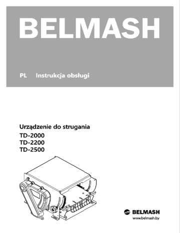 1 SPIS TREŚCI Wstęp 1. Ogólna informacja 2. Podstawowe parametry i charakterystyka techniczna 3. Zawartość dostarczonego zestawu 4. Budowa 5. Montaż i sposób użycia 6. Przygotowanie do użytkowania 6.1 Ustawienie noży 6.2 Złożenie i montaż 6.3 Ustawienie skali 7. Przygotowanie urządzenia 8. Zasady bezpieczeństwa 9. Obsługa techniczna 10. Warunki gwarancji Formularz gwarancyjny Formularz sprzedaży 3 4 4 5 5 6 7 7 7 9 9 10 10 11 11 13 16 Niniejsza instrukcja obsługi opisuje zasady bezpiecznego korzystania z Urządzenia do strugania TD. Przed rozpoczęciem pracy należy się z nią zapoznać. W przypadku nieprzestrzegania zasad bezpieczeństwa, urządzenie może niekorzystnie wpływać na zdrowie i życie człowieka (szum, wibracje, pył, opiłki). Przestrzeganie zasad opisanych w niniejszej instrukcji gwarantuje własne bezpieczeństwo. Przy zakupie urządzenia należy koniecznie sprawdzić czy formularz sprzedaży został wypełniony przez firmę sprzedającą urządzenie, oraz czy posiada pieczątkę sklepu i datę sprzedaży. Należy również sprawdzić zawartość zestawu. Instrukcja obsługi może nie obejmować zmian wprowadzonych przez producenta po jej publikacji. 1. OGÓLNA INFORMACJA Rysunek 1. Urządzenie do strugania TD-2200 do maszyny BELMASH SDM-2200 Urządzenia do strugania TD-2000, TD-2200, TD-2500 przeznaczone są do strugania drewna w zestawie z odpowiednimi maszynami BELMASH SDM2000, BELMASH SDM-2200, BELMASH SDM-2500. 4 2. PODSTAWOWE PARAMETRY I CHARAKTERYSTYKA TECHNICZNA Podstawowe parametry zawarte są w tabeli 1. Tabela 1 Urządzenie do strugania Nazwa wskaźnika TD-2000 TD-2200 TD-2500 200 230 250 Maksymalna szerokość materiału, mm Maksymalna głębokość strugania podczas jednego przejścia, mm Maksymalna wysokość obrabianego materiału, mm Minimalna wysokość materiału po obróbce, mm Maksymalna częstotliwość obrotów wału nożowego, obroty/min. Waga, kg 3 103 5 7700 13,5 14,5 15,0 3. ZAWARTOŚĆ DOSTARCZONEGO ZESTAWU Skład zestawu opisany jest w tabeli 2. Tabela 2 Nazwa Urządzenie do strugania Osłona pasów Pas Nakładka na wał nożowy* Podkładka* Wzornik* Klucz imbusowy* Ilość, (szt.) Ilustracja 1 1 1 1 2 1 1 rys. 2 rys. 2, poz. 2 rys. 2, poz. 3 rys. 2, poz. 4 rys. 2, poz. 5 rys. 2, poz. 6 rys. 2, poz. 7 1 rys. 2, poz. 8 4 rys. 2, poz. 9 4 rys. 2, poz. 10 Narzędzia standardowe Śruba z podkładką do mocowania wzornika* Śruby z podkładkami do mocowania urządzenia do maszyny SDM* Śruby do mocowania osłony pasów** Dokumentacja Instrukcja obsługi 1 * części znajdują się na prawej obudowie urządzenia ** śruby znajdują się na lewej obudowie urządzenia 5 4. BUDOWA Skład zestawu zgodnie z rysunkiem 2. Rysunek 2. Skład zestawu 1 – urządzenie do strugania; 2 – osłona pasów; 3 – pas; 4 – nakładka na wał nożowy; 5 – podkładka; 6 – wzornik; 7 – klucz imbusowy; 8 – śruba z podkładką do mocowania wzornika; 9 – śruby z podkładkami do mocowania urządzenia na maszynie SDM; 10 – śruby do mocowania osłony pasów; 11 – końcówka wału nożowego maszyny SDM; 12 – pokrętło do ustawiania skali; 13 – mechanizm do strugania; 14 – podstawa; 15 – śruba mocowania podstawy; 16 – skala; 17 – śruba mocowania i regulacji skali 6 5. MONTAŻ I SPOSÓB UŻYCIA Urządzenie do strugania TD montuje się na stole podawczym i odbiorczym maszyny SDM i przymocowuje się je czterema śrubami do odpowiednich otworów. Do przeniesienia napędu do urządzenia wykorzystuje się dwa płaskie pasy wieloklinowe oraz nakładkę na wał nożowy, którą nakręca się na końcówkę wału nożowego maszyny SDM. Pas, który nakłada się na nakładkę, naciąga się przesuwając urządzenie po blacie, natomiast drugi pas posiada własny system naciągania. Na bocznej osłonie urządzenia (po przeciwnej stronie osłony pasów) przygotowane są specjalne miejsca do przechowywania nakładki na wał nożowy, podkładki, klucz imbusowy i wzornik do ustawienia noży. Po zamontowaniu nakładki na wał nożowy i naciągnięciu paska, należy przykręcić osłonę pasów do urządzenia. W celu regulacji skali należy poluzować dwa pokrętła znajdujące się po obu stronach urządzenia i przesunąć mechanizm do góry lub w dół, po czym dokręcić śruby. 6. PRZYGOTOWANIE DO UŻYTKOWANIA Czynności, które należy wykonać podczas przygotowania urządzenia do użytkowania: Ustawienie noży. Instalacja urządzenia. Ustawienie skali. 6.1 Ustawienie noży Proces ustawienia noży wykonuje się poprzez poprawne wyregulowanie każdego noża oddzielnie. Najpierw należy poluźnić nóż, odkręcając pięć śrub mocujących 18 do momentu swobodnego ruchu noża (rys. 3). Ustawienie noża odbywa się przy pomocy wzornika. Należy przyłożyć wzornik od strony zaokrąglonego wcięcia do korpusu wału i wysunąć noże na tyle, aby wystawały na poziomie małego wgłębienia na wzorniku. Dokręcić śruby regulujące 20, dbając aby noże były ustawione zgodnie z wzornikiem. Następnie należy dokręcić wszystkie śruby mocujące 18 i powtórnie przyłożyć wzornik w celu sprawdzenia poprawności wykonanego procesu. 7 Rysunek 3. Konstrukcja wału nożowego 18 – śruba mocująca nóż, 19 – nóż do strugania, 20 – śruba regulująca Rysunek 4. Urządzenie do regulacji 21 – nóż do strugania, 22 – śruba regulująca, 23 – korpus wału, 24 – wał nożowy, 25 – skrzydło (chorągiewka), 26 – mocowanie noża 8 6.2 Złożenie i montaż Aby zamontować Urządzenie do strugania TD, należy: Zdjąć z maszyny SDM osłonę końcówki wału nożowego (lub uchwyt wiertarski); Nałożyć na końcówkę wału nożowego jedną lub dwie podkładki 5 w celu ustawienia nakładki na wał 4 w jednej linii z elementem przenoszącym napęd na drugi pas. Nakręcić na końcówkę wału nożowego nakładkę na wał nożowy 4, która znajduje się w komplecie; Ustawić stoły do strugania (podawczy i odbiorczy) na poziomie 