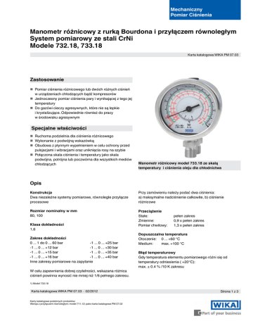 Mechaniczny Pomiar Ciśnienia Manometr różnicowy z rurką Bourdona i przyłączem równoległym System pomiarowy ze stali CrNi Modele 732.18, 733.18 Karta katalogowa WIKA PM 07.03 Zastosowanie Pomiar ciśnienia różnicowego lub dwóch różnych ciśnień w urządzeniach chłodzących bądź kompresorów Jednoczesny pomiar ciśnienia pary i wynikającej z tego jej temperatury Do gazówi cieczy agresywnych, które nie są lepkie i krystalizujące. Odpowiednie również do pracy w środowisku agresywnym Specjalne właściwości Ruchoma podzielnia dla ciśnienia różnicowego Wykonanie z podwójną wskazówką Obudowa z płynnym wypełnieniem w celu ochrony przed pulsjacjami i wibracjami oraz uniknięcia rosy na szybie Połączona skala ciśnienia i temperatury jako skala podwójna, potrójna lub poczwórna dla wszystkich mediów chłodzących Manometr różnicowy model 733.18 ze skalą temperatury i ciśnienia oleju dla chłodnictwa Opis Konstrukcja Dwa niezależne systemy pomiarowe, równoległe przyłącze procesowe Przy zamówieniu należy podać dwa ciśnienia: a) maksymalne nadciśnienie całkowite, b) ciśnienie różnicowe Rozmiar nominalny w mm 80, 100 Przeciążenie Stałe: Zmienne: Pomiar chwilowy: Klasa dokładności 1,6 Zakres dokładności 0 ... 1 do 0 ... 60 bar -1 ... 0 ... +25 bar -1 ... 0 ... +12 bar -1 ... 0 ... +30 bar -1 ... 0 ... +15 bar -1 ... 0 ... +35 bar -1 ... 0 ... +16 bar -1 ... 0 ... +40 bar Inne zakresy pomiarowe na zapytanie W celu zapewnienia dobrej czytelności, wskazana różnica ciśnień powinna wynosić nie mniej niż 1/6 pełnego zakresu. pełen zakres 0,9 x pełen zakres 1,3 x pełen zakres Dopuszczalna temperatura Otoczenie: 0 ... +60 °C Medium: max. +100 °C Błąd temperaturowy Gdy temperatura elementu pomiarowego różni się od temperatury odniesienia ( +20°C): max. ± 0.4 % /10 K zakresu 1) Model 733.18 Karta katalogowa WIKA PM 07.03 ∙ 02/2012 Karty katalogowe podobnych produktów: Wersja z przyłączem równoległym; model 711.12; patrz karta katalogowa PM 07.02 Strona 1 z 3 Wersja standardowa Przyłącze procesowe Stal CrNi, Położenie przyłącza dolne lub tylne, 2 x gwinty zewnętrzne G 3/8 B, SW 19, Przyłącze - plus (HP) i przyłącze - minus (LP) oznaczone na urządzeniu System pomiarowy Stal CrNi, spawany Mechanizm Stop miedzi, części zużywalne z argentanu Podzielnia Białe aluminium z czarną skalą Wskazówka 1 wskazówka: czarne aluminium 1 wskazówka tarczowa: białe aluminium każde 50 % zakresu pomiarowego jako j i i ciśnienia różnicowego Płynne wypełnienie (dla modelu 733.18) Glyceryna 99,7 % Stopień ochrony IP 65 wg EN 60529 / lEC 529 Opcjonalnie Inne przyłącza procesowe: 2 X G 1/4 B, 2 X G 1/2 B, 7/16-20UNF (1/4 Flare), M12 X 1,5 dla 6 mm, (inne na zapytanie) Uszczelki (model 910.17, patrz karta katalogowa AC 09.08) Konstrukcja z podwójną wskazówką Kołnierz przedni ( tylko dla NS 100) lub tylny Przednia rama 88 x 88 mm Zestaw do montażu panelowego, Stopień ochrony IP 66 (tylko z płynnym wypełnieniem) Obudowa Stal CrNi Szyba Poliwęglan Pokrywa Zacisk pierścieniowy, stali CrNi polerowana Wymiary w mm 10519126.01 Położenie przyłącza dolne (NS 80 i 100) NS Wymiary w mm a b d D G h±1 X SW Waga w kg 80 15 64,5 78 86 G 3/8 B 71 23 19 0,49 100 16 74 99,5 107 G 3/8 B 83 26,5 19 0,65 Strona 2 z 3 Karta katalogowa WIKA PM 07.03 ∙ 02/2012 10519241.01 Położenie przyłącza tylne (NS 80) NS Wymiary w mm b d D G h±1 X SW Waga w kg 80 64,5 78 86 G 3/8 B 99 43,5 19 0,53 10543302.01 Położenie przyłącza tylne (NS 100) NS Wymiary w mm b d D G h±1 X Y Z SW Waga w kg 100 74 99,5 107 G 3/8 B 109 26 18,5 10 19 0,71 Model/ Rozmiar nominalny / Zakres pomiarowy / Skalowanie / Ciśnienie różnicowe lub podwójna wskazówka / Rozmiar przyłącza / Długość przyłącza / Max. całkowite nadciśnienie/ Max. ciśnienie różnicowe / Opcjonalnie Specyfikacje i wymiary podane w niniejszej karcie przedstawiają stan konstrukcyjny aktualny w momencie wydruku. Istnieje możliwość wprowadzenia modyfikacji i zmian specyfikacji materiałowej bez wcześniejszego powiadomienia. Strona 3 z 3 Karta katalogowa WIKA PM 07.03 ∙ 02/2012 WIKA Polska spółka z ograniczoną odpowiedzialnością sp. k. Ul. Łęgska 29/35, 87-800 Włocławek Tel.: (+48) 54 23 01 100 Fax: (+48) 54 23 01 101 E-mail: [email protected] www.wikapolska.pl 02/2012 PL based on 02/2012 GB Dane do zamówienia
