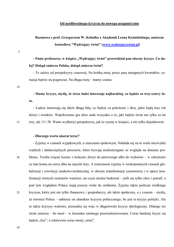 Od neoliberalnego kryzysu do nowego pragmatyzmu Rozmowa z prof. Grzegorzem W. Kołodko z Akademii Leona Koźmińskiego, autorem bestsellera "Wędrujący świat" (www.wedrujacyswiat.pl) 5 - Panie profesorze, w ksiąŜce „Wędrujący świat” przewidział pan obecny kryzys. Co dalej? Dokąd zmierza Polska, dokąd zmierza świat? - To zaleŜy od perspektywy czasowej. Na krótką metę, przez parę następnych kwartałów, sytuacja będzie się pogarszać. Na długą metę – mamy szanse. 10 - Mamy kryzys, myślę, Ŝe teraz ludzi interesuje najbardziej, co będzie za trzy-cztery lata. - Ludzie interesują się takŜe długą falą, co będzie za pokolenie i dwa, jakie będą losy ich dzieci i wnuków. Współcześnie gra idzie nade wszystko o to, jaki będzie świat nie tylko za lat 15 trzy, ale 13 i 30. Warto wydłuŜyć perspektywę, jak to czynię w ksiąŜce, a nie tylko dojutrkować. - Dlaczego warto akurat teraz? - śyjemy w czasach wyjątkowych, o znaczeniu epokowym. Nakłada się na to wiele niezwykle waŜkich i dalekosięŜnych procesów, które bywają niedostrzegane ze względu na doraźne pro20 blemy. Trzeba wiązać koniec z końcem, doŜyć do pierwszego albo do wyborów – w zaleŜności co tam komu na sercu albo na umyśle leŜy. A tymczasem Ŝyjemy w wiekopomnych czasach globalizacji i rewolucji naukowo-technicznej, w okresie transformacji systemowej i w epoce konfrontacji róŜnych systemów wartości, na czym moŜna budować – jeśli się tylko chce i potrafi, a pod tym względem Polacy mają jeszcze wiele do zrobienia. śyjemy takŜe podczas wielkiego 25 kryzysu, który jest nie tylko finansowy i gospodarczy, ale takŜe społeczny, a z czasem – myślę, Ŝe równieŜ Polsce – nabierze on charakter kryzysu politycznego, bo jest to kryzys polityki. Ale to takŜe kryzysy wartości, przeradza się więc w długotrwały kryzys ideologiczny. Dlatego teŜ świat zmierza – bo musi – w kierunku istotnego przewartościowania. Coraz bardziej liczyć się będzie „być”, a relatywnie coraz mniej „mieć”. 30 - To atrakcyjna perspektywa, ale trudno myśleć w kategoriach „być”, kiedy jest duŜy problem z „mieć”. W kryzysie ludzie troszczą się, czy nie zostaną zwolnieni, czy nie zostaną im obniŜone zarobki. Biznes zastanawia się, jak głębokie będzie załamanie i o ile spadną zamówienia, produkcja. To bliski horyzont. 35 - Ludzie są róŜni, mają rozmaite problemy i wartości. Jedni myślą o tym, o czym Pan mówi, inni o Polsce i świecie przyszłości, a jeszcze inni o tym, czy swoją przyszłość widzieć tutaj, na Opolszczyźnie, w Polsce, czy moŜe powędrować do innych miejsc na świecie, które teŜ są ciekawe, a niekiedy fascynujące. Wolno im. Wielu juŜ wyjechało, niektórzy na stałe, co jest zasmucające, bo trudno kreślić dobre perspektywy kraju, którego kapitał społeczny jest przetrzebiany 40 przez odpływ ludzi młodych, wykształconych, ponadprzeciętnie aktywnych, otwartych na ryzyko, a tacy najczęściej wyjeŜdŜają. No, ale to fakt, Ŝe mamy coraz gorszą sytuację gospodarczą, po części wskutek kryzysu światowego, po części w wyniku błędnej polityki gospodarczej rządu. Dlatego jest naturalne, Ŝe więcej ludzi niŜ zazwyczaj – bo ludzie zawsze się martwią – troszczy się o swoje interesy ekonomiczne. O to, co będzie jutro, za miesiąc, w przyszłym roku. 45 - Nie doszłoby do tego, gdyby nie pazerność oraz chciwość banków i korporacji. Winny jest system czy ludzie? Kapitalizm jest zły, a moŜe tylko chory i trzeba go uzdrowić? - Oczywiste, Ŝe system. Szczytem naiwności jest przyjmowanie, Ŝe kapitalizm to idealny ustrój. To paskudztwo, ale w tej fazie cywilizacji doszliśmy do wniosku, Ŝe mniejsze niŜ inne. 50 Przy czym są róŜne oblicza kapitalizmu. Nie tylko to fatalne, neoliberalne, które w części świata wzięło górę w ciągu ostatniego pokolenia. Zwłaszcza w USA od czasów prezydenta Reagana i w Wielkiej Brytanii dzięki premier Thatcher. TakŜe w Rosji w poprzedniej dekadzie za prezydentury Borysa Jelcyna. No i, niestety, w Polsce w niektórych epizodach minionego dwudziestolecia. Neoliberalizm to dewiacja gospodarki kapitalistycznej myląca środki polityki z jej celami, to 55 ufinansowienie bez mała wszystkiego. Pieniądz i zysk stają się celem, człowiek i społeczeństwo środkiem. - Neoliberalizm nie zdał egzaminu, co przyznają chyba juŜ wszyscy oprócz jego najbardziej zagorzałych zwolenników. Ale co dalej? 2 60 - Lepszą przyszłość trzeba budować na zdrowym kapitalizmie przedsiębiorców, a nie na cynicznym wykorzystywaniu takich liberalnych wartości jak wolność, demokracja, konkurencja, przedsiębiorczość, prywatna własność po to, Ŝeby poprawiać sytuację gospodarczą nielicznych elit kosztem większości społeczeństwa. A do tego sprowadza się najgłębsza istota neoliberalizmu. Na najwyŜsze ołtarze wynosi się takie przywary – czyniąc z nich cnotę – jak chciwość, 65 podczas gdy solidarność pozostaje hasłem. Z państwa z jego funkcjami regulującymi czyni się wroga publicznego numer jeden. Nic dziwnego przeto, Ŝe doszło do tak rozległego kryzysu w jego wszystkich pięciu wymiarach: finansowym, gospodarczym, społecznym, politycznym i ideologicznym. W ksiąŜce „Wędrujący świat” obnaŜam destrukcyjne mechanizmy i metody działania, pisząc o upadającym neoliberalizmie i jego marnej spuściźnie. A upadającym dlatego, Ŝe 70 jeszcze nie upadł do końca i sam nie upadnie. - Czyli jak ktoś lub coś go nie dobije, to się go nie pozbędziemy? - Tak. Do tego trzeba przyłoŜyć rękę. A dokładniej – głowę, bo chodzi tu o zaproponowanie w to miejsce lepszych, postępowych wartości, sprawniejszych instytucji, skuteczniejszej polity75 ki. Neoliberalizm się kompromituje, ale z rozmaitych kontekstów wiemy, Ŝe kompromitacja jeszcze nie oznacza śmierci. Aby to tego doszło, trzeba mieć pozytywną propozycję i