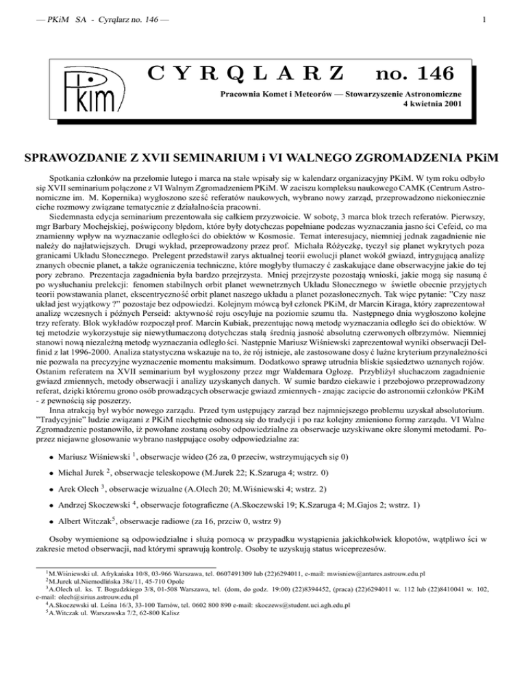 — PKiM SA - Cyrqlarz no. 146 — 1 Pracownia Komet i Meteorów — Stowarzyszenie Astronomiczne 4 kwietnia 2001 SPRAWOZDANIE Z XVII SEMINARIUM i VI WALNEGO ZGROMADZENIA PKiM Spotkania członków na przełomie lutego i marca na stałe wpisały si˛e w kalendarz organizacyjny PKiM. W tym roku odbyło si˛e XVII seminarium połaczone ˛ z VI Walnym Zgromadzeniem PKiM. W zaciszu kompleksu naukowego CAMK (Centrum Astronomiczne im. M. Kopernika) wygłoszono sze ść referatów naukowych, wybrano nowy zarzad, ˛ przeprowadzono niekoniecznie ciche rozmowy zwiazane ˛ tematycznie z działalno ścia pracowni. Siedemnasta edycja seminarium prezentowała si˛e całkiem przyzwoicie. W sobot˛e, 3 marca blok trzech referatów. Pierwszy, mgr Barbary Mochejskiej, poświ˛econy bł˛edom, które były dotychczas popełniane podczas wyznaczania jasno ści Cefeid, co ma znamienny wpływ na wyznaczanie odległo ści do obiektów w Kosmosie. Temat interesujacy, niemniej jednak zagadnienie nie należy do najłatwiejszych. Drugi wykład, przeprowadzony przez prof. Michała Różyczk˛e, tyczył si˛e planet wykrytych poza granicami Układu Słonecznego. Prelegent przedstawił zarys aktualnej teorii ewolucji planet wokół gwiazd, intrygujac ˛ a˛ analiz˛e znanych obecnie planet, a także ograniczenia techniczne, które mogłyby tłumaczy ć zaskakujace ˛ dane obserwacyjne jakie do tej pory zebrano. Prezentacja zagadnienia była bardzo przejrzysta. Mniej przejrzyste pozostaja˛ wnioski, jakie moga˛ si˛e nasuna˛ ć po wysłuchaniu prelekcji: fenomen stabilnych orbit planet wewnetrznych Układu Słonecznego w świetle obecnie przyj˛etych teorii powstawania planet, ekscentryczno ść orbit planet naszego układu a planet pozasłonecznych. Tak wi˛ec pytanie: ”Czy nasz układ jest wyjatkowy ˛ ?” pozostaje bez odpowiedzi. Kolejnym mówca˛ był członek PKiM, dr Marcin Kiraga, który zaprezentował analiz˛e wczesnych i późnych Perseid: aktywno ść roju oscyluje na poziomie szumu tła. Nast˛epnego dnia wygłoszono kolejne trzy referaty. Blok wykładów rozpoczał ˛ prof. Marcin Kubiak, prezentujac ˛ nowa˛ metod˛e wyznaczania odległo ści do obiektów. W tej metodzie wykorzystuje si˛e niewytłumaczona˛ dotychczas stała˛ średnia˛ jasność absolutna˛ czerwonych olbrzymów. Niemniej stanowi nowa˛ niezależna˛ metod˛e wyznaczania odległo ści. Nast˛epnie Mariusz Wiśniewski zaprezentował wyniki obserwacji Delfinid z lat 1996-2000. Analiza statystyczna wskazuje na to, że rój istnieje, ale zastosowane dosy ć luźne kryterium przynależno ści nie pozwala na precyzyjne wyznaczenie momentu maksimum. Dodatkowo spraw˛e utrudnia bliskie sasiedztwo ˛ uznanych rojów. Ostanim referatem na XVII seminarium był wygłoszony przez mgr Waldemara Ogłoz˛e. Przybliżył słuchaczom zagadnienie gwiazd zmiennych, metody obserwacji i analizy uzyskanych danych. W sumie bardzo ciekawie i przebojowo przeprowadzony referat, dzi˛eki któremu grono osób prowadzacych ˛ obserwacje gwiazd zmiennych - znajac ˛ zaci˛ecie do astronomii członków PKiM - z pewnościa˛ si˛e poszerzy. Inna atrakcja˛ był wybór nowego zarzadu. ˛ Przed tym ust˛epujacy ˛ zarzad ˛ bez najmniejszego problemu uzyskał absolutorium. ”Tradycyjnie” ludzie zwiazani ˛ z PKiM niech˛etnie odnosza˛ si˛e do tradycji i po raz kolejny zmieniono form˛e zarzadu. ˛ VI Walne Zgromadzenie postanowiło, iż powołane zostana˛ osoby odpowiedzialne za obserwacje uzyskiwane okre ślonymi metodami. Poprzez niejawne głosowanie wybrano nast˛epujace ˛ osoby odpowiedzialne za: Mariusz Wiśniewski 1 , obserwacje wideo (26 za, 0 przeciw, wstrzymujacych ˛ si˛e 0) Michal Jurek 2 , obserwacje teleskopowe (M.Jurek 22; K.Szaruga 4; wstrz. 0) Arek Olech 3 , obserwacje wizualne (A.Olech 20; M.Wiśniewski 4; wstrz. 2) Andrzej Skoczewski 4 , obserwacje fotograficzne (A.Skoczewski 19; K.Szaruga 4; M.Gajos 2; wstrz. 1) Albert Witczak5 , obserwacje radiowe (za 16, przciw 0, wstrz 9) Osoby wymienione sa˛ odpowiedzialne i służa˛ pomoca˛ w przypadku wystapienia ˛ jakichkolwiek kłopotów, watpliwo ˛ ści w zakresie metod obserwacji, nad którymi sprawuja˛ kontrol˛e. Osoby te uzyskuja˛ status wiceprezesów. 1 M.Wiśniewski ul. Afrykańska 10/8, 03-966 Warszawa, tel. 0607491309 lub (22)6294011, e-mail: [email protected] ul.Niemodlińska 38c/11, 45-710 Opole 3 A.Olech ul. ks. T. Bogudzkiego 3/8, 01-508 Warszawa, tel. (dom, do godz. 19:00) (22)8394452, (praca) (22)6294011 w. 112 lub (22)8410041 w. 102, e-mail: [email protected] 4 A.Skoczewski ul. Leśna 16/3, 33-100 Tarnów, tel. 0602 800 890 e-mail: [email protected] 5 A.Witczak ul. Warszawska 7/2, 62-800 Kalisz 2 M.Jurek — PKiM SA - Cyrqlarz no. 146 — 2 Prezesem PKiM został wybrany Mariusz Wiśniewski (za 22, przeciw 0, wstrz. 0). W skład zarzadu ˛ wchodza˛ dodatkowo: Marcin Gajos 6 - redaktor ”Cyrqlarza” (za 21, przciw 1, wstrz. 3) oraz Aleksander Trofimowicz 7 - sekretarz, opiekun serwisu internetowego PKiM ( I tura A.Trofimowicz 5; A.Skoczewski 12; K.Złoczewski 3; wstrz. 4; II tura A.Trofimowicz 12; A.Skoczewski 8; wstrz. 5). W nawiasach podani sa˛ kandydaci oraz liczby głosów oddanych na okre ślonego kandydata i wstrzymujacych ˛ si˛e; w przypadku jednej kandydatury wskazane sa˛ głosy za, przeciw i wstrzymujace ˛ si˛e. Powołano sekcj˛e radiowa˛ PKiM w Kaliszu, w skład której wchodza: ˛ Albert Witczak, Karolina Łyszczak, Sylwia Czerniejewska. W trakcie trwania seminarium pojawiły si˛e dwie dosy ć istotne dyskusje. Pierwsza poruszała kwesti˛e przyst˛epno ści raportów IMO oraz wiedzy wymaganej od poczatkuj ˛ acych ˛ obserwatorów. Ścierały si˛e dwa przeciwstawne nurty: wymaga si˛e zbyt wiele i to sprawia duże problemy poczatkuj ˛ acym, ˛ oraz : mniej wymaga ć nie można, bo obserwacje straca˛ warto ść naukowa. ˛ Druga dyskusja ściśle była powiazana ˛ z pierwsza.˛ Dotyczyła pozyskania potencjalnych obserwatorów poprzez reklam˛e wyk