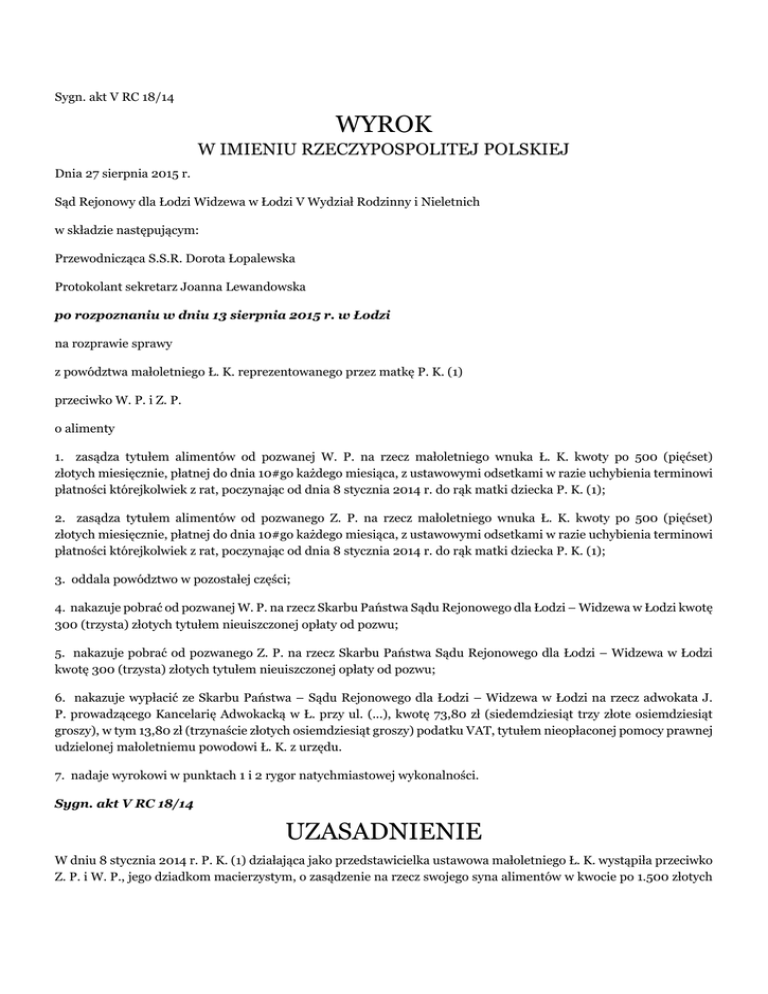 Sygn. akt V RC 18/14 WYROK W IMIENIU RZECZYPOSPOLITEJ POLSKIEJ Dnia 27 sierpnia 2015 r. Sąd Rejonowy dla Łodzi Widzewa w Łodzi V Wydział Rodzinny i Nieletnich w składzie następującym: Przewodnicząca S.S.R. Dorota Łopalewska Protokolant sekretarz Joanna Lewandowska po rozpoznaniu w dniu 13 sierpnia 2015 r. w Łodzi na rozprawie sprawy z powództwa małoletniego Ł. K. reprezentowanego przez matkę P. K. (1) przeciwko W. P. i Z. P. o alimenty 1. zasądza tytułem alimentów od pozwanej W. P. na rzecz małoletniego wnuka Ł. K. kwoty po 500 (pięćset) złotych miesięcznie, płatnej do dnia 10‑go każdego miesiąca, z ustawowymi odsetkami w razie uchybienia terminowi płatności którejkolwiek z rat, poczynając od dnia 8 stycznia 2014 r. do rąk matki dziecka P. K. (1); 2. zasądza tytułem alimentów od pozwanego Z. P. na rzecz małoletniego wnuka Ł. K. kwoty po 500 (pięćset) złotych miesięcznie, płatnej do dnia 10‑go każdego miesiąca, z ustawowymi odsetkami w razie uchybienia terminowi płatności którejkolwiek z rat, poczynając od dnia 8 stycznia 2014 r. do rąk matki dziecka P. K. (1); 3. oddala powództwo w pozostałej części; 4. nakazuje pobrać od pozwanej W. P. na rzecz Skarbu Państwa Sądu Rejonowego dla Łodzi – Widzewa w Łodzi kwotę 300 (trzysta) złotych tytułem nieuiszczonej opłaty od pozwu; 5. nakazuje pobrać od pozwanego Z. P. na rzecz Skarbu Państwa Sądu Rejonowego dla Łodzi – Widzewa w Łodzi kwotę 300 (trzysta) złotych tytułem nieuiszczonej opłaty od pozwu; 6. nakazuje wypłacić ze Skarbu Państwa – Sądu Rejonowego dla Łodzi – Widzewa w Łodzi na rzecz adwokata J. P. prowadzącego Kancelarię Adwokacką w Ł. przy ul. (...), kwotę 73,80 zł (siedemdziesiąt trzy złote osiemdziesiąt groszy), w tym 13,80 zł (trzynaście złotych osiemdziesiąt groszy) podatku VAT, tytułem nieopłaconej pomocy prawnej udzielonej małoletniemu powodowi Ł. K. z urzędu. 7. nadaje wyrokowi w punktach 1 i 2 rygor natychmiastowej wykonalności. Sygn. akt V RC 18/14 UZASADNIENIE W dniu 8 stycznia 2014 r. P. K. (1) działająca jako przedstawicielka ustawowa małoletniego Ł. K. wystąpiła przeciwko Z. P. i W. P., jego dziadkom macierzystym, o zasądzenie na rzecz swojego syna alimentów w kwocie po 1.500 złotych miesięcznie od każdego z pozwanych. W uzasadnieniu pozwu wskazała m.in., że ojciec dziecka nie żyje, syn nie ma renty, a ona sama nie jest w stanie zaspokoić wszystkich usprawiedliwionych potrzeb dziecka (pozew – k. 2-4). Postanowieniem z dnia 28 lutego 2014 r., na czas trwania postępowania, zobowiązano pozwanych do płacenia alimentów na rzecz małoletniego powoda w kwocie po 500 zł od każdego z nich (k. 95-98 - postanowienie). W odpowiedzi na pozew z dnia 23 maja 2014 r., pozwani nie uznawali powództwa, wnosili o jego oddalenie (odpowiedź na pozew k. 193-198). W toku postępowania, strony zajmowały stanowiska jak dotychczas. (k. 264, 302 - protokół rozprawy). Sąd ustalił następujący stan faktyczny: Małoletni Ł. K. ma w tej chwili 16 lat. Pochodzi ze związku małżeńskiego przedstawicielki ustawowej i P. K. (2). Ojciec dziecka zmarł w sierpniu 2008 r. Rodzice małoletniego powoda byli rozwiedzieni, P. K. (2) był zobowiązany do płacenia alimentów na rzecz syna w kwocie po 500 zł miesięcznie. Innego orzeczenia w przedmiocie alimentów na rzecz małoletniego powoda nie było. Ojciec dziecka nie płacił alimentów, które przedstawicielka ustawowa otrzymywała z Funduszu Alimentacyjnego. Rok przed śmiercią ojca dziecka przedstawicielka ustawowa wycofała wniosek egzekucyjny dotyczący alimentów. Przedstawicielka ustawowa nie zna dziadka ojczystego małoletniego. Matkę ojca dziecka zna, ale od lat nie ma z nią kontaktu. W ubiegłym roku szkolnym małoletni uczęszczał do III klasy gimnazjum. W bieżącym roku szkolnym rozpocznie naukę w technikum logistycznym. Koszt zakupu, podręczników wyniósł ok. 700 zł. Dziecko nie chodzi na żadne zajęcia pozalekcyjne płatne, również sportowe, ze względów finansowych. Małoletni deklaruje, iż chciałby chodzić na treningi piłki nożnej. Również ze względów finansowych dziecko nie wyjeżdża na wakacje. Ł. K. ma skierowanie do ortopedy, ponieważ ma skrzywiony kręgosłup. Poza tym dziecko jest w zasadzie zdrowe, nie przyjmuje żadnych leków na stałe. Przedstawicielka ustawowa ocenia miesięczny koszt utrzymania syna na kwotę ok. 1300-1.400 zł. W skład tej kwoty wchodzi: wyżywienie - 500 zł, ubrania, obuwie - 200 zł, środki czystości - 100 zł, przyjemności, rozrywka 200 zł, telefon komórkowy - 60 zł. Za mieszkanie, matka dziecka płaci 500 zł miesięcznie. Przedstawicielka ustawowa ma 37 lat, wykształcenie wyższe z zawodu jest informatykiem. P. K. (1) ma orzeczoną niepełnosprawność w stopniu umiarkowanym, z powodu depresji lękowej. Przedstawicielka ustawowa od wielu lat leczy się na depresję, obecne orzeczenie o niepełnosprawności zostało wydane do końca bieżącego roku. Ponadto matka dziecka ma również problemy z sercem. Przedstawicielka ustawowa mieszka razem z synem w mieszkaniu, które jest jej własnością. Mieszkanie to zostało darowane matce małoletniego przez pozwanych. Wysokość opłat mieszkaniowych wynosi ok. 500 zł miesięcznie. Stan mieszkania strony powodowej jest zły. Obecnie remontu wymaga łazienka oraz pokój dziecka. Również meble są w bardzo złym stanie. Ostatni remont był przeprowadzony w 2012 r. i dotyczył salonu. Koszt tego remontu pokryli pozwani. Przedstawicielka ustawowa pracuje w zakładzie pracy chronionej i otrzymuje wynagrodzenie w wysokości 1.286 złotych miesięcznie. Wcześniej matka dziecka pracowała u pozwanej, ale została zwolniona z powodów zdrowotnych. To była praca w firmie matki. Z uwagi na to, że P. K. (1) przebywała na długotrwałym zwolnieniu, w firmie panowała zła atmosfera, pozwana zwolniała z pracy córkę, żeby nie narażać się na uwagi, 