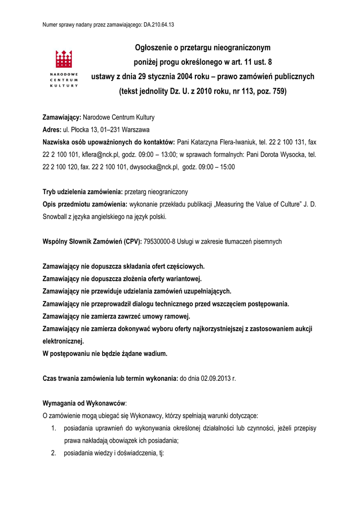 Numer sprawy nadany przez zamawiającego: DA.210.64.13 Ogłoszenie o przetargu nieograniczonym poniżej progu określonego w art. 11 ust. 8 ustawy z dnia 29 stycznia 2004 roku – prawo zamówień publicznych (tekst jednolity Dz. U. z 2010 roku, nr 113, poz. 759) Zamawiający: Narodowe Centrum Kultury Adres: ul. Płocka 13, 01–231 Warszawa Nazwiska osób upoważnionych do kontaktów: Pani Katarzyna Flera-Iwaniuk, tel. 22 2 100 131, fax 22 2 100 101, [email protected], godz. 09:00 – 13:00; w sprawach formalnych: Pani Dorota Wysocka, tel. 22 2 100 120, fax. 22 2 100 101, [email protected], godz. 09:00 – 15:00 Tryb udzielenia zamówienia: przetarg nieograniczony Opis przedmiotu zamówienia: wykonanie przekładu publikacji „Measuring the Value of Culture” J. D. Snowball z języka angielskiego na język polski. Wspólny Słownik Zamówień (CPV): 79530000-8 Usługi w zakresie tłumaczeń pisemnych Zamawiający nie dopuszcza składania ofert częściowych. Zamawiający nie dopuszcza złożenia oferty wariantowej. Zamawiający nie przewiduje udzielania zamówień uzupełniających. Zamawiający nie przeprowadził dialogu technicznego przed wszczęciem postępowania. Zamawiający nie zamierza zawrzeć umowy ramowej. Zamawiający nie zamierza dokonywać wyboru oferty najkorzystniejszej z zastosowaniem aukcji elektronicznej. W postępowaniu nie będzie żądane wadium. Czas trwania zamówienia lub termin wykonania: do dnia 02.09.2013 r. Wymagania od Wykonawców: O zamówienie mogą ubiegać się Wykonawcy, którzy spełniają warunki dotyczące: 1. posiadania uprawnień do wykonywania określonej działalności lub czynności, jeżeli przepisy prawa nakładają obowiązek ich posiadania; 2. posiadania wiedzy i doświadczenia, tj: Numer sprawy nadany przez zamawiającego: DA.210.64.13 2.1. wykonanie lub wykonywanie – w okresie ostatnich trzech lat przed upływem terminu składania ofert, a jeżeli okres prowadzenia działalności jest krótszy to w tym okresie – co najmniej dwóch usług z zakresu tłumaczeń tekstów pisemnych z języka angielskiego na język polski o objętości minimum 5 arkuszy wydawniczych tekstów specjalistycznych z zakresu nauk o kulturze tj. zarządzania kulturą, kulturoznawstwa, marketingu i PR w kulturze, socjologii kultury, ekonomii kultury (np. książki, publikacje naukowe, raporty, ekspertyzy) o wartości co najmniej 8 000,00 zł brutto każda, 3. dysponowania odpowiednim potencjałem technicznym oraz osobami zdolnymi do wykonania zamówienia, tj.: 3.1. dysponowanie co najmniej 1 osobą z co najmniej trzyletnim doświadczeniem w tłumaczeniu pisemnym z języka angielskiego na język polski, która posiada: 3.1.1. ukończone magisterskie studia wyższe na kierunku filologia angielska lub 3.1.2. ukończone magisterskie studia wyższe na innym kierunku i studia podyplomowe w zakresie tłumaczenia dla języka angielskiego lub 3.1.3. certyfikat C2(poziom biegły) z języka angielskiego – London Test sof English (LTE), zgodnie z założeniami Europejskiego Systemu Opisu Kształcenia Językowego (Common European Framework of Reference for Languages), 4. sytuacji ekonomicznej i finansowej; Opis sposobu dokonania oceny spełniania warunków udziału w postępowaniu Ocena spełniania warunków udziału w postępowaniu zostanie dokonana na podstawie dokumentów złożonych przez Wykonawcę oraz Oświadczeń stanowiących załączniki do Specyfikacji Istotnych Warunków Zamówienia. Ocena spełniania warunków udziału w postępowaniu zostanie dokonana metodą: spełnia – nie spełnia. Kryteria oceny ofert: Kryterium Znaczenie Cena brutto za wykonanie przekładu publikacji „Measuring the Value of Culture” J. D. Snowball z języka angielskiego na język polski 100 % Termin i miejsce składania ofert: do godziny 10:00 w dniu 17.05.2013 r., Narodowe Centrum Kultury, ul. Płocka 13, 01–231 Warszawa, recepcja. Termin związania z ofertą: 30 dni, licząc od upływu terminu składania ofert. Numer sprawy nadany przez zamawiającego: DA.210.64.13 Określenie sposobu uzyskania specyfikacji istotnych warunków zamówienia oraz adres strony internetowej, na której została zamieszczona Specyfikacja Istotnych Warunków Zamówienia: 1. Specyfikacja Istotnych Warunków Zamówienia jest dostępna w siedzibie Zamawiającego w Narodowym Centrum Kultury 2. Specyfikacja Istotnych Warunków Zamówienia została zamieszczona na stronie internetowej Zamawiającego http://www.nck.pl/kategorie/przetargi.html Data wywieszenia: 08.05.2013 r. Kazimierz Monkiewicz Zastępca Dyrektora Narodowego Centrum Kultury