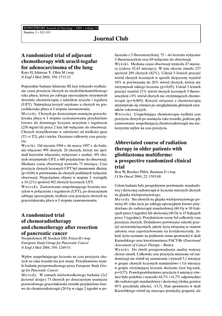 NOWOTWORY Journal of Oncology • 2004 • volume 54 Number 2 • 312–315 Journal Club A randomized trial of adjuvant chemotherapy with uracil-tegafur for adenocarcinoma of the lung Kato H, Ichinose Y, Ohta M i wsp. N Engl J Med 2004, 350: 1713-21 Poprzednie badanie kliniczne III fazy wykaza∏o wyd∏u˝enie czasu prze˝ycia chorych na niedrobnokomórkowego raka p∏uca, którzy po zabiegu operacyjnym otrzymywali doustnie chemioterapi´ z udzia∏em uracylu i tegafuru (UFT). Najwi´kszà korzyÊç uzyskano u chorych na gruczolakoraka p∏uca w I stopniu zawansowania. M e t o d y. Chorych po doszcz´tnym usuni´ciu gruczolakoraka p∏uca w I stopniu zaawansowania przydzielano losowo do doustnego leczenia uracylem i tegafurem (250 mg/m2/d) przez 2 lata lub wy∏àcznie do obserwacji. Chorych stratyfikowano w zale˝noÊci od wielkoÊci guza (T1 vs T2), p∏ci i wieku. Oceniano ca∏kowity czas prze˝ycia. W y n i k i. Od stycznia 1994 r. do marca 1997 r. do badania w∏àczono 999 chorych. 20 chorych, którzy nie spe∏niali kryteriów w∏àczenia, wy∏àczono z analizy. 491 chorych otrzymywa∏o UFT, a 488 przydzielono do obserwacji. Mediana czasu obserwacji wynios∏a 73 miesiàce. Czas prze˝ycia chorych leczonych UFT by∏ znamiennie d∏u˝szy (p=0,04) w porównaniu do chorych poddanych wy∏àcznie obserwacji. Niepo˝àdane objawy w stopniu 3. wystàpi∏y u 10 (2%) spoÊród 482 chorych leczonych UFT. W n i o s k i. Zastosowanie uzupe∏niajàcego leczenia uracylem w po∏àczeniu z tegafurem (UFT), po doszcz´tnym zabiegu operacyjnym, wyd∏u˝a czas prze˝ycia chorych na gruczolakoraka p∏uca w I stopniu zaawansowania. A randomized trial of chemoradiotherapy and chemotherapy after resection of pancreatic cancer Neoptolemos JP, Stocken DD, Friess H i wsp. European Study Group for Pancreatic Cancer N Engl J Med 2004, 350: 1249-51 Wp∏yw uzupe∏niajàcego leczenia na czas prze˝ycia chorych na raka trzustki nie jest znany. Przedstawiono wyniki badania przeprowadzonego przez European Study Group for Pancreatic Cancer. M e t o d y. W ramach wielooÊrodkowego badania (2x2 factorial design) 73 chorych po doszcz´tnym usuni´ciu przewodowego gruczolakoraka trzustki przydzielono losowo do chemioradioterapii (20 Gy w ciàgu 2 tygodni w po- ∏àczeniu z 5-fluorouracylem), 75 – do leczenia wy∏àcznie 5-fluorouracylem oraz 69 wy∏àcznie do obserwacji. W y n i k i. Mediana czasu obserwacji wynios∏a 47 miesi´cy (zakres 32-63 miesiàce). W tym okresie zmar∏o 237 spoÊród 289 chorych (82%). Udzia∏ 5-letnich prze˝yç wÊród chorych leczonych w sposób skojarzony wyniós∏ 10% w porównaniu do 20% wÊród chorych, którzy nie otrzymywali takiego leczenia (p=0,05). Udzia∏ 5-letnich prze˝yç wyniós∏ 21% wÊród chorych leczonych 5-fluorouracylem i 8% wÊród chorych nie otrzymujàcych chemioterapii (p=0,009). KorzyÊç zwiàzana z chemioterapià utrzymywa∏a si´ równie˝ po uwzgl´dnieniu g∏ównych czynników rokowniczych. W n i o s k i. Uzupe∏niajàca chemioterapia wyd∏u˝a czas prze˝ycia chorych po usuni´ciu raka trzustki, podczas gdy zastosowanie uzupe∏niajàcej chemioradioterapii ma niekorzystny wp∏yw na czas prze˝ycia. Abbreviated course of radiation therapy in older patients with glioblastoma multiforme: a prospective randomized clinical trial Roa W, Brasher PMA, Bauman G i wsp. J Clin Oncol 2004; 22: 1583-88 Celem badania by∏o prospektywne porównanie standardowej i skróconej radioterapii w leczeniu starszych chorych na glejaka wielopostaciowego. M e t o d y. Stu chorych na glejaka wielopostaciowego powy˝ej 60. roku ˝ycia po zabiegu operacyjnym losowo przydzielano do radioterapii standardowej (60 Gy w 30 frakcjach przez 6 tygodni) lub skróconej (40 Gy w 15 frakcjach przez 3 tygodnie). Przedmiotem oceny by∏ ca∏kowity czas prze˝ycia chorych. Dodatkowo porównano odsetki prze˝yç szeÊciomiesi´cznych, jakoÊç ˝ycia zwiàzanà ze stanem zdrowia oraz zapotrzebowanie na kortykosteroidy. JakoÊç ˝ycia oceniano na podstawie stanu sprawnoÊci w skali Karnofskiego oraz kwestionariusza FACT-Br (Functional Assessment of Cancer Therapy – Brain). W y n i k i. Do chwili przeprowadzenia analizy wszyscy chorzy zmarli. Ca∏kowity czas prze˝ycia mierzony od randomizacji nie ró˝ni∏ si´ znamiennie i wynosi∏ 5,1 miesi´cy w grupie chorych leczonych standardowo i 5,6 miesi´cy w grupie otrzymujàcej leczenie skrócone (test log-rank, p=0,57). Prawdopodobieƒstwo prze˝ycia 6 miesi´cy równie˝ by∏o podobne i wynosi∏o 44,7% i 41,7% odpowiednio dla radioterapii standardowej i skróconej (dolna granica 95% przedzia∏u ufnoÊci, -13,7). Stan sprawnoÊci w skali Karnofskiego ró˝ni∏ si´ znaczàco pomi´dzy grupami, ale 313 ró˝nica ta nie by∏a znamienna (test Wilcoxona, p=0,63). Niski odsetek wype∏nionych kwestionariuszy FACT-Br (45%) uniemo˝liwi∏ przeprowadzenie porównania jakoÊci ˝ycia pomi´dzy grupami. SpoÊród chorych, którzy ukoƒczyli radioterapi´ zgodnie z planem, 49% chorych leczonych standardowo i 23% leczonych w sposób skrócony wymaga∏o zwi´kszenia dawki kortykosteroidów po zakoƒczeniu radioterapii (test X2, p=0,02). W n i o s k i. Nie stwierdzono ró˝nicy w czasie prze˝ycia pomi´dzy chorymi napromienianymi standardowo i w sposób skrócony. Ze wzgl´du na podobny stan sprawnoÊci, mniejsze zapotrzebowanie na steroidy i skrócony czas leczenia, skrócona radioterapia wydaje si´ rozsàdnym sposobem leczenia starszych chorych na glejaka wielopostaciowego. A randomized trial of exemestane after two to three years of tamoxifen therapy in postmenopausal women with primary breast cancer Coombes RC, Hall E, Gibson LJ i wsp. N Engl J Med 2004, 350: 1081-92 Chore na raka piersi z dodatnimi receptorami estrogenowymi, po menopauzie, otrzymujà standardowo uzupe∏niajàce leczenie tamoksyfenem przez 5 lat. Pomimo takiego leczenia, u niektórych chorych dochodzi do nawrotu. M e t o d y. Przeprowadzono podwójnie Ê