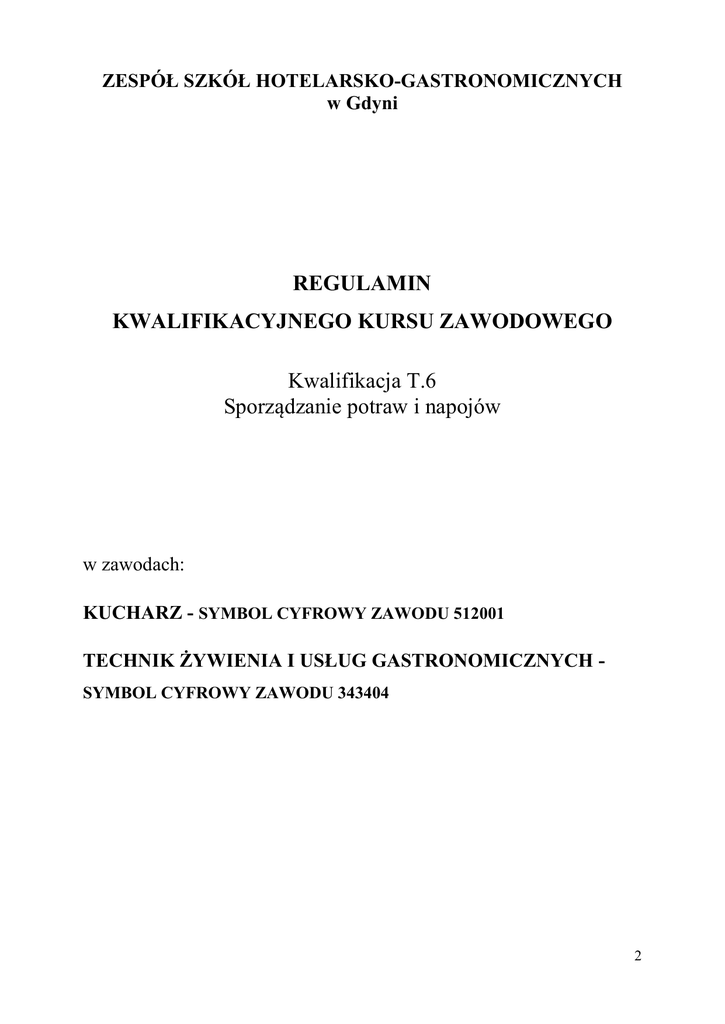 ZESPÓŁ SZKÓŁ HOTELARSKO-GASTRONOMICZNYCH w Gdyni REGULAMIN KWALIFIKACYJNEGO KURSU ZAWODOWEGO Kwalifikacja T.6 Sporządzanie potraw i napojów w zawodach: KUCHARZ - SYMBOL CYFROWY ZAWODU 512001 TECHNIK ŻYWIENIA I USŁUG GASTRONOMICZNYCH SYMBOL CYFROWY ZAWODU 343404 2 I. PODSTAWY PRAWNE KSZTAŁCENIA ZAWODOWEGO Zagadnienia dotyczące kształcenia w formach pozaszkolnych, w tym na kwalifikacyjnych kursach zawodowych zawarte są w następujących aktach prawnych: - ustawa z dnia 7 września 1991 r. o systemie oświaty wraz ze zmianami (ustawa z dnia 19 sierpnia 2011 r. o zmianie ustawy o systemie oświaty oraz niektórych innych ustaw), - rozporządzenie MEN w sprawie klasyfikacji zawodów szkolnictwa zawodowego z dnia 23 grudnia 2011 r. (Dz. U. 2012, poz. 7), - rozporządzenie MEN w sprawie podstawy programowej kształcenia w zawodach z dnia 7 lutego 2012 r. (Dz. U. 2012, poz. 184), - rozporządzenie MEN w sprawie kształcenia ustawicznego w formach pozaszkolnych z dnia 11 stycznia 2012 r. (Dz. U. 2012, poz. 186) wraz ze zmianą (Dz. U. 2012, poz. 1152). II. FORMA KSZTAŁCENIA 1.Kwalifikacyjny kurs zawodowy jest formą kształcenia pozaszkolnego i jest prowadzony według programu nauczania uwzględniającego podstawę programową kształcenia w zawodach, w zakresie jednej kwalifikacji. 2. Do kursu może przystąpić osoba dorosła posiadająca wykształcenie co najmniej na poziomie szkoły ponadgimnazjalnej. 3.Osoba chcąca rozpocząć naukę na kwalifikacyjnym kursie zawodowym składa podanie z prośbą o przyjęcie na kwalifikacyjny kurs zawodowy, załączając świadectwo ukończenia szkoły gimnazjalnej (oryginał, ew. potwierdzona kopia) lub świadectwo ukończenia ostatniego etapu kształcenia 4.Kwalifikacyjny kurs zawodowy kończy się zaliczeniem. 5.Osoba, która uzyskała zaliczenie otrzymuje zaświadczenie o ukończeniu kwalifikacyjnego kursu zawodowego, co umożliwia przystąpienie do egzaminu potwierdzającego kwalifikację w zawodzie w zakresie tej kwalifikacji. 6. Osoba, która zdała egzamin potwierdzający kwalifikację w zawodzie w zakresie tej kwalifikacji, otrzymuje świadectwo wydane przez okręgową komisję egzaminacyjną. 7. Osoba, która zdała egzaminy z zakresu wszystkich kwalifikacji wyodrębnionych w danym zawodzie oraz posiada poziom wykształcenia wymagany dla danego zawodu, otrzymuje dyplom potwierdzający kwalifikacje w zawodzie. Dyplom wydaje okręgowa komisja egzaminacyjna. 3 III. CZAS TRWANIA KSZTAŁCENIA Kwalifikacyjny kurs zawodowy jest organizowany w trybie zaocznym. Czas trwania kwalifikacyjnego kursu zawodowego obejmuje okres niezbędny do zrealizowania treści programowych przedmiotów przewidzianych w planie nauczania . Kurs rozpoczyna się we wrześniu 2015 r. i kończy w grudniu 2017 r. IV. LICZBA GODZIN KSZTAŁCENIA Szkolny plan nauczania KKZ-T.6/2015 Semestr Lp. Obowiązkowe zajęcia edukacyjne I II III 18 Liczba godzin w okresie nauczania Kształcenie zawodowe teoretyczne 1. Wyposażenie i zasady bezpieczeństwa w gastronomii 18 20 2. Działalność gospodarcza w gastronomii 30 26 3. Technologia gastronomiczna z towaroznawstwem 36 36 55 127 4. Język obcy zawodowy 14 14 14 42 98 96 87 281 5. 6. Kształcenie zawodowe praktyczne** Pracownia gastronomiczna 55 55 Zajęcia praktyczne 88 128 58 37 168 253 7. Praktyka zawodowa 80 80 Łączna liczba godzin na kształcenie zawodowe teoretyczne 56 56 Łączna liczba godzin na kształcenie zawodowe praktyczne 143 183 175 501 Łączna liczba godzin na kształcenie zawodowe 153 151 145 782 * praktyki zawodowej realizowanej przez słuchacza w wybranej przez siebie jednostce na podstawie skierowania wystawionego przez szkołę. IV. PRAWA I OBOWIĄZKI SŁUCHACZA Słuchacz ma prawo: a) do uzyskania pełnej informacji dotyczącej organizacji kursu, 4 b) do otrzymania harmonogramów zajęć, c) do konsultacji z opiekunem kursu, d) do systematycznego uzupełniania wiedzy, e) do korzystania z materiałów dydaktycznych dostarczonych przez wykładowców, f) do wyrażania opinii o organizacji kursu, g) do znajomości terminu i formy zaliczenia poszczególnych przedmiotów oraz praktyk zawodowych, h) do otrzymania programu kursu, harmonogramu zajęć, skierowania na praktykę zawodową oraz karty zaliczeniowej. Słuchacz ma obowiązek: a) przestrzegania przepisów BHP i regulaminów placówki organizującej kurs b) zapoznania się z programem kursu, harmonogramem zajęć, zasadami ich realizacji oraz warunkami uzyskiwania zaliczeń, c) punktualnego uczęszczania na zajęcia zgodnie z harmonogramem, d) troski o bezpieczeństwo własne i pozostałych słuchaczy, e) szanowania powierzonego mienia, f) przestrzegania zasad współżycia społecznego i poszanowania godności człowieka. V. SPOSÓB UZYSKIWANIA ZALICZENIA 1. W toku realizacji programu kształcenia prowadzi się ocenianie bieżące, rozumiane jako zaliczanie poszczególnych przedmiotów (sprawdzenie stopnia opanowania wiedzy i umiejętności będących przedmiotem nauczania teoretycznego i praktycznego). 2. Warunki uzyskania zaliczenia ustala osoba prowadząca zajęcia z danego przedmiotu. W toku realizacji programu kształcenia prowadzi się ocenianie bieżące a na koniec semestru odbywa się egzamin w formie pisemnej i ustnej. Ocena z przedmiotu wynika z ocen cząstkowych oraz oceny z egzaminu i jest ustalana przez osobę prowadzącą zajęcia zgodnie z zasadami podanymi uczestnikom kursu. Osoba prowadząca przedmiot może zwolnić słuchacza, z zajęć dotyczących odpowiednio treści kształcenia lub efektów kształcenia zrealizowanych w dotychczasowym procesie kształcenia. Wniosek o zwolnienie ( zał. nr. 1) słuchacz powinien złożyć w formie pisemnej wraz z odpowiednim dokumentem wymienionym w § 7. Rozporządzenie MEN w sprawie kształcenia ustawicznego w formach pozaszkolnych z dnia 11 stycznia 2012 r. 5 3. Jednym z kryteriów warunkujących uzyskanie zaliczenia jest obecność słuchacza (co najmniej 50 %) na zajęciach w ramach danego przed