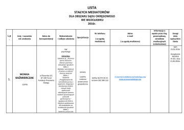 LISTA STAŁYCH MEDIATORÓW DLA OBSZARU SĄDU OKRĘGOWEGO WE WŁOCŁAWKU 2016r. Nr telefonu L.p . Imię i nazwisko rok urodzenia Adres do korespondencji Wykształcenie i odbyte szkolenia Specjalizacja ( za zgodą mediatora) Adres e-mail ( za zgodą mediatora) MONIKA 1. KAŹMIERCZAK (1979) ul.Ślusarska 2/1 87-100 Toruń Fundacja Pracownia Dialogu Uwagi data wpisu/skre ślenia wpis 23.05.2016r mgr psychologii SZKOLENIA: Szkolenie pt. „Pierwsza pomoc dzieciomofiarom przemocy seksualnej” (grudzień 2001r.) Wykłady i warsztaty pt. „Przemoc w rodzinie” (marzec-kwiecień 2003r.); Szkolenie „Przygotowanie do samodzielnej pracy z więźniami. Integracja i koordynacja działań różnych służb społecznych udzielających pomocy osobom opuszczającym jednostki penitencjarne.” (październik 2014r.); Szkolenie podstawowe dla kandydatów na mediatorów (grudzień 2004r.); Szkolenie prawne dla Informacja o wpisie przez Org. pozarządową, ośrodków mediacyjnych (członkostwo) Zarządzenie 99/2016 Pr.SO z dnia 21.06.2016r. sprawy: cywilne rodzinne prawo pracy gospodarcze tel/fax 56 471 02 21 tel.kom.502 306 110 [email protected] www.pracowniadialogu.org mediatorów w zakresie mediacji cywilnej(grudzień 2005r.): Szkolenie dla koordynatorów konferencji sprawiedliwości naprawczej (marzeckwiecień 2006r.); Szkolenie specjalistyczne z mediacji rodzinnej (luty 2007r.); Szkolenie „Prawa i potrzeby dziecka w konflikcie rozwodowym” (kwiecień 2007r.); Szkolenie z podstaw prawa (lipiec 2007r.); Szkolenie „Inteligencja emocjonalna” (majczerwiec 2010r.); Specjalistyczne szkolenie w zakresie alternatywnych sposobów rozwiązywania sporów w sprawach gospodarczych (listopad 2011r.); Szkolenie „Wykorzystanie analizy transakcyjnej w pracy mediatora”(listopad 2012r.); Terapia Par i Małżeństw (kwiecień 2013r.); Szkolenie „Praca z rodziną oparta na potencjałach” (kwiecień 2015r.); Szkolenie „Restorative justice approaches” (maj 2015r.); Szkolenie “Wykorzystanie Dialogu Motywującego w mediacji” (październik 2015r.). wpis 23.05.2016r mgr socjologii JANUSZ 2. KAŹMIERCZAK (1979) ul.Ślusarska 2/1 87-100 Toruń Fundacja Pracownia Dialogu SZKOLENIA: Szkolenie dla koordynatorów konferencji sprawiedliwości naprawczej (marzeckwiecień 2006r.); Szkolenie specjalistyczne z mediacji rodzinnej (luty 2007r.); Szkolenie „Prawa i potrzeby dziecka w konflikcie rozwodowym” (kwiecień 2007r.); Szkolenie „jak efektywniej pracować i żyć z ludźmi” (listopad 2008r.); Szkolenie „Płeć w mediacji” (czerwiec 2010r.); Specjalistyczne szkolenie w zakresie alternatywnych sposobów rozwiązywania sporów w sprawach gospodarczych (listopad 2011r.); Szkolenie „Wykorzystanie analizy transakcyjnej w pracy mediatora”(październik 2012r.); „Sexuality and Morality: Intercultural Perspectives and Mediations” (wrzesień 2013r.) Szkolenie „Restorative justice approaches” (maj 2015r.); Szkolenie „Praca z rodziną oparta na potencjałach” (maj 2015r.) Szkolenie “Wykorzystanie Dialogu Motywującego w Zarządzenie 99/2016 Pr.SO z dnia 21.06.2016r sprawy: cywilne rodzinne prawo pracy gospodarcze tel/fax 56 471 02 21 tel.kom.793 969 360 [email protected] www.pracowniadialogu.org mediacji” (październik 2015r.). ul.Robotnicza 1/19 87-800 Włocławek 3. SZKOLENIA: Studia podyplomowemediacja sądowa i pozasądowa(2011r.); Specjalistyczne szkolenie z zakresu mediacji rodzinnej(2011); Specjalistyczne szkolenie dla mediatorów(2011); Specjalistyczne szkolenie w zakresie mediacji oświatowych, szkolnych i rówieśniczych(2011); Specjalistyczne szkolenie z mediacji cywilnychgospodarczych(2011); Szkolenie Propagowanie alternatywnych metod rozwiązywania sporów(2016r.). ALEKSANDRA KUBIAK (1975r.) KRYSTYNA PARYSJANOWICZ (1955r.) 4. ul.Wojska Polskiego 22 87-800 Włocławek wpis 20.05.2016r. mgr prawa - sprawy: cywilne rodzinne prawo pracy gospodarcze 604 836 512 [email protected] wpis 7.06.2016r dr nauk humanistycznych w zakresie pedagogiki SZKOLENIA: Mediacje Konfliktów z Udziałem Dzieci (2000r); Specjalistyczne Szkolenie dla Mediatorów Stałych (2006); Szkolenie z Zakresu Mediacji Rodzinnej (2008). Zarządzenie 99/2016 Pr.SO z dnia 21.06.2016r sprawy: tel. 608 151 623 cywilne rodzinne Członek i mediator na liście Stowarzyszenia Mediatorów Rodzinnych w Warszawie Członek Społecznej Rady ds.Alternatywnych Metod Rozwiązywania Konfliktów i Sporów w Warszawie Zarządzenie 99/2016 Pr.SO z dnia 21.06.2016r Kancelaria Mediacyjna Na-Tak ul.Towarowa 2/4 87-800 Włocławek 5. RENATA URSZULA PODGÓRSKA (1962) 6. ZABORSKI (1982) SZKOLENIA: Konstruowanie ugód w sprawach cywilnych (2007r.); 48 Szkoła Mediacji(2007r.); Mediacje w sporach zbiorowych(2009r.); Alternatywne sposoby rozwiązywania sporów w sprawach gospodarczych(2011); Studia podyplomowe w zakresie specjalizacji mediacje rodzinne(2014); Propagowanie alternatywnych metod rozwiązywania sporów(2016); Specjalistyczne szkolenie dla mediatorów w sporach zbiorowych „Mediator pilnie poszukiwany”; Specjalistyczne szkolenie w zakresie Body Language Master. mgr prawa KAROL ul.Spokojna 48A 87-500 Rypin członek Krajowej Izby Mediatorów i Arbitrów sprawy: wyższe zawodowe SZKOLENIA: studia podyplomowe negocjacje i mediacje (2012); cywilne rodzinne prawo pracy gospodarcze zbiorowe 604 256 868 Zarządzenie 99/2016 Pr.SO z dnia 21.06.2016r [email protected] wpis 20.05.2016r sprawy: cywilne rodzinne gospodarcze wpis 20.05.2016r 48 605 835 355 [email protected] Zarządzenie 99/2016 Pr.SO z dnia 21.06.2016r wpis 23.05.2016r KONRAD 7. ZALEWSKI ul.Przy Kaszowniku 41a/29 87-100 Toruń SZKOLENIA: studia podyplomowe w zakresie mediacji rodzinnych(2014). Zarządzenie 99/2016 Pr.SO z dnia 21.06.2016r sprawy: tel.602 615 082 [email protected] rodzinne (1976) Lista zawiera informacje zgodnie z art.157d § 1,2,3 Ustawy z dnia 10 września 2015r. o zmianie niektórych ustaw w związku ze wspieraniem polubownych metod rozwiązywania sporów (Dz.U 