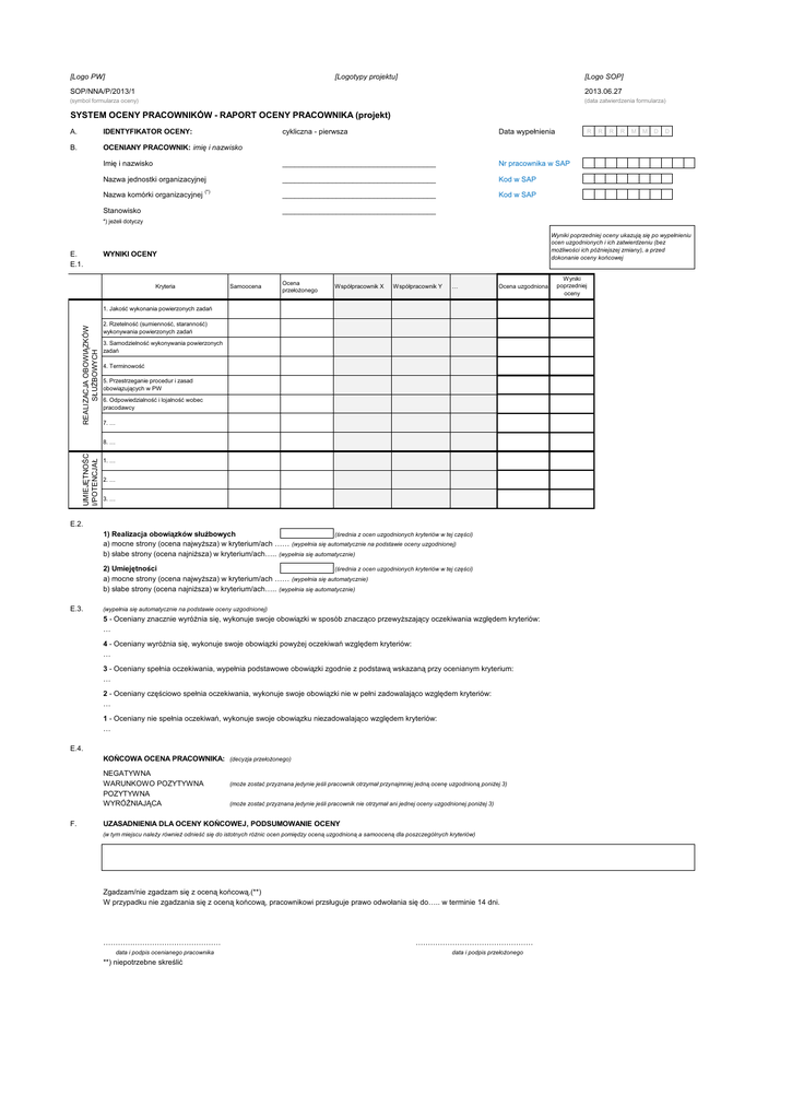[Logo PW] [Logotypy projektu] [Logo SOP] SOP/NNA/P/2013/1 2013.06.27 (symbol formularza oceny) (data zatwierdzenia formularza) SYSTEM OCENY PRACOWNIKÓW - RAPORT OCENY PRACOWNIKA (projekt) cykliczna - pierwsza Data wypełnienia Imię i nazwisko _____________________________________ Nr pracownika w SAP Nazwa jednostki organizacyjnej _____________________________________ Kod w SAP Nazwa komórki organizacyjnej (*) _____________________________________ Kod w SAP Stanowisko _____________________________________ A. IDENTYFIKATOR OCENY: B. OCENIANY PRACOWNIK: imię i nazwisko R R R R M M D D *) jeżeli dotyczy E. E.1. Wyniki poprzedniej oceny ukazują się po wypełnieniu ocen uzgodnionych i ich zatwierdzeniu (bez możliwości ich późniejszej zmiany), a przed dokonanie oceny końcowej WYNIKI OCENY Kryteria Samoocena Ocena przełożonego Współpracownik X Współpracownik Y … Ocena uzgodniona REALIZACJA OBOWIĄZKÓW SŁUŻBOWYCH 1. Jakość wykonania powierzonych zadań 2. Rzetelność (sumienność, staranność) wykonywania powierzonych zadań 3. Samodzielność wykonywania powierzonych zadań 4. Terminowość 5. Przestrzeganie procedur i zasad obowiązujących w PW 6. Odpowiedzialność i lojalność wobec pracodawcy 7. … UMIEJĘTNOŚC I/POTENCJAŁ 8. … 1. … 2. … 3. … E.2. 1) Realizacja obowiązków służbowych (średnia z ocen uzgodnionych kryteriów w tej części) a) mocne strony (ocena najwyższa) w kryterium/ach …… (wypełnia się automatycznie na podstawie oceny uzgodnionej) b) słabe strony (ocena najniższa) w kryterium/ach….. (wypełnia się automatycznie) 2) Umiejętności (średnia z ocen uzgodnionych kryteriów w tej części) a) mocne strony (ocena najwyższa) w kryterium/ach …… (wypełnia się automatycznie) b) słabe strony (ocena najniższa) w kryterium/ach….. (wypełnia się automatycznie) E.3. (wypełnia się automatycznie na podstawie oceny uzgodnionej) 5 - Oceniany znacznie wyróżnia się, wykonuje swoje obowiązki w sposób znacząco przewyższający oczekiwania względem kryteriów: … 4 - Oceniany wyróżnia się, wykonuje swoje obowiązki powyżej oczekiwań względem kryteriów: … 3 - Oceniany spełnia oczekiwania, wypełnia podstawowe obowiązki zgodnie z podstawą wskazaną przy ocenianym kryterium: … 2 - Oceniany częściowo spełnia oczekiwania, wykonuje swoje obowiązki nie w pełni zadowalająco względem kryteriów: … 1 - Oceniany nie spełnia oczekiwań, wykonuje swoje obowiązku niezadowalająco względem kryteriów: … E.4. KOŃCOWA OCENA PRACOWNIKA: (decyzja przełożonego) NEGATYWNA WARUNKOWO POZYTYWNA POZYTYWNA WYRÓŻNIAJĄCA F. (może zostać przyznana jedynie jeśli pracownik otrzymał przynajmniej jedną ocenę uzgodnioną poniżej 3) (może zostać przyznana jedynie jeśli pracownik nie otrzymał ani jednej oceny uzgodnionej poniżej 3) UZASADNIENIA DLA OCENY KOŃCOWEJ, PODSUMOWANIE OCENY (w tym miejscu należy również odnieść się do istotnych różnic ocen pomiędzy oceną uzgodnioną a samooceną dla poszczególnych kryteriów) Zgadzam/nie zgadzam się z oceną końcową.(**) W przypadku nie zgadzania się z oceną końcową, pracownikowi przsługuje prawo odwołania się do….. w terminie 14 dni. ………………………………………… data i podpis ocenianego pracownika **) niepotrzebne skreślić ………………………………………… data i podpis przełożonego Wyniki poprzedniej oceny