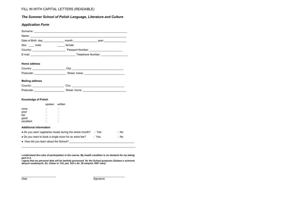 FILL IN WITH CAPITAL LETTERS (READABLE) The Summer School of Polish Language, Literature and Culture Application Form Surname: ______________________________________________________________ Name: ________________________________________________________________ Date of Birth: day:______________ month:________________ year:_______________ Sex: ____ male _____ female Country: ______________________ Passport Number: ______________________ E-mail: ______________________________ Telephone Number: __________________ Home address Country: ______________________ City: __________________________________ Postcode: _____________________ Street, home: ___________________________ Mailing address Country: _____________________ Ciry: ___________________________________ Postcode: ____________________ Street, home: _____________________________ Knowledge of Polish spoken written none poor fair good excellent Additional information ● Do you want vegetarian meals during the whole month? Yes No ● Do you want to book a single room for an extra fee? Yes No ● How did you learn about the School? ___________________________________________ ____________________________________________________________________________ I understand the rules of participation in the course. My health condition is no obstacle for my taking part in it. I agree that my personal data will be lawfully processed for the School purposes (Ustawa o ochronie danych osobowych, Dz. Ustaw nr 133, poz. 833 z dn. 29 sierpnia 1997 roku). _______________________ Date _____________________ Signature