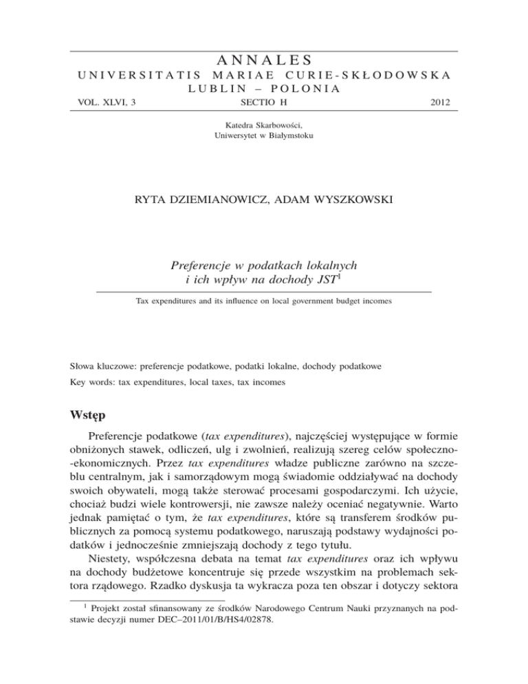 ANNALES UNIVERSITATIS MARIAE CURIE-SKŁODOWSKA LUBLIN – POLONIA VOL. XLVI, 3 SECTIO H 2012 Katedra Skarbowości, Uniwersytet w Białymstoku RYTA DZIEMIANOWICZ, ADAM WYSZKOWSKI Preferencje w podatkach lokalnych i ich wpływ na dochody JST1 Tax expenditures and its influence on local government budget incomes Słowa kluczowe: preferencje podatkowe, podatki lokalne, dochody podatkowe Key words: tax expenditures, local taxes, tax incomes Wstęp Preferencje podatkowe (tax expenditures), najczęściej występujące w formie obniżonych stawek, odliczeń, ulg i zwolnień, realizują szereg celów społeczno-ekonomicznych. Przez tax expenditures władze publiczne zarówno na szczeblu centralnym, jak i samorządowym mogą świadomie oddziaływać na dochody swoich obywateli, mogą także sterować procesami gospodarczymi. Ich użycie, chociaż budzi wiele kontrowersji, nie zawsze należy oceniać negatywnie. Warto jednak pamiętać o tym, że tax expenditures, które są transferem środków publicznych za pomocą systemu podatkowego, naruszają podstawy wydajności podatków i jednocześnie zmniejszają dochody z tego tytułu. Niestety, współczesna debata na temat tax expenditures oraz ich wpływu na dochody budżetowe koncentruje się przede wszystkim na problemach sektora rządowego. Rzadko dyskusja ta wykracza poza ten obszar i dotyczy sektora 1 Projekt został sfinansowany ze środków Narodowego Centrum Nauki przyznanych na podstawie decyzji numer DEC–2011/01/B/HS4/02878. 166 RYTA DZIEMIANOWICZ, ADAM WYSZKOWSKI samorządowego (JST). Biorąc jednak pod uwagę fakt, że dochody podatkowe w JST stanowiły w 2010 r. ok. 68% dochodów własnych, a możliwość ich pozyskiwania przez samodzielne kształtowanie (tzw. władztwo podatkowe) jest ograniczona, raportowanie tax expenditures, także na poziomie lokalnym, powinno być standardem. Celem artykułu jest przeanalizowanie systemu przywilejów wbudowanych w konstrukcję podatków lokalnych oraz wykazanie konsekwencji budżetowych ich stosowania. Opracowanie jest jednocześnie próbą odpowiedzi na pytanie: ile kosztuje społeczność lokalną użycie w konstrukcjach podatkowych tax expenditures2 . Tekst przygotowano na podstawie studiów literaturowych oraz analizy danych publikowanych przez Ministerstwo Finansów. 1. Istota preferencji podatkowych (tax expenditures) Jak już wspomniano, tax expenditures znajdują zastosowanie w systemie podatkowym po to, by realizować określone cele społeczno-ekonomiczne, które odzwierciedlają funkcje pozafiskalne podatków. Ich rodzaj oraz zakres uzależniony jest od wielu przesłanek i wynika przede wszystkim z historycznych, politycznych, gospodarczych, społecznych czy też koniunkturalnych przyczyn. Analiza tego typu wsparcia w literaturze przedmiotu została zapoczątkowana przez S. S. Surreya. Według jego opinii, tak zdefiniowane konstrukcje prawa podatkowego mają takie same ekonomiczne skutki, jak bezpośrednie wydatki budżetowe, jednak nie są tak samo identyfikowane i badane3 . Jak zauważył L. E. Burman, głównym celem S. S. Surreya było zwrócenie uwagi na te pozycje, w nadziei, że zapoczątkują one reformę systemu podatkowego w kierunku przekierowania go na realizowanie jego głównej funkcji, tj. funkcji fiskalnej4 . Systemem podatkowy, mimo iż jest narzędziem dochodowym budżetu państwa, zawiera konstrukcje, które są substytutem wydatków bezpośrednich. Skutkiem stosowania tax expenditures jest obniżenie wpływów podatkowych, co z kolei prowadzi do podwyższenia obciążeń podatkowych lub ograniczenia sumy wydatków realizowanych przez budżet. W przeciwieństwie jednak do bezpośrednich wydatków, konstrukcje typu tax expenditures nie podlegają takim rygorom kon2 Ocena przywilejów podatkowych nie powinna ograniczać się tylko do oszacowania ich wartości. Wskazana jest tu także ocena ich efektywności. Niemniej jednak w tym opracowaniu, ze względu na limitowane rozmiary tekstu, ta kwestia została pominięta. 3 B. Bartlett, Policy bulletin: The End of Tax Expenditures as We Know Them? „Institute of Research on the Economics of Taxation” 2001, June 13, No. 84, s. 1. 4 L. E. Burman, Is the Tax Expenditure Concept Still Relevant?, „National Tax Journal” 2003, September. PREFERENCJE W PODATKACH LOKALNYCH. . . 167 trolnym oraz ewidencyjnym5 . Z tego też względu ich liczba, rozmiar oraz zakres nie podlegają ewidencji, co skutecznie uniemożliwia właściwą analizę zakresu oddziaływania państwa przez budżet. Najbardziej dyskusyjną kwestią tzw. analizy tax expenditures jest podział regulacji podatkowych na dwie części. Pierwsza z nich, określana mianem komponentu strukturalnego (na potrzeby przeprowadzenia polskiej analizy preferencji podatkowych Ministerstwo Finansów posłużyło się pojęciem standardu podatkowego6 ) jest częścią przepisów, która jest niezbędna dla prawidłowego funkcjonowania poszczególnych podatków. Reguluje zatem podstawowe elementy prawnej konstrukcji podatku. Druga część definiuje wszelkiego rodzaju preferencje podatkowe, określane mianem tax expenditures. Są to rozwiązania, które stanowią odejście od strukturalnej części przez zastosowanie różnego rodzaju ulg, zwolnień, wyłączeń. Właściwa identyfikacja powyższych części systemu podatkowego ma fundamentalne znaczenie dla przeprowadzenia poprawnej analizy tax expenditures i stanowi zarazem największą barierę w dokonywaniu międzynarodowych porównań – ta i inne bariery zostały zidentyfikowane m.in. przez J. Craiga i W. Allana7 . W Polsce analizę tax expenditures rozpoczęto dopiero w 2010 roku8 . Ministerstwo Finansów opublikowało wówczas raport pt. Preferencje podatkowe w Polsce, w którym podjęto próbę przeprowadzenia tego typu analizy. Za podstawowe cele Raportu Ministerstwo Finansów przyjęło9 : – określenie istoty standardu podatkowego i preferencji podatkowej, – identyfikację preferencji podatkowych, – klasyfikacj