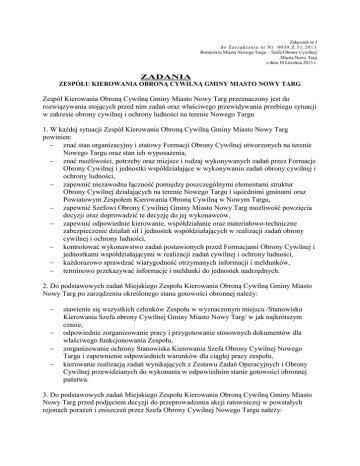 Załącznik nr I do Za rządzenia nr Nr 0050.Z.51.2013 Burmistrza Miasta Nowego Targu – Szefa Obrony Cywilnej Miasta Nowy Targ z dnia 10 kwietnia 2013 r. ZADANIA ZESPÓŁU KIEROWANIA OBRONĄ CYWILNĄ GMINY MIASTO NOWY TARG Zespół Kierowania Obroną Cywilną Gminy Miasto Nowy Targ przeznaczony jest do rozwiązywania stojących przed nim zadań oraz właściwego przewidywania przebiegu sytuacji w zakresie obrony cywilnej i ochrony ludności na terenie Nowego Targu 1. W każdej sytuacji Zespół Kierowania Obroną Cywilną Gminy Miasto Nowy Targ powinien: znać stan organizacyjny i etatowy Formacji Obrony Cywilnej utworzonych na terenie Nowego Targu oraz stan ich wyposażenia, znać możliwości, potrzeby oraz miejsce i rodzaj wykonywanych zadań przez Formacje Obrony Cywilnej i jednostki współdziałające w wykonywaniu zadań obrony cywilnej i ochrony ludności, zapewnić niezawodna łączność pomiędzy poszczególnymi elementami struktur Obrony Cywilnej działających na terenie Nowego Targu i sąsiednimi gminami oraz Powiatowym Zespołem Kierowania Obroną Cywilną w Nowym Targu, zapewnić Szefowi Obrony Cywilnej Gminy Miasto Nowy Targ możliwość powzięcia decyzji oraz doprowadzić te decyzję do jej wykonawców, zapewnić odpowiednie kierowanie, współdziałanie oraz materiałowo-techniczne zabezpieczenie działań sił i jednostek współdziałających w realizacji zadań obrony cywilnej i ochrony ludności, kontrolować wykonawstwo zadań postawionych przed Formacjami Obrony Cywilnej i jednostkami współdziałającymi w realizacji zadań cywilnej i ochrony ludności, każdorazowo sprawdzać wiarygodność otrzymanych informacji i meldunków, terminowo przekazywać informacje i meldunki do jednostek nadrzędnych. 2. Do podstawowych zadań Miejskiego Zespołu Kierowania Obroną Cywilną Gminy Miasto Nowy Targ po zarządzeniu określonego stanu gotowości obronnej należy: stawienie się wszystkich członków Zespołu w wyznaczonym miejscu /Stanowisku Kierowania Szefa obrony Cywilnej Gminy Miasto Nowy Targ/ w jak najkrótszym czasie, odpowiednie zorganizowanie pracy i przygotowanie stosownych dokumentów dla właściwego funkcjonowania Zespołu, zorganizowanie ochrony Stanowiska Kierowania Szefa Obrony Cywilnej Nowego Targu i zapewnienie odpowiednich warunków dla ciągłej pracy zespołu, kierowanie realizacją zadań wynikających z Zestawu Zadań Operacyjnych i Obrony Cywilnej przewidzianych do wykonania w odpowiednim stanie gotowości obronnej państwa. 3. Do podstawowych zadań Miejskiego Zespołu Kierowania Obroną Cywilną Gminy Miasto Nowy Targ przed podjęciem decyzji do przeprowadzenia akcji ratowniczej w powstałych rejonach porażeń i zniszczeń przez Szefa Obrony Cywilnej Nowego Targu należy: dokonanie analizy oraz oceny zaistniałej sytuacji porażeń i zniszczeń, przedstawienie ogólnego zamiaru do przeprowadzenia akcji ratowniczej oraz wydanie zarządzeń przygotowawczych /wstępnych/, przygotowanie i przedstawienie Szefowi Obrony Cywilnej Nowego Targu niezbędnych danych szczegółowej oceny sytuacji oraz wniosków z niej wypływających w celu umożliwienia podjęcia optymalnej decyzji dla skutecznego przeprowadzenia akcji ratowniczej. 4. Do podstawowych zadań Miejskiego Zespołu Kierowania Obroną Cywilną Gminy Miasto Nowy Targ po podjęciu decyzji przez Szefa Obrony Cywilnej Nowego Targu należy: doprowadzenie podjętej decyzji do jej wykonawców, opracowanie niezbędnych dokumentów i terminowe ich przekazywanie osobom zainteresowanym i odpowiedzialnym za prawidłowy przebieg akcji ratowniczej, zapewnienie właściwej organizacji kierowania, współdziałania oraz zabezpieczenia pod względem materiałowo-technicznym stojących przed siłami i środkami Obrony Cywilnej zadań, koordynowanie i kontrolowanie wykonawstwa postawionych zadań, dokonywanie korekt do podjęcia decyzji, – jeżeli wymagają tego zaistniałe warunki realizacji zaplanowanych przedsięwzięć i zadań – oraz doprowadzenie nowych zadań do ich wykonawców i jednostek współdziałających.