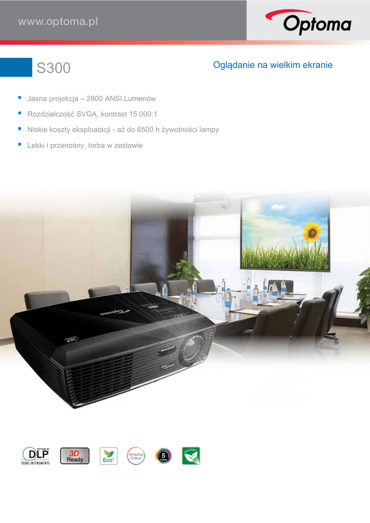 S300 Oglądanie na wielkim ekranie Jasna projekcja – 2800 ANSI Lumenów Rozdzielczość SVGA, kontrast 15 000:1 Niskie koszty eksploatacji - aż do 6500 h żywotności lampy Lekki i przenośny, torba w zestawie S300 Idealny do stosowania w sali konferencyjnej lub klasie, mały i stylowy S300 posiada jasność 2800L, która pozwala wyświetlać jasne, krystalicznie czyste obrazy przy normalnym świetle. S300 z wbudowanym głośnikiem oraz najnowszymi technologiami DLP® i BrilliantColor™ oferuje kontrast 15 000:1 co pozwala na wyświetlanie obrazów, prezentacji i video o wspaniałych kolorach. Niewiarygodna żywotność lampy aż do 6500 godzin w połączeniu z technologią Eco+ zapewnia funkcje oszczędzania energii i pieniędzy w celu długotrwałej, bezproblemowej projekcji. Zainstalowany, lub w podróży, wszechstronny S300 posiada wygodną torbę, aby zabrać go ze sobą. Ekologiczne rozwiązania Auto Power Off Technologia Eco+ od Optomy zwiększa nasze zaangażowanie na rzecz ograniczenia wpływu jaki wszyscy wywieramy na środowisko. Mogą zaistnieć przypadki, gdy projektor pozostawiono uruchomiony podczas gdy nie jest już używany. Aby oszczędzać energię, jeśli projektor jest nadal uruchomiony a nie zostanie wykryte źródło sygnału, funkcja 'Auto Power Off' automatycznie wyłącza projektor po upływie określonego czasu. Wyciszenie Eco AV Tryb Eco+ Oszczędzanie energii pozwala zaoszczędzić pieniądze! Technlogia Eco+ redukuje zużycie energii do nawet 30%. Ta inteligentna funkcja może również podwoić oczekiwaną żywotność lampy, obniżając całkowity koszt eksploatacji oraz zmniejsza konieczność konserwacji. Kontroluj swoją prezentację z funkcją Wyciszenie Eco AV. Przenieś uwagę widzów poza ekran zaciemniając obraz, gdy nie jest on potrzebny. To także natychmiast zmniejsza zużycie energii do 30%, dodatkowo przedłużając żywotność lampy. Pobór mocy 100% Tryb Jasny 80% Tryb Dynamiczny Tryb Eco+ Wyłączone wyciszenie Eco AV Włączone wyciszenie Eco AV 100% poboru mocy 30% poboru mocy 30% Przyjazny środowisku Dynamicznie dostosowuje jasność i pobór mocy Jasne sceny ~ 100% poboru mocy Ciemne sceny ~ 30% poboru mocy Aby móc osiągnąć 6500h[2] żywotności lampy projektor powinien pracować w trybie Eco+i mieć uruchomioną funkcję autowyłączania, która automatycznie wyłączy projektor jeśli przez przypadek pozostał on nadal włączony. Uruchomienie trybu czuwania <0,5W zapewni minimalny pobór energii, gdy projektor nie jest w użyciu. Wiemy, że ulepszanie naszych produktów jest najlepszym sposobem na zmniejszenie naszego wpływu na środowisko. Dlatego w Optoma projektujemy nasze produkty tak, aby posiadały długą żywotność, wykorzystując przy tym mniej materiałów, minimalizując opakowania transportowe i usuwaiąc wiele toksycznych substancji. Naturalnie wydajność energetyczna i maksymalizacja możliwości reckyklingu są wkomponowane już na etapie projektowania. Z każdym nowym produktem staramy się minimalizować nasz wpływ na środowisko. Szybkie wyłączenie Przyszłościowa technologia Wystarczy mniej niż 10s by włączyć i wyłączyć projektor, co oszczędza zarówno Twój czas jak i energię. Za sprawą naturalnej szybkości technologii DLP® projektory Optoma 3D Ready mogą wyświetlać video i obrazy z zaskakującym odświeżaniem 120Hz umożliwiając pełnoekranowe, pełnokolorowe, stereoskopowe pokazy 3D. Idealny dla biznesu i edukacji. Jasne, wyraźne, ostre obrazy Jasne 2800 ANSI Lumenów, idealne do projekcji w jasnym otoczeniu. Technologia DarkChip3™ od Texas Instruments w połączeniu z technologią Eco+ oferuje wspaniały kontrast 15 000:1 dla ostrych jak brzytwa grafik i krystalicznie czystego tekstu. Mocniejsze odcienie bieli, ultra-głęboka czerń obrazów poruszają a tekst jest łatwiejszy do przeczytania - idealny dla biznesowych i edukacyjnych prezentacji. Technologia 3D Za sprawą naturalnej szybkości technologii DLP® S300 może wyświetlać video i obrazy z zaskakującym odświeżaniem 120Hz umożliwiając pełnoekranowe, pełnokolorowe, stereoskopowe pokazy 3D. Idealny dla biznesu i edukacji. Szybkie ponowne uruchomienie Kontrast 2000:1 Kontrast 15 000:1 Jasność tam gdzie trzeba Możesz wyświetlać nawet jeśli w pokoju jest włączone światło. S300 o rozdzielczości SVGA dostarcza imponujące 2800L jasności, zapewniając, że nawet w ciągu dnia każdy może wyraźnie zobaczyć wyświetlany obraz. Oszczędzaj czas, nie czekając aż projektor ostygnie, zanim będzie go można włączyć ponownie. Jeśli projektor zostanie przypadkowo wyłączony, funkcja ta, jeśli wybrana, pozwala natychmiast ponownie włączyć projektor w ciągu 100 sekund. Chłodzenie Włącz Natychmiastowe włączenie (w ciągu 100s) Gwarancja kolorów Jesteśmy tak pewni, że jakość kolorów S300 pozostanie taka jak w dniu zakupu, że w Optoma gwarantujemy to przez 5 lat. Bezprzewodowe prezentacje (opcja) Prowadzenie prezentacji nie może być już łatwiejsze z użyciem opcjonalnych funkcji bezprzewodowych S300. Wykorzystując bezprzewodowy adapter VGA Optoma (sprzedawany oddzielnie) możesz podłączyć i wyświetlać prezentacje z laptopa, PC czy urządzeń mobilnych (wymagane dodatkowe zasilanie). Wspaniałe kolory S300 wykorzystuje technologię BrilliantColor™, by wyświetlać zachwycająco jasne obrazy, z idealnie zbalansowanymi, niemal jak żywymi kolorami. Sterowanie Szeroka lista komend RS232 sprawia, że S300 można w łatwy sposób kontrolować za pomocą dowolnego systemu sterowania. Kompatybilność z AMX – Dynamic Discovery Protocol jest wbudowany w S300. Ta cecha umożliwia łatwą instalację z systemami sterowania AMX. S300 Specification Technologia wyświetlania Natywna rozdzielczość Pojedynczy układ 0.55” SVGA DC3 DMD w technologii DLP® od Texas Instruments Natywna SVGA 800 x 600 Jasność1 (Tryb Jasny) Kontrast 2800 ANSI Lumenów Lamp Life2 Eco+/Dynamic/Bright Wspó