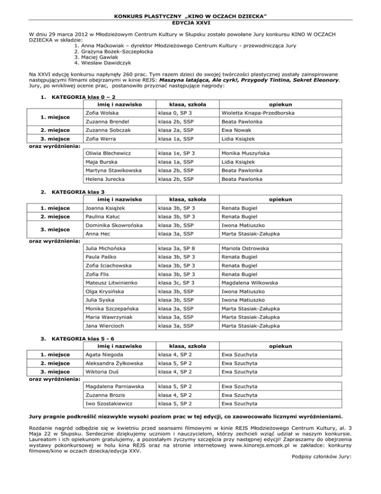 KONKURS PLASTYCZNY „KINO W OCZACH DZIECKA” EDYCJA XXVI W dniu 29 marca 2012 w Młodzieżowym Centrum Kultury w Słupsku zostało powołane Jury konkursu KINO W OCZACH DZIECKA w składzie: 1. Anna Maćkowiak – dyrektor Młodzieżowego Centrum Kultury - przewodnicząca Jury 2. Grażyna Bożek-Szczepłocka 3. Maciej Gawlak 4. Wiesław Dawidczyk Na XXVI edycję konkursu napłynęły 260 prac. Tym razem dzieci do swojej twórczości plastycznej zostały zainspirowane następującymi filmami obejrzanymi w kinie REJS: Maszyna latająca, Ale cyrk!, Przygody Tintina, Sekret Eleonory. Jury, po wnikliwej ocenie prac, postanowiło przyznać następujące nagrody: 1. KATEGORIA klas 0 – 2 imię i nazwisko klasa, szkoła opiekun Zofia Wolska klasa 0, SP 3 Wioletta Knapa-Przedborska Zuzanna Brendel klasa 2b, SSP Beata Pawlonka 2. miejsce Zuzanna Sobczak klasa 2a, SSP Ewa Nowak 3. miejsce Zofia Werra klasa 1a, SSP Lidia Książek Oliwia Blechewicz klasa 1e, SP 3 Monika Muszyńska Maja Burska klasa 1a, SSP Lidia Książek Martyna Stawikowska klasa 2b, SSP Beata Pawlonka Helena Jurecka klasa 2b, SSP Beata Pawlonka 1. miejsce oraz wyróżnienia: 2. KATEGORIA klas 3 imię i nazwisko klasa, szkoła opiekun 1. miejsce Joanna Książek klasa 3b, SP 3 Renata Bugiel 2. miejsce Paulina Kałuc klasa 3b, SP 3 Renata Bugiel Dominika Skowrońska klasa 3b, SSP Iwona Matiuszko Anna Hec klasa 3a, SSP Marta Stasiak-Załupka Julia Michońska klasa 3a, SP 8 Mariola Ostrowska Paula Paśko klasa 3b, SP 3 Renata Bugiel Zofia Iciachowska klasa 3b, SP 3 Renata Bugiel Zofia Flis klasa 3b, SP 3 Renata Bugiel Mateusz Litwinienko klasa 3c, SP 3 Magdalena Wilkowska Olga Krysińska klasa 3b, SSP Iwona Matiuszko Julia Syska klasa 3b, SSP Iwona Matiuszko Monika Szczepańska klasa 3a, SSP Marta Stasiak-Załupka Maria Wawrzyniak klasa 3a, SSP Marta Stasiak-Załupka Jana Wiercioch klasa 3a, SSP Marta Stasiak-Załupka 3. miejsce oraz wyróżnienia: 3. KATEGORIA klas 5 - 6 imię i nazwisko klasa, szkoła opiekun 1. miejsce Agata Niegoda klasa 4, SP 2 Ewa Szuchyta 2. miejsce Aleksandra Żyłkowska klasa 5, SP 2 Ewa Szuchyta 3. miejsce Wiktoria Duś klasa 4, SP 2 Ewa Szuchyta Magdalena Parniawska klasa 5, SP 2 Ewa Szuchyta Zuzanna Brozis klasa 4, SP 2 Ewa Szuchyta Iwo Szostakiewicz klasa 5, SP 2 Ewa Szuchyta oraz wyróżnienia: Jury pragnie podkreślić niezwykle wysoki poziom prac w tej edycji, co zaowocowało licznymi wyróżnieniami. Rozdanie nagród odbędzie się w kwietniu przed seansami filmowymi w kinie REJS Młodzieżowego Centrum Kultury, al. 3 Maja 22 w Słupsku. Serdecznie dziękujemy uczniom i nauczycielom, którzy zechcieli wziąć udział w naszym konkursie. Laureatom i ich opiekunom gratulujemy, a pozostałym życzymy szczęścia przy następnej edycji! Zapraszamy do obejrzenia wystawy pokonkursowej w holu kina REJS oraz na stronie internetowej www.kinorejs.emcek.pl w zakładce: konkursy filmowe/kino w oczach dziecka/edycja XXV. Podpisy członków Jury: