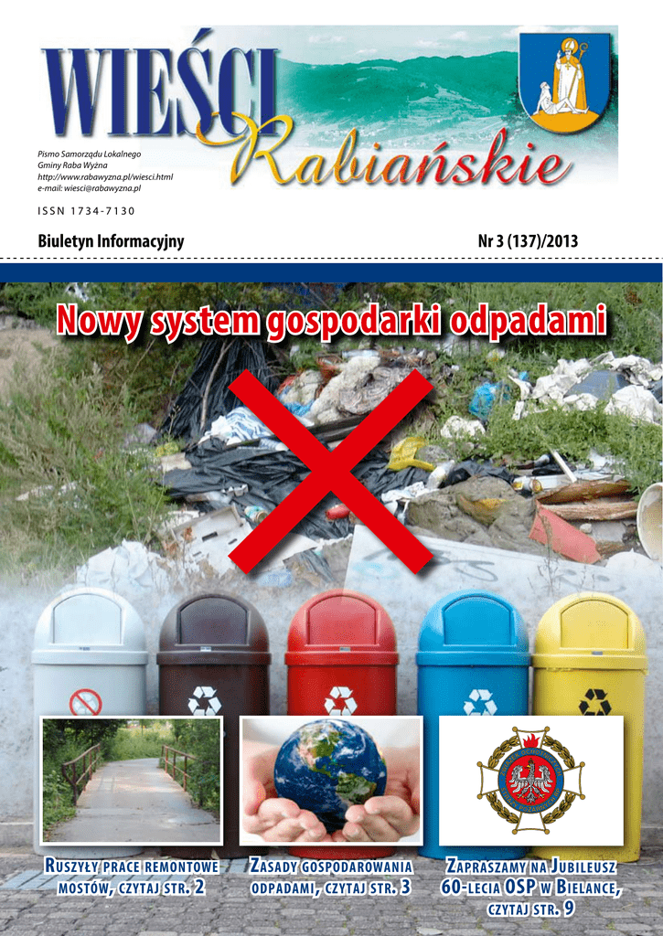 Pismo Samorządu Lokalnego Gminy Raba Wyżna http://www.rabawyzna.pl/wiesci.html e-mail: [email protected] ISSN 1734-7130 Biuletyn Informacyjny Nr 3 (137)/2013 Nowy system gospodarki odpadami R uszyły prace remontowe mostów, czytaj str. 2 Z asady gospodarowania odpadami , czytaj str. 3 Z apraszamy na J ubileusz 60- lecia OSP w B ielance , czytaj str. 9 wieści inwestycje samorządowe 2 BIELANKA I BUKOWINA OSIEDLE I HARKABUZ I PODSARNIE I RABA WYŻNA I ROKICINY PODHALAŃSKIE I SIENIAWA I SKAWA N owe nawierzchnie drogowe W Rokicinach Podhalańskich wykonana została nowa nawierzchnia asfaltowa na długości 420 mb. Zadanie o wartości 203 925,27 zł w 100% sfinansowane zostało ze środków Ministerstwa Administracji i Cyfryzacji, w ramach usuwania skutków klęsk żywiołowych. Zadanie polegało na wyrównaniu istniejącej warstwy drogi, wzmocnieniu nawierzchni geosiatką oraz ułożeniu warstwy ścieralnej. w miejscowościach Rokiciny Podhalańskie na drodze Muzykówka oraz w Skawie na roli Otrębówka. Gmina otrzymała promesę na kwotę 515 604 zł, co stanowi 80% dofinansowania wartości materiałowej inwestycji. Prace wykonane zostaną przez Wojskową Jednostkę Inżynieryjną NISKO. Wojsko będzie zakwaterowane w remizie OSP w Rokicinach Podhalańskich i w pierwszej kolejności wykonany zostanie most właśnie w tej miejscowości. Środki na tę inwestycję zostaną przekazane przez Ministerstwo Administracji i Cyfryzacji ze środków przeznaczonych na usuwanie skutków klęsk żywiołowych. Gmina pokryje koszty związane z pobytem wojska. Zakończenie inwestycji przypada na listopad 2013. R ealizacja zadań z funduszu sołeckiego Kolejne remonty dróg realizowane są w Skawie. – Ze środków własnych remontujemy nawierzchnie czterech dróg o łącznej długości ok. 2 kilometrów. Zadania te kosztują gminę ok. 350 000 zł. Trwają prace remontowe na drodze gminnej w Sieniawie (rola Łajkówka), gdzie na odcinku 0,5 km położono betonowe płyty. W Podsarniu przeprowadzono remont drogi gminnej Marszałowa o długości 0,5 km z nawierzchni kamiennej. Remonty dróg gruntowych prowadzone są na terenie Raby Wyżnej, gdzie ze środków własnych powstaje 0,5 kilometra nawierzchni asfaltowej na drodze gminnej na roli Kumorówka. Zakończony został remont centrum wsi w Rokicinach Podhalańskich, gdzie odnowiony został plac zabaw za kwotę 10 000 zł. W ramach zadania odnowiono ogrodzenie, wymieniono zniszczone deski i belki, a także piasek w piaskownicy. W Sieniawie odremontowano altanę w centrum miejscowości, przy której wykonano wylewkę i odwodnienie piwniczki a także naprawiono poręcze. Zakupione zostało nagłośnienie do Szkoły Podstawowej w Sieniawie za kwotę 10 000 zł, z czego 5000 zł stanowią środki z funduszu sołeckiego oraz 5000 zł z Komitetu Rodzicielskiego. W Podsarniu wykonane zostało nasadzenie zielenią centrum miejscowości oraz terenu przy Szkole Podstawowej, podobnie jak w Sieniawie, gdzie również zakupione zostały czujniki przeciw pożarowe do Przedszkola i Biblioteki Gminnej. W Bielance zamontowany został monitoring przy Szkole Podstawowej i remizie OSP, natomiast w Rabie Wyżnej wykonany został remont schodów przy drodze wojewódzkiej. R emonty obiektów K ładka piesza Droga w Rokicinach Podhalańskich mostow ych Kilkuletnie starania wójta o pozyskanie środków na remonty mostów przyniosły efekt w postaci rozpoczynajacych się właśnie prac związanych z remontem mostów Trwają prace przy budowie kładki pieszo-rowerowej w Rabie Wyżnej. Obecnie wykonane zostało umocnienie brzegów oraz zamontowane zostały barierki. Kładka prowadzić będzie z powstającego placu wielofunkcyjnego w kierunku Domu Parafialnego. Wieści Rabiańskie nr 3/2013 wieści samorządowe 3 BIELANKA I BUKOWINA OSIEDLE I HARKABUZ I PODSARNIE I RABA WYŻNA I ROKICINY PODHALAŃSKIE I SIENIAWA I SKAWA O świetlenie uliczne Na terenie gminy dobudowane zostało oświetlenie uliczne w miejscowościach: Skawa, Bielanka i Bukowina Osiedle, zlokalizowane przy drogach gminnych i powiatowych. W Bielance powstanie 800 mb o wartości 79 185 zł, w Skawie 1 km o wartości 61 044 zł, natomiast w Bukowinie Osiedlu 649 mb za 65 000 zł. P lanowane inwestycje Gmina Raba Wyżna złożyła wnioski do Lokalnej Grupy Działania „Przyjazna Dolina Raby” działajacej w ramach Programu Rozwoju Obszarów Wiejskich na realizację zadań: -budowa chodnika w miejscowości Skawa, -budowa boiska poliuretanowego ogólnodostępnego przy Szkole Podstawowej w Rokicinach Podhalańskich. Ponadto złożony został wniosek na budowę placu zabaw przy Szkole Podstawowej w Rabie Wyżnej w ramach programu Radosna Szkoła. O dbiór odpadów Informujemy właścicieli nieruchomości, którzy złożyli deklaracje "o wysokości opłaty za gospodarowanie odpadami komunalnymi składanej przez właścicieli nieruchomości zamieszkanych położonych na obszarze Gminy Raba Wyżna", że została wysłana do każdego gospodarstwa INFORMACJA O SPOSOBIE UISZCZANIA OPŁATY ZA GOSPODAROWANIE ODPADAMI KOMUNALNYMI wraz z harmonogramem wywozu odpadów oraz naklejkami z indywidualnymi kodami kreskowymi. Zgodnie z uchwałą nr XXX/220/2013 Rady Gminy Raba Wyżna z dnia 21 marca 2013r., w sprawie określenia terminu, częstotliwości i trybu uiszczania opłaty za gospodarowanie odpadami komunalnymi: właściciele nieruchomości zamieszkanych położonych na terenie Gminy Raba Wyżna zobowiązani są wnosić opłatę za gospodarowanie odpadami komunalnymi w łącznej wysokości za dwa miesiące kalendarzowe w terminie do końca dwumiesięcznego okresu rozliczeniowego. Wpłaty w wysokości ustalonej w deklaracji należy dokonywać na gminny rachunek bankowy prowadzony dla Zakładu Gospodarki Komunalnej i Mieszkaniowej w Rabie Wyżnej przez Bank Spółdzielczy w Rabie Wyżnej. Numer konta bankowego jest indywidualny dla każdego gospodarstwa domowego zgłoszonego w deklaracji. Wpłaty można również dokonywać bez pro