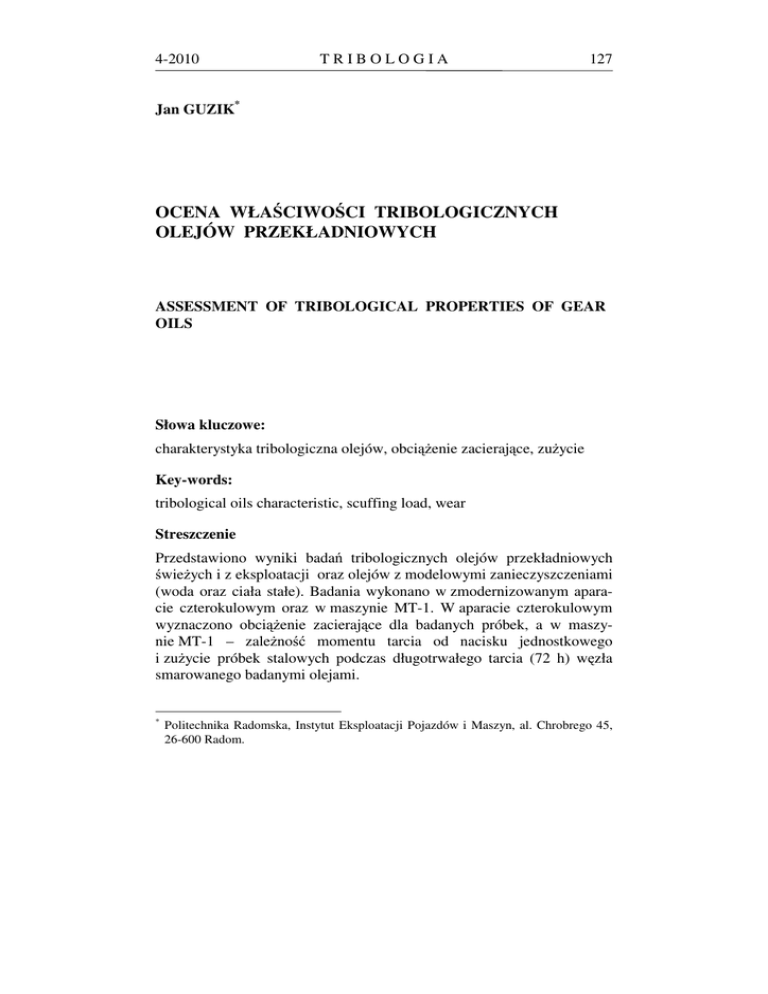 4-2010 TRIBOLOGIA 127 Jan GUZIK* OCENA WŁAŚCIWOŚCI TRIBOLOGICZNYCH OLEJÓW PRZEKŁADNIOWYCH ASSESSMENT OF TRIBOLOGICAL PROPERTIES OF GEAR OILS Słowa kluczowe: charakterystyka tribologiczna olejów, obciążenie zacierające, zużycie Key-words: tribological oils characteristic, scuffing load, wear Streszczenie Przedstawiono wyniki badań tribologicznych olejów przekładniowych świeżych i z eksploatacji oraz olejów z modelowymi zanieczyszczeniami (woda oraz ciała stałe). Badania wykonano w zmodernizowanym aparacie czterokulowym oraz w maszynie MT-1. W aparacie czterokulowym wyznaczono obciążenie zacierające dla badanych próbek, a w maszynie MT-1 – zależność momentu tarcia od nacisku jednostkowego i zużycie próbek stalowych podczas długotrwałego tarcia (72 h) węzła smarowanego badanymi olejami. * Politechnika Radomska, Instytut Eksploatacji Pojazdów i Maszyn, al. Chrobrego 45, 26-600 Radom. 128 TRIBOLOGIA 4-2010 WPROWADZENIE Zanieczyszczenia powstające podczas eksploatacji oleju smarowego, w tym przekładniowego, pogarszają jakość oleju i są przyczyną jego wymian. Użytkownik przy wymianie oleju powinien kierować się zaleceniami producenta maszyny (np. samochodu), ale zalecenia dostosowane są do typowych sytuacji. W sytuacjach nietypowych, przy wymuszeniach znacznie mniejszych lub znacznie większych od typowych lub dla nowych olejów, brakuje kryteriów wymiany. Uznano za celowe określenie wpływu modelowych zanieczyszczeń na właściwości tribologiczne samochodowych olejów przekładniowych. Zanieczyszczeniami powstającymi podczas eksploatacji olejów są woda oraz zanieczyszczenia stałe. METODY BADAWCZE ORAZ BADANE PRÓBKI OLEJOWE Wykorzystano dwa rodzaje maszyn tarciowych: zmodernizowany aparat czterokulowy, z rosnącym obciążaniem węzła tarcia [L. 1], do wyznaczania obciążenia zacierającego oraz maszynę tarciową MT-1 służącą do pomiaru zużycia próbek stalowych podczas długotrwałego docierania węzła (3 doby). W maszynie MT-1 wyznaczano też zależność momentu tarcia od rosnącego nacisku jednostkowego [L. 2]. Widmo w podczerwieni oleju przekładniowego z eksploatacji wykazało, że zawiera on pewne ilości wody, o czym świadczy szeroki pik w paśmie 3400 cm-1 (Rys. 1). Badania wykonano dla oleju przekładniowego Hipol 15F z eksploatacji oraz świeżego. Badano też olej świeży z zanieczyszczeniami modelowymi: wodą destylowaną (5% emulsja) oraz z pyłem testowym (2% dyspersja). Pył testowy z Arizony, stosowany do badania filtrów, składa się głównie z krzemionki, a ze względu na twardość może być ścierniwem, czyli spełniać warunki dla niekorzystnych cząstek stałych [L. 3]. W celu porównawczym badano też olej bazowy (niezawierający dodatków) czysty oraz z zawartością 2% pyłu testowego. Metodyka badań w aparacie czterokulowym oraz w maszynie MT-1 była analogiczna do stosowanych i opublikowanych poprzednio [L. 4, 5, 6]. 4-2010 TRIBOLOGIA 129 95 93 1 91 89 Transmisja [%] 87 85 83 81 79 77 75 3800 2 3700 3600 3500 3400 3300 3200 3100 3000 Liczba falowa [cm-1] Rys. 1. Widmo w podczerwieni w paśmie 3400 cm-1: 1 – świeży olej Hipol 15F, 2 – olej Hipol 15F z eksploatacji Fig. 1. IR spectrum on the range 3400 cm-1: 1 – fresh oil Hipol 15F, 2 – used Hipol 15F WYNIKI BADAŃ Na Rys. 2 porównano zmiany momentu tarcia wyznaczone w aparacie czterokulowym, a w Tabeli 1 zestawiono wartości obciążenia zacierającego wynikające z tych pomiarów; podano też lepkości badanych olejów. Oznaczenia linii na Rys. 2 są zgodne z Tabelą 1. Z Rys. 2 i Tabeli 1 wynika, że obciążenie zacierające dla oleju bazowego czystego i z pyłem testowym pokrywają się i są zdecydowanie mniejsze niż dla któregokolwiek oleju przekładniowego. Wartości dla oleju przekładniowego (świeżego, z eksploatacji oraz zawierającego pył testowy) są zbliżone do siebie, natomiast najwyższe wartości stwierdzono dla oleju z wodą: być może odparowanie wody ochładza węzeł tarcia zmniejszając skłonność do sczepień adhezyjnych. Dalsze badania wykonano w maszynie MT-1 wyznaczając kolejno: a) moment tarcia w funkcji nacisku jednostkowego (v = 0,1m/s, p = = ÷25MPa), b) zużycie próbki stalowej podczas 72-godz. tarcia (v = 0,4m/s, p = = 12,5MPa), c) ponowny pomiar momentu tarcia w funkcji nacisku jednostkowego, po tarciu wg b, w warunkach identycznych z punktem a. 130 TRIBOLOGIA 4-2010 5 4,5 2 4 3,5 Moment tarcia [Nm] 4 3 2,5 5 6 2 3 1,5 1 1 0,5 0 0 500 1000 1500 2000 2500 Obciążenie [N] Rys. 2. Porównanie zmian momentu tarcia w funkcji obciążenia, wyznaczone w węźle aparatu czterokulowego smarowanym badanymi olejami Fig. 2. Comparison changes of friction moment as a function of load using Four-Ball apparatus lubricating with tested oil Tabela 1. Obciążenie zacierające wyznaczone na podstawie przebiegów z Rys. 2 Table 1. Scuffing load determinated considering Fig. 2 runs Nr Oznaczenie próbki Lepkość próbki w 40°C [mm2/s] Obciążenie zacierające [N] 1 Olej Hipol 15F, świeży 201,2 1600 2 Hipol 15F z eksploatacji 221,9 1550 3 Hipol 15F + 5% wody - 2100 4 Hipol 15F + 2% pyłu - 1300 5 Olej bazowy 92,1 800 6 Olej bazowy + 2% pyłu - 800 Na Rys. 3 porównano wartości momentu tarcia dla węzła maszyny MT-1, smarowanego olejami przekładniowymi po zalaniu oleju, czyli wg punktu a. Na Rys. 4 przedstawiono analogiczne wartości wyznaczone wg punktu c; numery przebiegów są zgodne z Tabelą 1. 4-2010 TRIBOLOGIA 131 0,4 0,35 Moment tarcia [Nm] 0,3 0,25 2 0,2 3 0,15 4 1 0,1 0,05 0 0 5 10 15 20 25 Nacisk jednostkowy [MPa] Rys. 3. Porównanie zależności momentu tarcia od nacisku wyznaczone w węźle maszyny MT-1 smarowanym olejami przekładniowymi przed długotrwałym tarciem Fig. 3. Comparison dependence of friction moment on pressure determined using MT-1 machine lubricating with gear oils before prolonged friction process 0,4 0,35 Moment tarcia [Nm] 0,3 1 0,25 4 3 0,2 0,15 0,1 2 0,05 0 0 5 10 15 20 25 