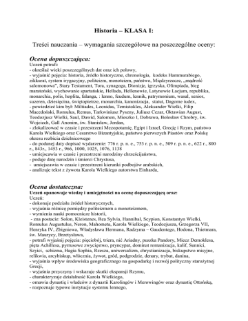 Historia – KLASA I: Treści nauczania – wymagania szczegółowe na poszczególne oceny: Ocena dopuszczająca: Uczeń potrafi: - określać wieki poszczególnych dat oraz ich połowy, - wyjaśnić pojęcia: historia, źródło historyczne, chronologia, kodeks Hammurabiego, zikkurat, system irygacyjny, politeizm, monoteizm, państwo, Międzyrzecze, „mądrość salomonowa”, Stary Testament, Tora, synagoga, Dionizje, igrzyska, Olimpiada, bieg maratoński, wychowanie spartańskie, Hellada, Hellenowie, Latynowie Lacjum, republika, monarchia, polis, hoplita, falanga, : lenno, feudum, lennik, patrymonium, wasal, senior, suzeren, dziesięcina, świętopietrze, monarchia, kanonizacja, statut, Dagome iudex, - powiedzieć kim był: Miltiades, Leonidas, Temistokles, Aleksander Wielki, Filip Macedoński, Romulus, Remus, Tarkwiniusz Pyszny, Juliusz Cezar, Oktawian August, Teodozjusz Wielki, Saul, Dawid, Salomon, Mieszko I, Dobrawa, Bolesław Chrobry, św. Wojciech, Gall Anonim, św. Stanisław, Jordan, - zlokalizować w czasie i przestrzeni Mezopotamię, Egipt i Izrael, Grecję i Rzym, państwo Karola Wielkiego oraz Cesarstwo Bizantyjskie, państwo pierwszych Piastów oraz Polskę okresu rozbicia dzielnicowego - do podanej daty dopisać wydarzenie: 776 r. p. n. e., 753 r. p. n. e., 509 r. p. n. e., 622 r., 800 r., 843r., 1453 r., 966, 1000, 1025, 1076, 1138 - umiejscawia w czasie i przestrzeni narodziny chrześcijaństwa, - podaje datę narodzin i śmierci Chrystusa, - umiejscawia w czasie i przestrzeni kierunki podbojów arabskich, - analizuje tekst z żywota Karola Wielkiego autorstwa Einharda, Ocena dostateczna: Uczeń opanowuje wiedzę i umiejętności na ocenę dopuszczającą oraz: Uczeń: - dokonuje podziału źródeł historycznych, - wyjaśnia różnicę pomiędzy politeizmem a monoteizmem, - wymienia nauki pomocnicze historii, - zna postacie: Solon, Kleistenes, Rea Sylvia, Hannibal, Scypion, Konstantyn Wielki, Romulus Augustulus, Neron, Mahometa, Karola Wielkiego, Teodozjusza, Grzegorza VII, Henryka IV, Zbigniewa, Władysława Hermana, Radzyma – Gaudentego, Hodona, Thietmara, św. Maurycy, Brzetysława, - potrafi wyjaśnij pojęcia: pięciobój, triera, nić Ariadny, puszka Pandory, Miecz Demoklesa, pięta Achillesa, pyrrusowe zwycięstwo, pryncypat, dominat romanizacja, kalif, Sunnici, Szyici, schizma, Hagia Sophia, Rzesza, uniwersalizm, chrystianizacja, biskupstwo misyjne, relikwia, arcybiskup, włócznia, żywot, gród, podgrodzie, denary, trybut, danina, - wyjaśnia wpływ środowiska geograficznego na gospodarkę i rozwój polityczny starożytnej Grecji, - wyjaśnia przyczyny i wskazuje skutki ekspansji Rzymu, - charakteryzuje działalność Karola Wielkiego, - omawia dynastię i władców z dynastii Karolingów i Merowingów oraz dynastię Ottońską, - rozpoznaje typowe instytucje systemu lennego, - do podanej daty: 999, 1116 potrafi podać wydarzenie, Ocena dobra: Uczeń opanowuje wiedzę i umiejętności na ocenę dostateczna oraz: Uczeń: - określa granice czasowe epok historycznych, - opisuje poszczególne nauki pomocnicze historii, - opiuje i odróżnia poszczególne przykłady źródeł historycznych, - porównuje koczowniczy tryb życia z osiadłym, - charakteryzuje strukturę społeczeństwa i system wierzeń w Egipcie, - charakteryzuje główne zasady judaizmu, - odwołuje się do przykładów politeizmu i monoteizmu, - zna genezę teatru greckiego, - wie kim był Drakon i Etruskowie. - wyjaśnia pojęcia: komedia, tragedia, dramat, - omawia organizację społeczeństwa w Rzymie republikańskim i cesarskim, - opisuje postawę Rzymian wobec niewolników i ludów podbitych, - charakteryzuje najważniejsze osiągnięcia kultury materialnej i duchowej antycznego świata w różnych dziedzinach (nauce, architekturze, sztuce, literaturze), - omawia proces rozprzestrzeniania się chrześcijaństwa, - wskazuje przyczyny i przykłady prześladowania chrześcijan w państwie rzymskim, - omawia kierunki rozprzestrzeniania się chrześcijaństwa, - wskazuje przyczyny i przykłady prześladowania chrześcijan w państwie rzymskim, - wskazuje na mapie zasięg podbojów arabskich, - opisuje podstawowe zasady i symbole Islamu, - wyjaśnia pojęcie: arabeski, - omawia proces powstania Państwa Kościelnego, - wyjaśnia na czym polegał renesans karoliński, - charakteryzuje główne idee uniwersalnego cesarstwa Ottona III, - rozpoznaje osiągnięcia kultury bizantyjskiej w dziedzinie architektury i sztuki, - zna postać Justyniana, - zna postać Ibrahima ibn Jakuba, Stefana Wielkiego, Jarosława Mądrego, Hodona, Miecława, Bernarda Hiszpana, Henryka IV, Henryka V, Ottona z Bambergu, - zna daty: 965, 972, 1002 – 1018, 1034, 1079, - wskazuje na przykładzie państwa pierwszych Piastów charakterystyczne cechy monarchii patrymonialnej, - wyjaśnia okoliczności przyjęcia chrztu przez Piastów oraz następstwa kulturowe, społeczne i polityczne chrystianizacji w Polsce, Ocena bardzo dobra: Uczeń opanowuje wiedzę i umiejętności na ocenę dobrą oraz: Uczeń: - opisuje skutki przyjęcia przez człowieka trybu osiadłego, - wyjaśnia zależności pomiędzy środowiskiem geograficznym a warunkami życia człowieka, - wyjaśnia znaczenie pisma i prawa w procesie powstawania państw, - rozpoznaje typy pisma wykształcone na terenie Mezopotamii i Egiptu, - umiejscawia w czasie i porównuje system sprawowania władzy oraz organizację społeczeństwa w Sparcie i Atenach peryklejskich, - charakteryzuje czynniki integrujące starożytnych Greków (język, system wierzeń, teatr oraz igrzyska olimpijskie), - charakteryzuje system sprawowania władzy w Rzymie, - podaje przykłady wpływu kultury greckiej na kulturę rzymska, - rozróżnia wewnętrzne i zewnętrzne przyczyny upadku starożytnego państwa rzymskiego - charakteryzuje najważniejsze osiągnięcia kultury materialnej i duchowej antycznego świata w dziedzinie filozofii, - podaje przykłady osiągnięć cywilizacyjnych antyku, kt