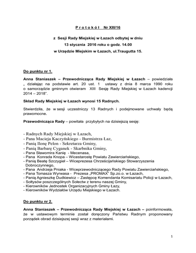 Protokół Nr XIII/16 z Sesji Rady Miejskiej w Łazach odbytej w dniu 13 stycznia 2016 roku o godz. 14.00 w Urzędzie Miejskim w Łazach, ul.Traugutta 15. Do punktu nr 1. Anna Staniaszek – Przewodnicząca Rady Miejskiej w Łazach – powiedziała „ działając na podstawie art. 20 ust. 1 ustawy z dnia 8 marca 1990 roku o samorządzie gminnym otwieram XIII Sesję Rady Miejskiej w Łazach kadencji 2014 – 2018”. Skład Rady Miejskiej w Łazach wynosi 15 Radnych. Stwierdziła, że w sesji uczestniczy 13 Radnych i podejmowane uchwały będą prawomocne. Przewodnicząca Rady – powitała przybyłych na dzisiejszą sesję: - Radnych Rady Miejskiej w Łazach, - Pana Macieja Kaczyńskiego - Burmistrza Łaz, - Panią Ilonę Pelon - Sekretarza Gminy, - Panią Barbarę Cyganek - Skarbnika Gminy, - Pana Sławomira Kanię - Mecenasa, - Pana Konrada Knopa – Wicestarostę Powiatu Zawierciańskiego, - Panią Beatę Szczygieł – Wiceprezesa Chrześcijańskiego Stowarzyszenia Dobroczynnego, - Pana Andrzeja Pniaka - Wiceprzewodniczącego Rady Powiatu Zawierciańskiego, - Pana Tomasza Wyrwasa - Prezesa „PROMAX” Sp.zo.o. w Łazach, - Panią Agnieszkę Dudkiewicz – Zastępcę Komendanta Komisariatu Policji w Łazach, - Sołtysów poszczególnych Sołectw z terenu naszej Gminy, - Kierowników Jednostek Organizacyjnych Gminy Łazy, - Kierowników Wydziałów Urzędu Miejskiego w Łazach. Do punktu nr 2. Anna Staniaszek – Przewodnicząca Rady Miejskiej w Łazach – poinformowała, że w ustawowym terminie został doręczony Państwu Radnym proponowany porządek obrad dzisiejszej sesji wraz z materiałami. 1 Następnie poinformowała, iż do Rady Miejskiej wpłynęło pismo od Pana Burmistrza dotyczące wprowadzenia dodatkowego punktu do porządku obrad. Zaproponowała wprowadzenie jako punktu 12 : Podjęcie uchwały w sprawie zmiany uchwały Nr XII/104/15 Rady Miejskiej w Łazach z dnia 21 grudnia 2015 roku w sprawie określenia wysokości i zasad ustalania i rozliczania dotacji celowej dla podmiotów prowadzących żłobki na obszarze Gminy Łazy. Zaproponowała również wprowadzenie dodatkowych punktów: jako punkt 15 - Podjęcie uchwały w sprawie: przyjęcia planu pracy Rady Miejskiej w Łazach na 2016 rok, jako punkt 16 - Sprawozdanie z pracy Komisji Rewizyjnej Rady Miejskiej w Łazach za 2015 rok, jako punkt 17 - Podjęcie uchwały w sprawie: przyjęcia planu pracy i planu kontroli Komisji Rewizyjnej Rady Miejskiej w Łazach na 2016 rok. Stefan Kubasik – Wiceprzewodniczący Rady Miejskiej w Łazach proponowany porządek obrad wraz ze zmianami: odczytał 1.Otwarcie sesji i stwierdzenie quorum. 2.Zatwierdzenie porządku obrad. 3.Przyjęcie protokołu z sesji Rady Miejskiej w Łazach z dnia 21 grudnia 2015 r. 4.Podjęcie uchwały w sprawie: zmiany Uchwały Nr XI/87/15 Rady Miejskiej w Łazach z dnia 8 grudnia 2015 r. w sprawie określenia wysokości stawek podatku od nieruchomości oraz zwolnień od podatku od nieruchomości. 5.Podjęcie uchwały w sprawie: zmiany Uchwały Nr XI/88/15 Rady Miejskiej w Łazach z dnia 8 grudnia 2015 r. w sprawie: zwolnienia od podatku od nieruchomości nowo wybudowanych budynków mieszkalnych jednorodzinnych. 6.Podjęcie uchwały w sprawie: zmiany Uchwały Nr XI/90/15 Rady Miejskiej w Łazach z dnia 8 grudnia 2015 r. w sprawie: określenia wysokości rocznych stawek podatku od środków transportowych oraz zwolnień od podatku od środków transportowych. 7.Podjęcie uchwały w sprawie: określenia wzorów formularzy i deklaracji podatkowych. 8.Podjęcie uchwały w sprawie: wprowadzenia opłaty targowej. informacji 9.Podjęcie uchwały w sprawie: przyjęcia „Gminnego Programu Profilaktyki i Rozwiązywania Problemów Alkoholowych dla Gminy Łazy na rok 2016”. 10.Podjęcie uchwały w sprawie: określenia kryteriów naboru do klas pierwszych gimnazjów, dla których organem prowadzącym jest Gmina Łazy, w postępowaniu rekrutacyjnym dla kandydatów zamieszkałych poza obwodem gimnazjum oraz określenia dokumentów niezbędnych do potwierdzenia tych kryteriów. 11.Podjęcie uchwały w sprawie: określenia kryteriów naboru do klas pierwszych szkół podstawowych, dla których organem prowadzącym jest Gmina Łazy, w postępowaniu rekrutacyjnym dla kandydatów zamieszkałych poza obwodem szkoły oraz określenia 2 dokumentów niezbędnych do potwierdzenia tych kryteriów. 12.Podjęcie uchwały w sprawie zmiany uchwały Nr XII/104/15 Rady Miejskiej w Łazach z dnia 21 grudnia 2015 roku w sprawie określenia wysokości i zasad ustalania i rozliczania dotacji celowej dla podmiotów prowadzących żłobki na obszarze Gminy Łazy. 13.Podjęcie uchwały w sprawie: wyznaczenie przedstawiciela do Rady Społecznej Szpitala Powiatowego w Zawierciu na okres kadencji 2015-2019. 14.Podjęcie uchwały w sprawie: wyznaczenie przedstawiciela do Rady Społecznej Zakładu Lecznictwa Ambulatoryjnego w Zawierciu na okres kadencji 2015-2019. 15.Podjęcie uchwały w sprawie: przyjęcia planu pracy Rady Miejskiej w Łazach na 2016 rok. 16.Sprawozdanie z pracy Komisji Rewizyjnej Rady Miejskiej w Łazach za 2015 rok. 17.Podjęcie uchwały w sprawie: przyjęcia planu pracy i planu kontroli Komisji Reweizyjnej Rady Miejskiej w Łazach na 2016 rok. 18.Interpelacje radnych. 19.Zapytania radnych. 20.Informacja dotycząca działalności w Łazach za okres między sesjami Rady. Burmistrza Łaz i Urzędu Miejskiego 21.Odpowiedzi na zapytania. 22.Wolne wnioski i informacje. 23.Informacja Przewodniczącej Rady Miejskiej w Łazach o pracy między sesjami i otrzymanej korespondencji. 24.Zamknięcie sesji. Następnie Pani Przewodnicząca zapytała, obrad. czy są inne propozycje do porządku Uwag i propozycji zmian do porządku obrad dzisiejszej sesji Radni nie wnieśli. W związku z powyższym Przewodnicząca Rady poddała pod głosowanie proponowany porządek obrad jak wyżej. W głosowaniu udział brało 13 Radnych. Rada Miejska w Łazach porządek obrad dzisiejszej Sesji Rady Miejskiej w