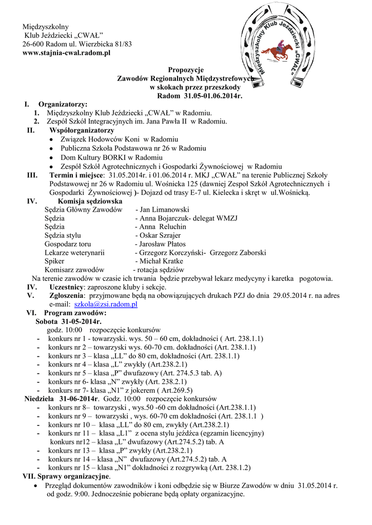 Międzyszkolny Klub Jeździecki „CWAŁ” 26-600 Radom ul. Wierzbicka 81/83 www.stajnia-cwal.radom.pl Propozycje Zawodów Regionalnych Międzystrefowych w skokach przez przeszkody Radom 31.05-01.06.2014r. I. Organizatorzy: 1. Międzyszkolny Klub Jeździecki „CWAŁ” w Radomiu. 2. Zespół Szkół Integracyjnych im. Jana Pawła II w Radomiu. II. Współorganizatorzy Związek Hodowców Koni w Radomiu Publiczna Szkoła Podstawowa nr 26 w Radomiu Dom Kultury BORKI w Radomiu Zespół Szkół Agrotechnicznych i Gospodarki Żywnościowej w Radomiu III. Termin i miejsce: 31.05.2014r. i 01.06.2014 r. MKJ „CWAŁ” na terenie Publicznej Szkoły Podstawowej nr 26 w Radomiu ul. Wośnicka 125 (dawniej Zespoł Szkół Agrotechnicznych i Gospodarki Żywnościowej )- Dojazd od trasy E-7 ul. Kielecka i skręt w ul.Wośnicką. IV. Komisja sędziowska Sędzia Główny Zawodów - Jan Limanowski Sędzia - Anna Bojarczuk- delegat WMZJ Sędzia - Anna Reluchin Sędzia stylu - Oskar Szrajer Gospodarz toru - Jarosław Płatos Lekarze weterynarii - Grzegorz Korczyński- Grzegorz Zaborski Spiker - Michał Kratke Komisarz zawodów - rotacja sędziów Na terenie zawodów w czasie ich trwania będzie przebywał lekarz medycyny i karetka pogotowia. IV. Uczestnicy: zaproszone kluby i sekcje. V. Zgłoszenia: przyjmowane będą na obowiązujących drukach PZJ do dnia 29.05.2014 r. na adres e-mail: [email protected] VI. Program zawodów: Sobota 31-05-2014r. godz. 10:00 rozpoczęcie konkursów - konkurs nr 1 - towarzyski. wys. 50 – 60 cm, dokładności ( Art. 238.1.1) - konkurs nr 2 – towarzyski wys. 60-70 cm. dokładności (Art. 238.1.1) - konkurs nr 3 – klasa „LL” do 80 cm, dokładności (Art. 238.1.1) - konkurs nr 4 – klasa „L” zwykły (Art.238.2.1) - konkurs nr 5 – klasa „P” dwufazowy (Art. 274.5.3 tab. A) - konkurs nr 6- klasa „N” zwykły (Art. 238.2.1) - konkurs nr 7- klasa „N1” z jokerem ( Art.269.5) Niedziela 31-06-2014r. Godz. 10:00 rozpoczęcie konkursów - konkurs nr 8– towarzyski , wys.50 -60 cm dokładności (Art.238.1.1) - konkurs nr 9 – towarzyski , wys. 60-70 cm dokładności (Art. 238.1.1 ) - konkurs nr 10 – klasa „LL” do 80 cm, zwykły (Art.238.2.1) - konkurs nr 11 – klasa „L1” z ocena stylu jeźdźca (egzamin licencyjny) konkurs nr12 – klasa „L” dwufazowy (Art.274.5.2) tab. A - konkurs nr 13 – klasa „P” zwykły (Art.238.2.1) - konkurs nr 14 – klasa „N” dwufazowy (Art.274.5.2) tab. A - konkurs nr 15 – klasa „N1” dokładności z rozgrywką (Art. 238.1.2) VII. Sprawy organizacyjne. Przegląd dokumentów zawodników i koni odbędzie się w Biurze Zawodów w dniu 31.05.2014 r. od godz. 9:00. Jednocześnie pobierane będą opłaty organizacyjne. Zakwaterowanie koni – stajnia MKJ „Cwał” Radom. Boksy – cena za 2 dni -120 zł, za jeden dzień 70 zł., ( ilość ograniczona, liczy się termin zgłoszenia ). Zgłoszenie na dwa dni zawodów nie jest równoznaczne z rezerwacją boksów. Organizator zapewnia tylko ściółkę dla koni Rezerwacja miejsc noclegowych we własnym zakresie - adresy hoteli najbliżej położonych - Arbiter Hotel ul. Michałowskiego 1, 26-600 Radom ,Tel. +48 (48) 332 08 60 - Szkolne Schronisko Młodzieżowe Radom ul. Limanowskiego 34/40, 26-600 Radom, tel. (0-48)360-22-14 - Hotel Promenada , ul. Bulwarowa 15,26-600 Radom, Tel. 48 360 88 77 Organizator dla wszystkich ekip zapewnia nieodpłatnie 1 posiłek każdego dnia trwania zawodów. W sobotę wieczorem odbędzie się ognisko wraz z poczęstunkiem fundowanym przez organizatorów. Organizator zapewnia nagrody pieniężne i puchary. Organizator przewiduje również nagrody rzeczowe, w konkursach P , N i N1 nagrody pieniężne. KONKURS PULA I II III Nr 5 (P) 250 150 100 500 Nr 6 (N) 400 250 150 800 Nr 7 (N1) 500 300 200 1000 Nr 12 (P) 250 150 100 500 Nr 13 (N) 400 250 150 800 Nr 14 (N1) 500 300 200 1000 Organizator zastrzega sobie prawo ograniczenia liczby wypłacanych nagród przy małej ilości startujących i tak; do 4 przejazdów- płatne jedno miejsce od 5 do 8 przejazdów –płatne miejsca 1-2 od 9 do 12 przejazdów – płatne miejsca 1-3 od 13 do16 przejazdów- płatne miejsca 1-4. Dla zwycięzców przewidziane flots Organizator nie ponosi odpowiedzialności za wypadki i kradzieże oraz inne szkody zaistniałe podczas zawodów. Zawody będą rozgrywane zgodnie z aktualnymi przepisami PZJ. Do startu dopuszczeni będą zawodnicy i konie spełniający wymogi wynikające z aktualnych przepisów PZJ. Opłata organizacyjna 120 zł. (sto dwadzieścia złotych) od konia startującego w zawodach. W przypadku startu tylko w jednym dniu opłata wyniesie 80 zł.(osiemdziesiąt złotych) od konia startującego w zawodach. Dodatkowa opłata organizacyjna za egzamin licencyjny – 20 zł od konia. Startowe od konia: (100% startowego przeznaczone na pulę nagród finansowych w danym konkursie); klasa P- 15zł klasa N-20 zł klasa N1-25zł Konkursy 1,2,8,9 – są konkursami towarzyskimi. Zawodników obowiązują aktualne badania lekarskie i ubezpieczenie NNW a konie paszport z aktualnymi szczepieniami. Zawodników niepełnoletnich obowiązuje pisemna zgoda rodziców lub prawnych opiekunów na start w zawodach. Organizator zastrzega sobie prawo do ewentualnych zmian w programie zawodów. Kodeks Postępowania z Koniem I. Polski Związek Jeździecki w ślad za Międzynarodową Federacją Jeździecką FEI oczekuje, że wszystkie osoby zaangażowane w jakikolwiek sposób w sporty konne, będą przestrzegać zasad niniejszego Kodeksu Postępowania z Koniem oraz przyjmą do wiadomości, że w każdym przypadku dobro konia musi być sprawą nadrzędną i nigdy nie może być podporządkowane współzawodnictwu sportowemu ani celom komercyjnym. II. Na wszystkich etapach treningu i przygotowań konia do startu w zawodach, dobro konia musi stać ponad wszelkimi innymi wymaganiami. Dotyczy to stałej opieki, metod treningu, starannego obrządku, kucia i transportu. III. Konie i