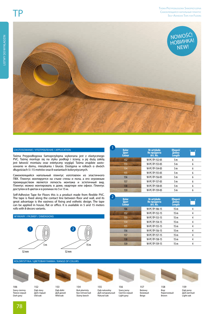Taśma Przypodłogowa Samoprzylepna Cамоклеящийся напольный плинтус Self-Adhesive Tape for Floors TP LISTWY DO WYKŁADZIN NOWOŚĆ! ! НОВИНКА NEW! 1 ZASTOSOWANIE / УПОТРЕБЛЕНИЕ / APPLICATION Taśma Przypodłogowa Samoprzylepna wykonana jest z elastycznego PVC. Taśmę montuje się na styku podłogi i ściany, a jej dużą zaletą jest łatwość montażu oraz estetyczny wygląd. Taśma znajdzie zastosowanie w domu, mieszkaniu i biurze. Dostępna w rolkach o dwóch długościach 5 i 15 metrów oraz 8 wariantach kolorystycznych. Cамоклеящийся напольный плинтус изготовлен из эластичного ПВХ. Плинтус монтируется на стыке стены и пола, а его огромным преимуществом является легкость монтажа и эстетичный вид. Плинтус можно монтировать в доме, квартире или офисе. Плинтус доступен в 8 цветах и в роликах по 5 и 15 м. Self-Adhesive Tape for Floors this is a product made from flexible PVC. The tape is fixed along the contact line between floor and wall, and its great advantage is the easiness of fixing and esthetic design. The tape can be applied in house, flat or office. It is available in 5 and 15 meters rolls with 8 decors variants. 2 WYMIARY / РАЗМЕР / DIMENSIONS 1 2 5m 15 m 52 mm Kolor Цвет Colour 152 153 154 155 156 157 158 159 Nr artykułu No продукта Art. No. W-PC-TP-152-05 W-PC-TP-153-05 W-PC-TP-154-05 W-PC-TP-155-05 W-PC-TP-156-05 W-PC-TP-157-05 W-PC-TP-158-05 W-PC-TP-159-05 Długość Длина Length 5m 5m 5m 5m 5m 5m 5m 5m 6 6 6 6 6 6 6 6 Kolor Цвет Colour 106 152 153 154 155 156 157 158 159 Nr artykułu No продукта Art. No. W-PC-TP-106-15 W-PC-TP-152-15 W-PC-TP-153-15 W-PC-TP-154-15 W-PC-TP-155-15 W-PC-TP-156-15 W-PC-TP-157-15 W-PC-TP-158-15 W-PC-TP-159-15 Długość Длина Length 15 m 15 m 15 m 15 m 15 m 15 m 15 m 15 m 15 m 4 4 4 4 4 4 4 4 4 52 mm KOLORYSTYKA / ЦВЕТОВАЯ ГАММА / RANGE OF COLURS 106 152 153 154 155 156 157 158 159 Szary ciemny Темно-серый Dark grey Dąb stary Дуб старый Old oak Dąb dziki Дуб дикий Wild oak Buk plamisty Бук пятнистый Stainy beech Dąb naturalny Дуб натуральный Natural oak Szary jasny Светло-серый Light grey Beżowy Бежевый Beige Brąz Коричневый Brown Dąb jasny Дуб светлый Light oak 78