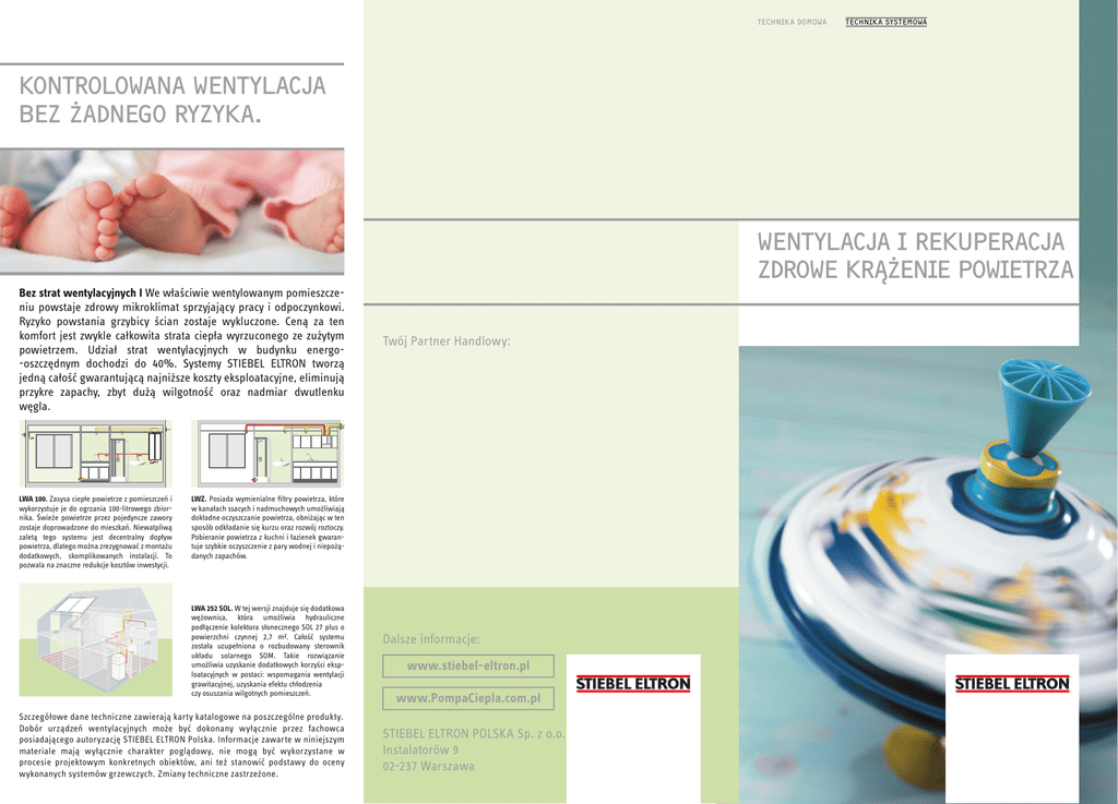 TECHNIKA DOMOWA TECHNIKA SYSTEMOWA KONTROLOWANA WENTYLACJA BEZ ŻADNEGO RYZYKA. WENTYLACJA I REKUPERACJA ZDROWE KRĄŻENIE POWIETRZA Bez strat wentylacyjnych I We właściwie wentylowanym pomieszczeniu powstaje zdrowy mikroklimat sprzyjający pracy i odpoczynkowi. Ryzyko powstania grzybicy ścian zostaje wykluczone. Ceną za ten komfort jest zwykle całkowita strata ciepła wyrzuconego ze zużytym powietrzem. Udział strat wentylacyjnych w budynku energo-oszczędnym dochodzi do 40%. Systemy STIEBEL ELTRON tworzą jedną całość gwarantującą najniższe koszty eksploatacyjne, eliminują przykre zapachy, zbyt dużą wilgotność oraz nadmiar dwutlenku węgla. °C 82 Twój Partner Handlowy: 35 65 E 55 65 E 55 °C 82 35 LWA 100. Zasysa ciepłe powietrze z pomieszczeń i wykorzystuje je do ogrzania 100-litrowego zbiornika. Świeże powietrze przez pojedyncze zawory zostaje doprowadzone do mieszkań. Niewatpliwą zaletą tego systemu jest decentralny dopływ powietrza, dlatego można zrezygnować z montażu dodatkowych, skomplikowanych instalacji. To pozwala na znaczne redukcje kosztów inwestycji. LWZ. Posiada wymienialne filtry powietrza, które w kanałach ssacych i nadmuchowych umożliwiają dokładne oczyszczanie powietrza, obniżając w ten sposób odkładanie się kurzu oraz rozwój roztoczy. Pobieranie powietrza z kuchni i łazienek gwarantuje szybkie oczyszczenie z pary wodnej i niepożądanych zapachów. LWA 252 SOL. W tej wersji znajduje się dodatkowa wężownica, która umożliwia hydrauliczne podłączenie kolektora słonecznego SOL 27 plus o powierzchni czynnej 2,7 m². Całość systemu została uzupełniona o rozbudowany sterownik układu solarnego SOM. Takie rozwiązanie umożliwia uzyskanie dodatkowych korzyści eksploatacyjnych w postaci: wspomagania wentylacji grawitacyjnej, uzyskania efektu chłodzenia czy osuszania wilgotnych pomieszczeń. Szczegółowe dane techniczne zawierają karty katalogowe na poszczególne produkty. Dobór urządzeń wentylacyjnych może być dokonany wyłącznie przez fachowca posiadającego autoryzację STIEBEL ELTRON Polska. Informacje zawarte w niniejszym materiale mają wyłącznie charakter poglądowy, nie mogą być wykorzystane w procesie projektowym konkretnych obiektów, ani też stanowić podstawy do oceny wykonanych systemów grzewczych. Zmiany techniczne zastrzeżone. Dalsze informacje: www.stiebel-eltron.pl www.PompaCiepla.com.pl STIEBEL ELTRON POLSKA Sp. z o.o. Instalatorów 9 02-237 Warszawa PODWÓJNE FUNKCJE: OGRZEWANIE I WENTYLACJA W JEDNYM ZDROWY MIKROKLIMAT TWOJEGO DOMU. Wtórne wykorzystanie ciepła I Wiszące, kompaktowe urządzenie LWA 100 to komfort ciepłej wody oraz centralnie wentylowanego mieszkania czy domu o powierzchni 120-140 m². W zwartej, kompaktowej konstrukcji znajduje się pompa ciepła, jednostka wentylacyjna oraz zbiornik 100 litrów z grzałką elektryczną. Pompa ciepła ogrzewa wodę do temperatury 55°C. Maksymalna temperatura to 85°C po użyciu przycisku grzałki. Ultracichy wentylator wytwarza w pomieszczeniach podciśnienie. Przez pojedyncze zawory jest doprowadzane świeże powietrze, a ciepłe jest zasysane i wykorzystywane do ogrzania zbiornika. Urządzenie posiada 3 tryby pracy dmuchawy, niezbędne czujniki pracy sprężarki i dmuchawy, regulator temperatury oraz przycisk grzałki. LWA 100 jest przeznaczone do niewielkich pomieszczeń a Inwestor oszczędza na montażu wielkich gabarytowo i kosztownych systemów do centralnej wentylacji. Wentylacja z premią I LWA 252/LWA 252 SOL to urządzenie do centralnej wentylacji budynku z odzyskiem ciepła oraz produkcji ciepłej wody. Posiada wbudowaną pompę ciepła powietrze/woda. Dolnym źródłem ciepła jest powietrze wentylacyjne w temperaturze od +15 do + 35°C. Wydajność dla trybu wentylacji mieści się w zakresie 50-280m³/h. Zintegrowany z pompą zbiornik 300 litrów pozwala na uzyskanie temperatury wody +65°C przy udziale wbudowanej grzałki. Pobór mocy elektrycznej to tylko 0,43 kW. Bez kurzu i wilgoci I LWZ to centrala wentylacyjna z rekuperatorem zaopatrująca w świeże powietrze mieszkanie i gwarantująca ok. 10-krotną redukcję strat wentylacyjnych. Wysokowydajny, przeciwprądowy wymiennik krzyżowy zapewnia wymianę ciepła pomiędzy powietrzem zużytym, a powietrzem pobieranym z otoczenia i dostarczanym do pomieszczeń mieszkalnych. W ten sposób można odzyskać aż do 90% energii. Bezstopniowa nastawa obrotów dwóch stopni poprawia dopasowanie wydajności do specyfiki obiektu. Dowolność miejsca montażu oraz kompatybilność z każdym systemem centralnego ogrzewania umożliwia stosowanie central wentylacyjnych typu LWZ 170 w nowobudowanych jak i modernizowanych obiektach. Niskie zużycie energii oraz bardzo cicha praca niewątpliwie podnoszą atrakcyjność urządzenia. LWA 100 LWA 252/LWA 252 SOL LWZ 170/170 plus, 270/270 plus Podwójne funkcje: centralna wentylacja i ogrzewanie wody użytkowej Kompaktowe urządzenie do centralnej wentylacji i ogrzewania wody Obniża wilgotność, redukuje przykre zapachy, roztocza i grzyby 3 tryby pracy wentylacji: dzienny, party, obniżony Podłączenie kolektora słonecznego dzięki wężownicy (LWA 252 SOL) LWZ 270 przeznaczony do wentylacji pomieszczeń aż do 290m² Zbiornik 100 litrów ogrzewany do 55°C dzięki pompie ciepła Bardzo korzystny współczynnik efektywności pompy ciepła 3,25* * przy parametrach: powietrze +20°C, woda w zasobniku +45°C LWA 100 Wysoka sprawność do 94%* oraz wydajność * Sprawność ok. 90% przy Δt 10°C LWA 252 LWZ 170 plus