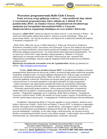 Warsztaty programowania Rails Girls Cieszyn. Panie stworzą swoją aplikację webową ! - taką możliwość daje udział w warsztatach programowania, które odbędą się w dniach 15-16 października 2016r. na Zamku Cieszyn .Organizatorem dwudniowego spotkania jest Soroptimist International Klub w Cieszynie, międzynarodowa organizacja działająca na rzecz kobiet i dziewcząt. Inicjatywa „Rails Girls” znana jest obecnie na całym świecie, w tym również w Polsce. Jej celem jest nieformalne edukowanie kobiet w zakresie nowych technologii. Misją jest promowanie kobiet , ich rozwój zawodowy oraz dążenie do zwiększenia udziału płci pięknej w branżach związanych z IT. „Rails Girls" odbywały się już w kilku miastach w Polsce np. Warszawie, Krakowie, Wrocławiu, Poznaniu, Łodzi i Szczecinie oraz Gliwicach. Cieszyn chce dołączyć do projektu, dając tym samym kobietom i dziewczętom możliwość kontaktu z ekscytującym światem budowania aplikacji internetowych i ze środowiskiem doświadczonych programistów. Po raz pierwszy „Rails Girls" mają charakter międzynarodowy. Właśnie w Cieszynie zaproszenie na warsztaty skierowano do kobiet i dziewcząt po obu stronach Olzy. Organizatorzy przykładają znaczną wagę do integracji środowisk kobiecych po polskiej i czeskiej stronie. Rejestracja uczestniczek warsztatów trwa do 2 pażdziernika! Można jej dokonać na stronie : http://railsgirls.com/cieszyn-pl . Projekt „Rails Girls na Granicy.Cieszyn 2016” to dwudniowe, bezpłatne warsztaty programowania skierowane do dziewcząt i kobiet, na których będą miały możliwość poznania od podstaw projektowania i tworzenia aplikacji internetowych. Podczas zajęć uczestniczki zmierzą się z podstawami języka Ruby i Ruby on Rails, który wykorzystywany jest przy tworzeniu aplikacji webowych. Dowiedzą się również jakie języki programowania są wykorzystywane w tworzeniu projektów oraz jakich narzędzi używają programiści. Celem warsztatów jest zapewnienie narzędzi dla kobiet do zrozumienia technologii , realizowania własnych pomysłów oraz zainspirowanie kobiet do działania i rozwoju. Warsztaty poprowadzi grupa mentorów , którzy pracować będą jako wolontariusze. Nauka odbywać się będzie w małych grupach, prowadzonych przez doświadczonych coachów. Programiści angażujący się w realizację „Rails Girls na Granicy ” przyjadą do Cieszyna z różnych miast Polski, aby dzielić się swoją wiedzą z innymi. Przewidziany jest również udział zaproszonych gości, występujących z krótkimi prelekcjami lub prezentacjami. Soroptimist International Klub w Cieszynie zgodnie ze swym statutem działa na rzecz kobiet i dziewcząt. Projekt „ Rails Girls na Granicy .Cieszyn 2016” to inicjatywa wspierająca kobiety, ukazująca świat komputerów w sposób prosty i przystępny. Udział w warsztatach pozwoli uczestniczkom na przełamanie istniejacych barier tak, aby kobiety nie bały się nowych technologii i wiedziały, że nie tylko mogą z nich korzystać, ale również tworzyć. Każda z uczestniczących kobiet stworzy swój własny projekt , a także będzie mieć możliwość konsultowania się z doświadczonymi programistami, coach'ami, trenerami. _________________________________________________________________ Międzynarodowa Organizacja Soroptimist International Klub w Cieszynie Prezydent: Halina Małaszkiewicz sekretarz: Stefania Ryszkowska Adres do korespondencji: ul.Zamkowa 3 abc 43-400 Cieszyn , tel: 605 23 0452 KRS: 0000503626, Bank Spółdzielczy w Cieszynie : PL19 8113 0007 2001 0045 1046 0001 www.facebook.com/SoroptimistCieszyn [email protected] [email protected] Uczestniczki z polskiej i czeskiej strony będą miały okazję wspólpracy, wymiany doświadczeń oraz integracji. Cieszy nas bardzo, że projekt spotkał się z poparciem zarówno władz Cieszyna, jak i Czeskiego Cieszyna. Honorowy patronat Burmistrza Miasta Cieszyna oraz Starosty Czeskiego Cieszyna jest potwierdzeniem , że jest to dobra inicjatywa wspierająca kobiety, pożyteczna społecznie i celowa. Ośmieli ona panie do udziału w podobnych spotkaniach i rozwinie ich zainteresowanie programowaniem. Technologie również mogą łączyć kobiety. Soroptimist Klub w Cieszynie _________________________________________________________________ Międzynarodowa Organizacja Soroptimist International Klub w Cieszynie Prezydent: Halina Małaszkiewicz sekretarz: Stefania Ryszkowska Adres do korespondencji: ul.Zamkowa 3 abc 43-400 Cieszyn , tel: 605 23 0452 KRS: 0000503626, Bank Spółdzielczy w Cieszynie : PL19 8113 0007 2001 0045 1046 0001 www.facebook.com/SoroptimistCieszyn [email protected] [email protected]
