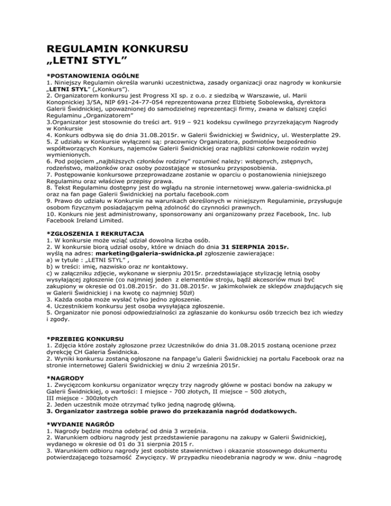 REGULAMIN KONKURSU „LETNI STYL” *POSTANOWIENIA OGÓLNE 1. Niniejszy Regulamin określa warunki uczestnictwa, zasady organizacji oraz nagrody w konkursie „LETNI STYL” („Konkurs”). 2. Organizatorem konkursu jest Progress XI sp. z o.o. z siedzibą w Warszawie, ul. Marii Konopnickiej 3/5A, NIP 691-24-77-054 reprezentowana przez Elżbietę Sobolewską, dyrektora Galerii Świdnickiej, upoważnionej do samodzielnej reprezentacji firmy, zwana w dalszej części Regulaminu „Organizatorem” 3.Organizator jest stosownie do treści art. 919 – 921 kodeksu cywilnego przyrzekającym Nagrody w Konkursie 4. Konkurs odbywa się do dnia 31.08.2015r. w Galerii Świdnickiej w Świdnicy, ul. Westerplatte 29. 5. Z udziału w Konkursie wyłączeni są: pracownicy Organizatora, podmiotów bezpośrednio współtworzących Konkurs, najemców Galerii Świdnickiej oraz najbliżsi członkowie rodzin wyżej wymienionych. 6. Pod pojęciem „najbliższych członków rodziny” rozumieć należy: wstępnych, zstępnych, rodzeństwo, małżonków oraz osoby pozostające w stosunku przysposobienia. 7. Postępowanie konkursowe przeprowadzane zostanie w oparciu o postanowienia niniejszego Regulaminu oraz właściwe przepisy prawa. 8. Tekst Regulaminu dostępny jest do wglądu na stronie internetowej www.galeria-swidnicka.pl oraz na fan page Galerii Świdnickiej na portalu facebook.com 9. Prawo do udziału w Konkursie na warunkach określonych w niniejszym Regulaminie, przysługuje osobom fizycznym posiadającym pełną zdolność do czynności prawnych. 10. Konkurs nie jest administrowany, sponsorowany ani organizowany przez Facebook, Inc. lub Facebook Ireland Limited. *ZGŁOSZENIA I REKRUTACJA 1. W konkursie może wziąć udział dowolna liczba osób. 2. W konkursie biorą udział osoby, które w dniach do dnia 31 SIERPNIA 2015r. wyślą na adres: [email protected] zgłoszenie zawierające: a) w tytule : „LETNI STYL” , b) w treści: imię, nazwisko oraz nr kontaktowy. c) w załączniku zdjęcie, wykonane w sierpniu 2015r. przedstawiające stylizację letnią osoby wysyłającej zgłoszenie (co najmniej jeden z elementów stroju, bądź akcesoriów musi być zakupiony w okresie od 01.08.2015r. do 31.08.2015r. w jakimkolwiek ze sklepów znajdujących się w Galerii Świdnickiej i na kwotę co najmniej 50zł) 3. Każda osoba może wysłać tylko jedno zgłoszenie. 4. Uczestnikiem konkursu jest osoba wysyłająca zgłoszenie. 5. Organizator nie ponosi odpowiedzialności za zgłaszanie do konkursu osób trzecich bez ich wiedzy i zgody. *PRZEBIEG KONKURSU 1. Zdjęcia które zostały zgłoszone przez Uczestników do dnia 31.08.2015 zostaną ocenione przez dyrekcję CH Galeria Świdnicka. 2. Wyniki konkursu zostaną ogłoszone na fanpage’u Galerii Świdnickiej na portalu Facebook oraz na stronie internetowej Galerii Świdnickiej w dniu 2 września 2015r. *NAGRODY 1. Zwycięzcom konkursu organizator wręczy trzy nagrody główne w postaci bonów na zakupy w Galerii Świdnickiej, o wartości: I miejsce - 700 złotych, II miejsce – 500 złotych, III miejsce - 300złotych 2. Jeden uczestnik może otrzymać tylko jedną nagrodę główną. 3. Organizator zastrzega sobie prawo do przekazania nagród dodatkowych. *WYDANIE NAGRÓD 1. Nagrody będzie można odebrać od dnia 3 września. 2. Warunkiem odbioru nagrody jest przedstawienie paragonu na zakupy w Galerii Świdnickiej, wydanego w okresie od 01 do 31 sierpnia 2015 r. 3. Warunkiem odbioru nagrody jest osobiste stawiennictwo i okazanie stosownego dokumentu potwierdzającego tożsamość Zwycięzcy. W przypadku nieodebrania nagrody w ww. dniu –nagrodę będzie można odebrać w sekretariacie Galerii Świdnickiej przy ulicy Westerplatte 29 w Świdnicy do dnia 30 września 2015r. W przypadku nieodebrania nagrody do dnia 30 września 2015r.-nagroda przepada na rzecz organizatora. 4. Zwycięzcy nie mogą domagać się wymiany nagrody na inną nagrodę rzeczową lub na stanowiące jej ekwiwalent świadczenie pieniężne. 5. Nagrody w ramach niniejszego Konkursu, zostaną przekazane Zwycięzcom zgodnie z przepisami ustawy z dnia 26 lipca 1991 r. o podatku dochodowym od osób fizycznych (j. t.: Dz.U. z 1993r. Nr 90, poz. 416 z późn. zm.). *POSTĘPOWANIE REKLAMACYJNE 1. Każdemu Uczestnikowi Konkursu przysługuje prawo wniesienia pisemnej reklamacji nie później jednak niż do dnia 15.10.2015roku. Reklamacje wniesione po upływie powyższego terminu nie będą rozpatrywane. 2. Reklamacje mogą być zgłaszane tylko i wyłącznie na piśmie do siedziby Organizatora się pod adresem: C.H. Galeria Świdnicka, ul. Westerplatte 29, 58-100 Świdnica. 3. Reklamacje zgłoszone drogą ustną, pocztą elektroniczną itp. nie będą rozpatrywane. 4. Reklamacja winna zawierać dokładne dane reklamującego, przyczynę reklamacji oraz żądanie jakiego domaga się reklamujący. 5. Osoba wnosząca reklamację zostanie powiadomiona o rozstrzygnięciu Komisji za pomocą listu poleconego najpóźniej w terminie 21 dni od daty otrzymania reklamacji. 6. Decyzja w sprawie reklamacji jest ostateczna i nie przysługuje od niej odwołanie. *DANE OSOBOWE 1. Każdy Uczestnik biorący udział w konkursie wyraża zgodę na przetwarzanie jego danych osobowych na zasadach określonych poniżej. 2. Zgłoszone w trakcie Konkursu dane osobowe Uczestników przetwarzane mogą być przez Organizatora wyłącznie dla potrzeb niniejszego Konkursu. 3. Uczestnik Konkursu ma prawo dostępu do treści swoich danych oraz ich poprawiania. 4. Administratorem danych osobowych jest Organizator. 5. Udział w Konkursie jest równoznaczny ze zgodą Uczestnika na publikację wizerunku, oraz zdjęcia konkursowego Uczestnika na stronie internetowej Galerii Świdnickiej oraz na jej fan page’u na portalu facebook. POSTANOWIENIA KOŃCOWE 1. Organizator zastrzega sobie prawo do zmiany postanowień niniejszego Regulaminu w dowolnym momencie. Organizator ma obowiązek poinformowania o zmianach uczestników Konkursu. 2.