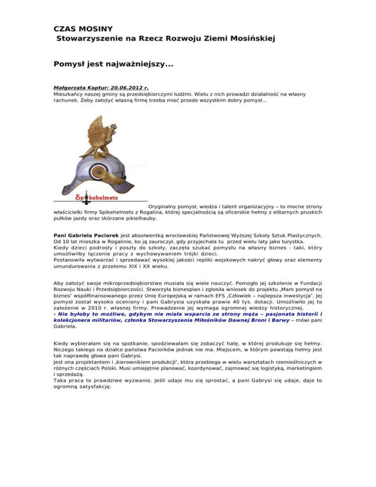 CZAS MOSINY Stowarzyszenie na Rzecz Rozwoju Ziemi Mosińskiej Pomysł jest najważniejszy... Małgorzata Kaptur: 20.06.2012 r. Mieszkańcy naszej gminy są przedsiębiorczymi ludźmi. Wielu z nich prowadzi działalność na własny rachunek. Żeby założyć własną firmę trzeba mieć przede wszystkim dobry pomysł... Oryginalny pomysł, wiedza i talent organizacyjny – to mocne strony właścicielki firmy Spikehelmets z Rogalina, której specjalnością są oficerskie hełmy z elitarnych pruskich pułków jazdy oraz skórzane pikielhauby. Pani Gabriela Paciorek jest absolwentką wrocławskiej Państwowej Wyższej Szkoły Sztuk Plastycznych. Od 10 lat mieszka w Rogalinie, bo ją zauroczył, gdy przyjechała tu przed wielu laty jako turystka. Kiedy dzieci podrosły i poszły do szkoły, zaczęła szukać pomysłu na własny biznes - taki, który umożliwiłby łączenie pracy z wychowywaniem trójki dzieci. Postanowiła wytwarzać i sprzedawać wysokiej jakości repliki wojskowych nakryć głowy oraz elementy umundurowania z przełomu XIX i XX wieku. Aby założyć swoje mikroprzedsiębiorstwo musiała się wiele nauczyć. Pomogło jej szkolenie w Fundacji Rozwoju Nauki i Przedsiębiorczości. Stworzyła biznesplan i zgłosiła wniosek do projektu „Mam pomysł na biznes” współfinansowanego przez Unię Europejską w ramach EFS „Człowiek – najlepsza inwestycja”. Jej pomysł został wysoko oceniony i pani Gabrysia uzyskała prawie 40 tys. dotacji. Umożliwiło jej to założenie w 2010 r. własnej firmy. Prowadzenie jej wymaga ogromnej wiedzy historycznej. - Nie byłoby to możliwe, gdybym nie miała wsparcia ze strony męża – pasjonata historii i kolekcjonera militariów, członka Stowarzyszenia Miłośników Dawnej Broni i Barwy – mówi pani Gabriela. Kiedy wybierałam się na spotkanie, spodziewałam się zobaczyć halę, w której produkuje się hełmy. Niczego takiego na działce państwa Paciorków jednak nie ma. Miejscem, w którym powstają hełmy jest tak naprawdę głowa pani Gabrysi. Jest ona projektantem i „kierownikiem produkcji”, która przebiega w wielu warsztatach rzemieślniczych w różnych częściach Polski. Musi umiejętnie planować, koordynować, zajmować się logistyką, marketingiem i sprzedażą. Taka praca to prawdziwe wyzwanie. Jeśli udaje mu się sprostać, a pani Gabrysi się udaje, daje to ogromną satysfakcję. - Nasza oferta adresowana jest do członków grup rekonstrukcji historycznej, miłośników militariów, kolekcjonerów, teatrów i producentów filmowych – mówi pani Paciorek. Klientami są przede wszystkim Niemcy, Polacy, Francuzi, ale nasze produkty wysyłamy również do USA, Japonii, czy Australii. Zazwyczaj są to pojedyncze egzemplarze, często kolekcjonerzy zamawiają u nas brakujące elementy oryginalnych hełmów. Na rynki europejskie trafiają podobne hełmy z Indii, ale jest to seryjna produkcja. Różnica w jakości jest znacząca. My przywiązujemy wagę do każdego detalu. Koneserzy potrafią to docenić. Nie martwi mnie więc konkurencja, lecz to, że jest coraz mniej rzemieślników potrafiących wykonać po mistrzowsku potrzebne nam elementy. Pani Gabriela pasjonuje się fotografią. Nie tylko robi zdjęcia swoich pickelhaub, ale fotografuje też Rogalin. Opracowała serię artystycznych widokówek. Ostatnio sporo maluje. W salonie można podziwiać ikony napisane przez panią domu. Jest zadowolona, bo robi to, co zapewnia jej satysfakcjonujący dochód, a przy tym sprawia przyjemność i wymusza osobisty rozwój. Planuje doskonalić znajomość języków obcych, bo to ułatwi jej kontakty z zagranicznymi klientami. spikehelmets.eu/ Zdjęcia: G. Paciorek www.e-samorzadowiec.pl 2010 RegioGroup Sp. z o.o.