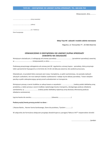 TOYS RC – ODSTĄPIENIE OD UMOWY KUPNA SPRZEDAŻY, TEL. 660-636-763 Miejscowość, dnia………….. ……………………………………………..(imię nazwisko) ……………………………………………..(adres) ……………………………………………..(nr. Telefonu) Dane kupującego Sklep Toys RC- zabawki i modele zdalnie sterowane Regulice, ul. Tenczyńska 77 , 32-566 Alwernia OŚWIADCZENIE O ODSTĄPIENIU OD UMOWY KUPNA SPRZEDAŻY ZAWARTEJ NA ODLEGŁOŚĆ Niniejszym oświadczam, iż odstępuję od umowy sprzedaży ……………………………… (przedmiot sprzedaży) zawartej w …………………………………… (miejscowość), w dniu ……………………… Podstawą powyższego odstąpienia od umowy jest §9 regulaminu umowy kupna - sprzedaży, który przyznaje takie uprawnienie Kupującemu w terminie do 14 dni od daty jej zawarcia, bez podania przyczyny. Oświadczam, że produkt który zwracam jest nowy i kompletny, w pełni wartościowy, nie posiada żadnych ukrytych uszkodzeń, nie nosi żadnych śladów użytkowania i nadaje się do dalszej sprzedaży. Towar odsyłam paczką w pełni zabezpieczającą sprzęt przed uszkodzeniem w transporcie. Niniejszym proszę o zwrot środków za zakup towaru o wysokości : …………………….. (należy podać dokładną cenę produktu), a także proszę o zwrot środków najtańszego kosztu transportu, dostępnego podczas składania zamówienia, tj: …………………………. (należy podać dokładną najtańszą cenę dostawy oferowaną podczas składania zamówienia). Łączna kwota do zwrotu:……………………………………….. (słownie:…………………………) Podaną wyżej kwotę proszę przelać na dane : ( Nazwa Banku , Numer konta bankowego, Dane do przelewu, Tytułem :………….) W załączniku do formularza dołączam przypięty dowód kupna tj: paragon/ faktura VAT* niepotrzebne skreślić ………………………………………(podpis