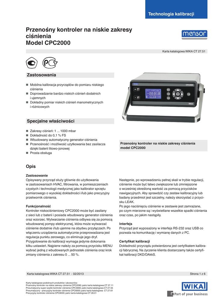 Technologia kalibracji Przenośny kontroler na niskie zakresy ciśnienia Model CPC2000 Karta katalogowa WIKA CT 27.51 Zastosowania ■■ Mobilna kalibracja przyrządów do pomiaru niskiego ciśnienia ■■ Doprowadzanie bardzo niskich ciśnień dodatnich i ujemnych ■■ Dokładny pomiar niskich ciśnień manometrycznych i różnicowych Specjalne właściwości ■■ Zakresy ciśnień: 1 ... 1000 mbar ■■ Dokładność do 0,1 % FS ■■ Wbudowany automatyczny generator ciśnienia ■■ Przenośność i możliwość użytkowania bez zasilacza dzięki baterii litowo-jonowej ■■ Prosta obsługa Przenośny kontroler na niskie zakresy ciśnienia model CPC2000 Opis Zastosowanie Opisywany przyrząd służy głównie do użytkowania w zastosowaniach HVAC, filtrowania, w pomieszczeniach czystych i technologii medycznej jako kalibrator sprzętu pomiarowego o wysokiej dokładności i/lub jako precyzyjny przetwornik ciśnienia. Funkcjonalność Kontroler niskociśnieniowy CPC2000 może być zasilany z sieci lub z baterii i posiada wbudowany generator ciśnienia oraz wzorzec. Wytwarzanie ciśnienia odbywa się za pomocą wbudowanej pompy elektrycznej, która może wytwarzać ciśnienie dodatnie i/lub ujemne na obydwu przyłączach. Po włączeniu urządzenia automatycznie przeprowadzana jest regulacja punktu zerowego, co eliminuje jego dryf. Przygotowanie do kalibracji wymaga jedynie dokonania kilku ustawień. Najpierw należy za pomocą przycisku MENU wybrać jedną z wbudowanych jednostek ciśnienia oraz krok zmiany ciśnienia z zakresu 0 ... 50 %. Karta katalogowa WIKA CT 27.51 ∙ 02/2013 Karty katalogowe podobnych produktów i akcesoriów: Przenośny kontroler na niskie zakresy ciśnienia CPC2090; patrz karta katalogowa CT 27.11 Pneumatyczny super szybki kontroler ciśnienia CPC3000; patrz karta katalogowa CT 27.55 Pneumatyczny - precyzyjny kontroler ciśnienia CPC6000; patrz karta katalogowa CT 27.61 Precyzyjny kontroler ciśnienia CPC8000; patrz karta katalogowa CT 28.01 Następnie, po wprowadzeniu pełnej skali w trybie regulacji, ciśnienie może być łatwo zwiększone lub zmniejszone o wcześniej określoną wartość za pomocą przycisków nawigacyjnych. Aby sprawdzić czy zestaw kalibracyjny lub badany przedmiot jest szczelny, należy skorzystać z przycisku LEAK. Po jego naciśnięciu ciśnienie w zestawie jest zamrażane, po czym mierzone są i wyświetlane wszelkie spadki ciśnienia oraz czas, po jakim nastąpiły. Interfejs Przyrząd jest wyposażony w interfejs RS-232 oraz USB co pozwala na komunikację i wymianę danych z PC. Certyfikat kalibracji Dokładność przyrządu potwierdzona jest certyfikatem kalibracji fabrycznej. Na życzenie klienta dostarczamy także certyfikat kalibracji DKD/DAkkS. Strona 1 z 6 Specyfikacje Model CPC2000 Czujniki wzorcowego ciśnienia Zakres ciśnienia mbar 1 10 50 100 500 1000 Dokładność % FS 0,3 0,1 0,1 0,1 0,1 0,1 Typ ciśnienia Ciśnienie manometryczne dodatnie lub ujemne lub ciśnienie różnicowe Jednostki ciśnienia Pa, kPa, hPa, bar, mbar, psi, inH2O, inHg, mmHg, Torr Przyrząd podstawowy Przyrząd Wersja przyrządu Przyrząd warsztatowy z rączką do przenoszenia Wymiary 102,6 x 257 x 271 mm bez rączki Masa 4,6 kg Stopień ochrony IP 20 Wytwarzanie ciśnienia Wewnętrzne, pompa elektryczna Wyświetlacz Ekran Podświetlany wyświetlacz graficzny, wieloliniowy Rozdzielczość 5 (4 cyfry dla zakresu pomiarowego 50/500 mbar) Klawiatura Klawiatura membranowa Języki menu Niemiecki, angielski, hiszpański i francuski Podłączenia Przyłącza ciśnieniowe 6,6 x 11 (średnica przewodu D = 6 mm) Części zanurzane Ni, Al, CuBe, PU Źródło zasilania Zasilanie DC 24 V, 1 A Pobór mocy 24 VA Typ baterii Litowo-jonowa Czas działania baterii ok. 8 h Dopuszczalne warunki otoczenia Medium Powietrze atmosferyczne Temperatura robocza 10 ... 40 °C Temperatura przechowywania -10 ... +70 °C Wilgotność względna 30 ... 80 %, wzgl. (bez kondensacji) Parametry regulacji Krok regulacji 0 ... 50 % (ustawialny) lub 100 % Prędkość regulacji Ok. 5 s (w zależności od pojemności) Komunikacja Interfejs RS-232 i USB Czas reakcji 1 wartość/s Regulacja punktu zerowego Automatyczna (w zdefiniowanych odstępach czasowych) Ręczna (przycisk ZERO) Strona 2 z 6 Karta katalogowa WIKA CT 27.51 ∙ 02/2013 Zgodność CE, aprobaty i certyfikaty Zgodność CE Dyrektywa EMC Aprobaty 2004/108/WE, EN 61000-6-3 emisje w środowiskach mieszkalnych, handlowych i lekko uprzemysłowionych oraz EN 61000-6-2 odporność na zakłócenia w środowiskach przemysłowych GOST Metrologia/technologia pomiarów, Rosja GOST-R Certyfikat importowy, Rosja Certyfikat Kalibracja 1) 1) Kalibracja w pozycji poziomej Standardowo: certyfikat kalibracji 3.1 zgodnie z EN 10204 Opcjonalnie: Certyfikat kalibracji DKD/DAkkS Aprobaty i certyfikaty znajdują się na stronie internetowej Podłączenia elektryczne z tyłu Widok z przodu Widok z boku Interfejs USB Interfejs RS-232 Przyłącze zasilania elektrycznego Karta katalogowa WIKA CT 27.51 ∙ 02/2013 Strona 3 z 6 Wyświetlacz i klawiatura 1.) Opis klawiatury 1 2 3 1) W trybie regulacji: rozpoczęcie testu szczelności, w innym przypadku brak funkcji 4 2) Podczas procesu regulacji - odpowietrzenie, w innym przypadku wybiera SETUP 9 5 3) Zwiększenie nastawy o x % 4) Ustawienie nastawy na 100% 5) Włącznik 6) Zmniejszenie nastawy o x % 7) Ustawienie nastawy na 0% 8 7 6 8) Regulacja punktu zerowego 9) Przyłącza ciśnieniowe 2.) Dostępne tryby i sposoby wyświetlania Pomiar Pełna skala Tryb roboczy Jednostka ciśnienia Mierzona wartość Status baterii W trybie pomiarowym ciśnienie na przyłączach ciśnieniowych jest mierzone z dużą precyzją. Kontrola Pełna skala Tryb roboczy Jednostka ciśnienia Mierzona wartość Status baterii Nastawa w % pełnej skali W trybie regulacji ciśnienie jest doprowadzane do przyłączy ciśnieniowych z dużą precyzją. Zmiana nastawy (o określoną wcześniej wartość) jest dokonywana przycis